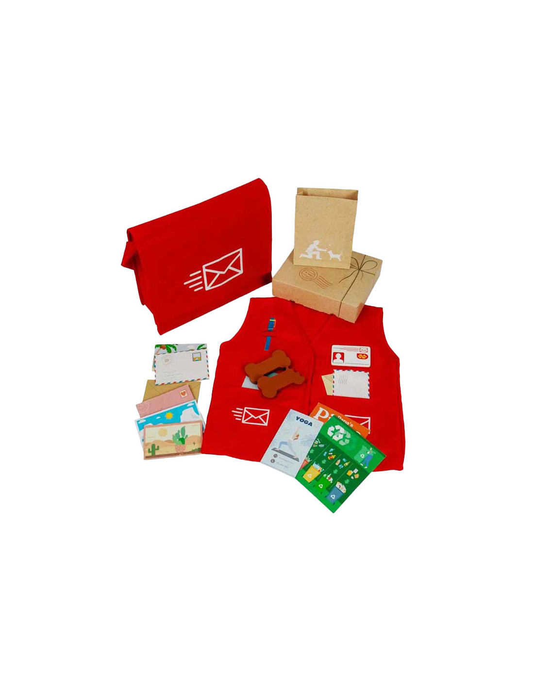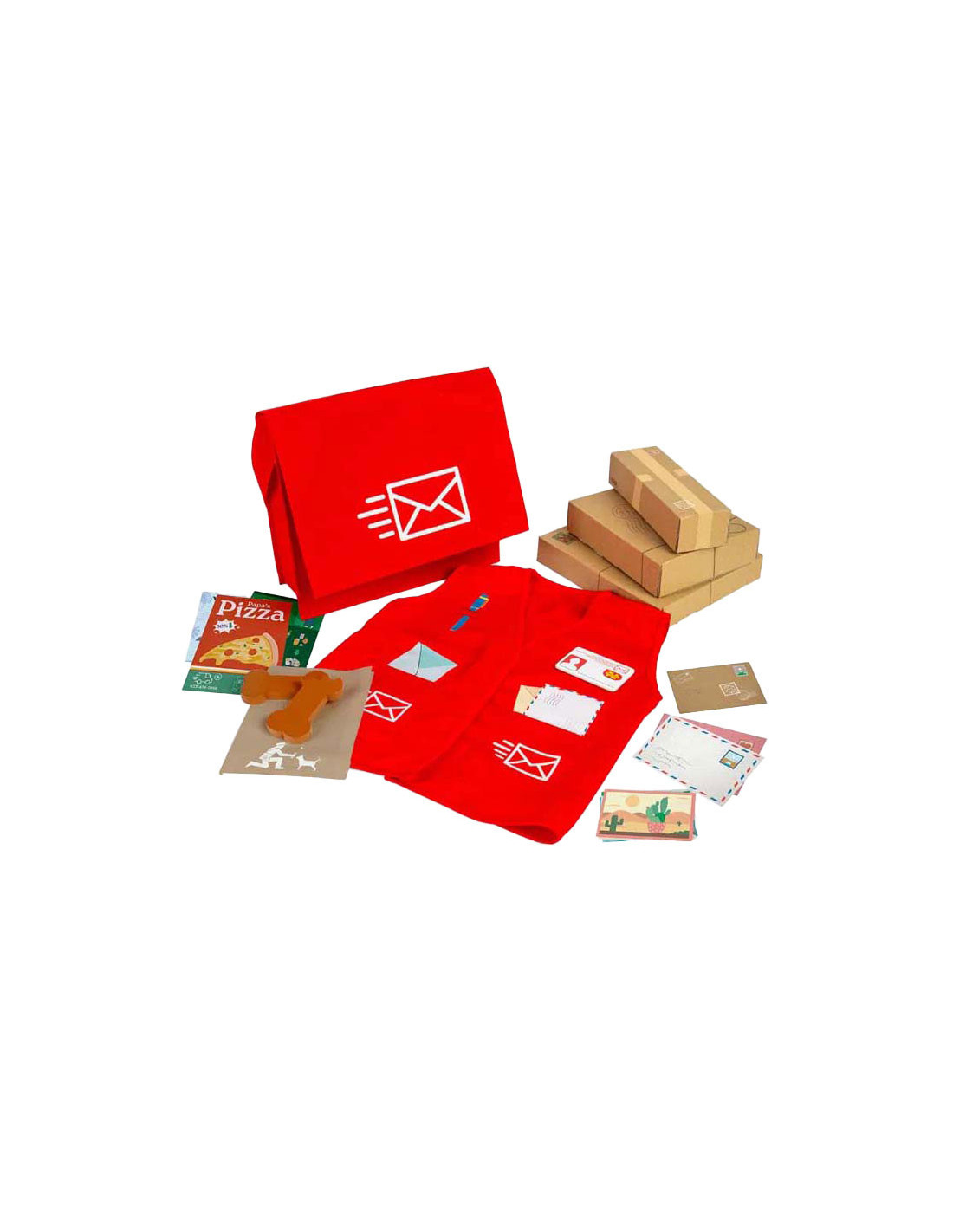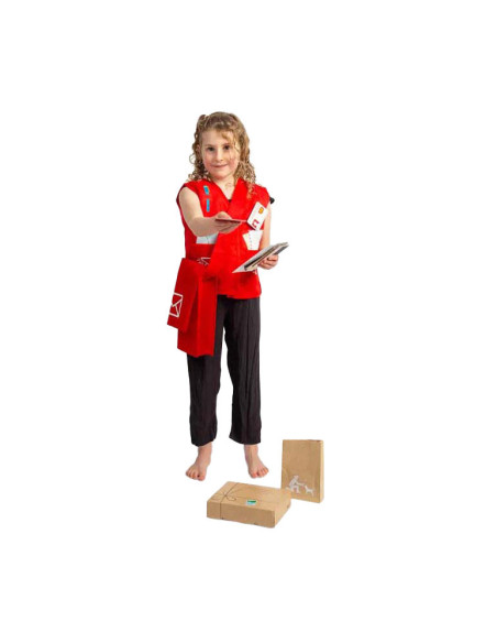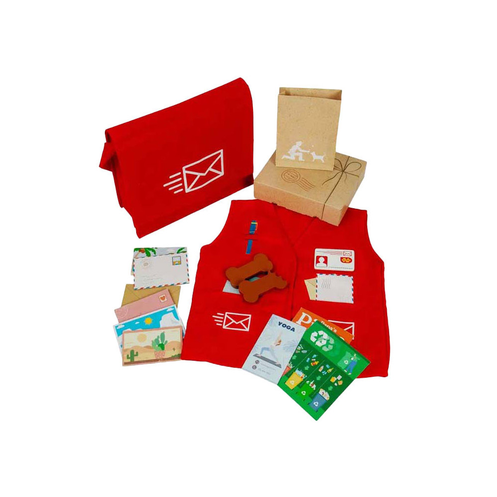 Deze leuke set is perfect voor jonge postbodes in spe! In deze verkleedset zit een rode postas, een vest, naambadge, pakketjes, brieven, ansichtkaarten, afhaalmenu's en zelfs hondensnoepjes voor alle lieve viervoeters die je tegenkomt!
