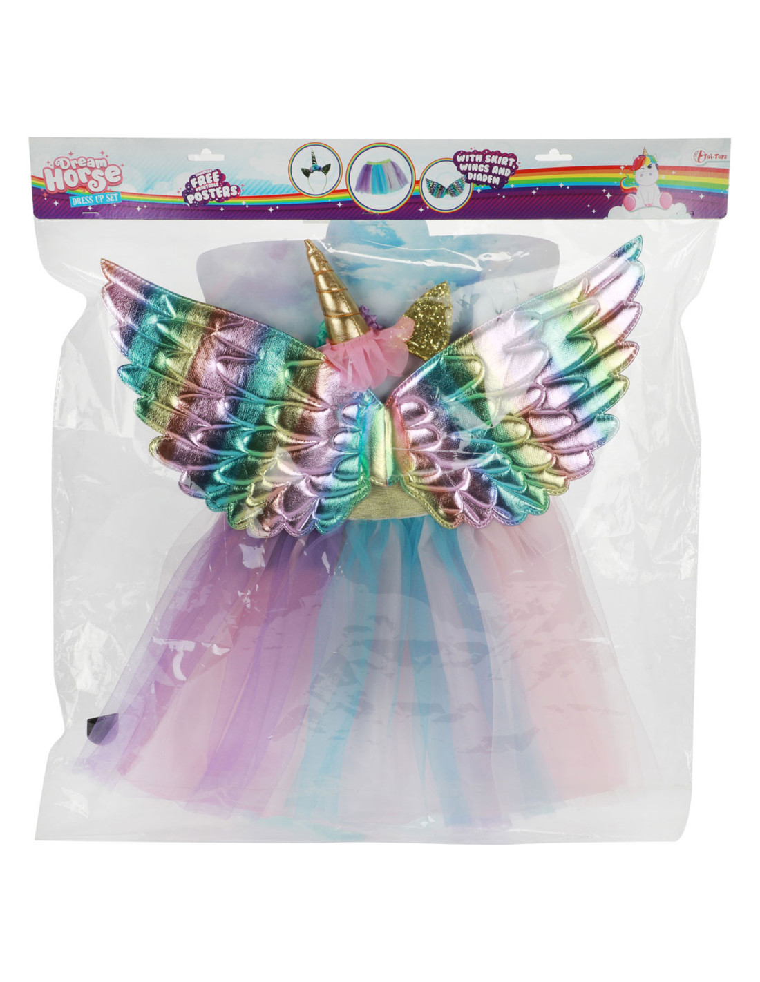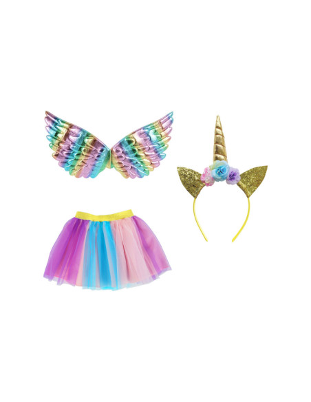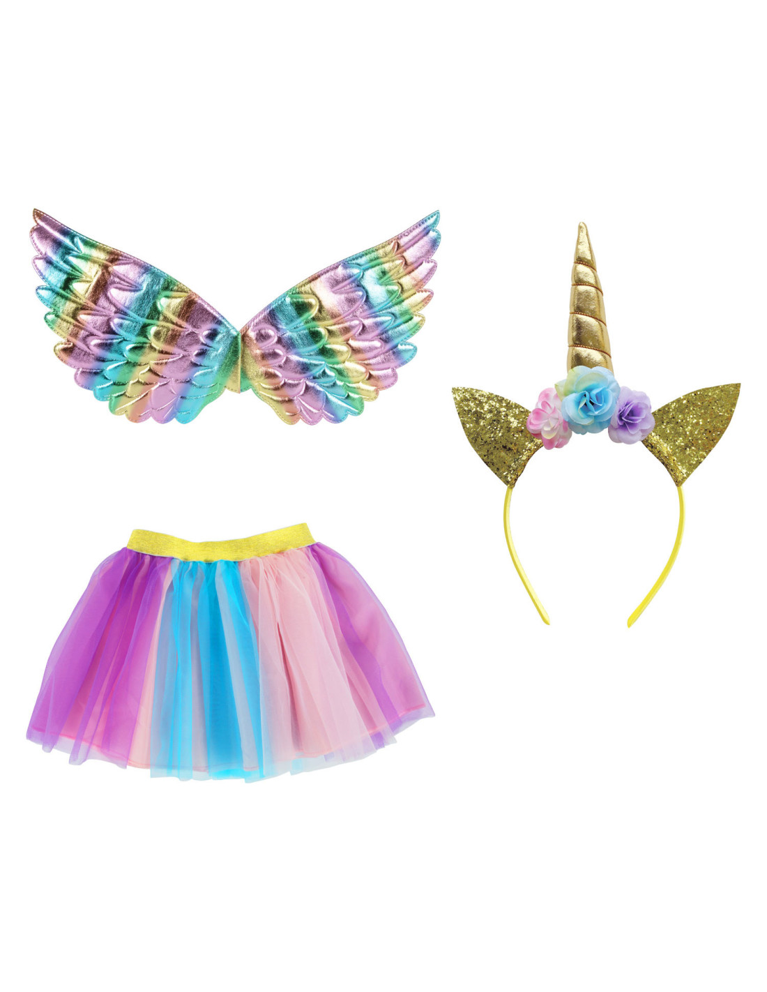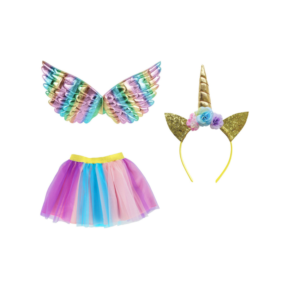 Eenhoorn verkleedset met een tulen rokje, een eenhoorn haarband en set glinsterende vleugels. Geschikt vanaf 3 jaar.