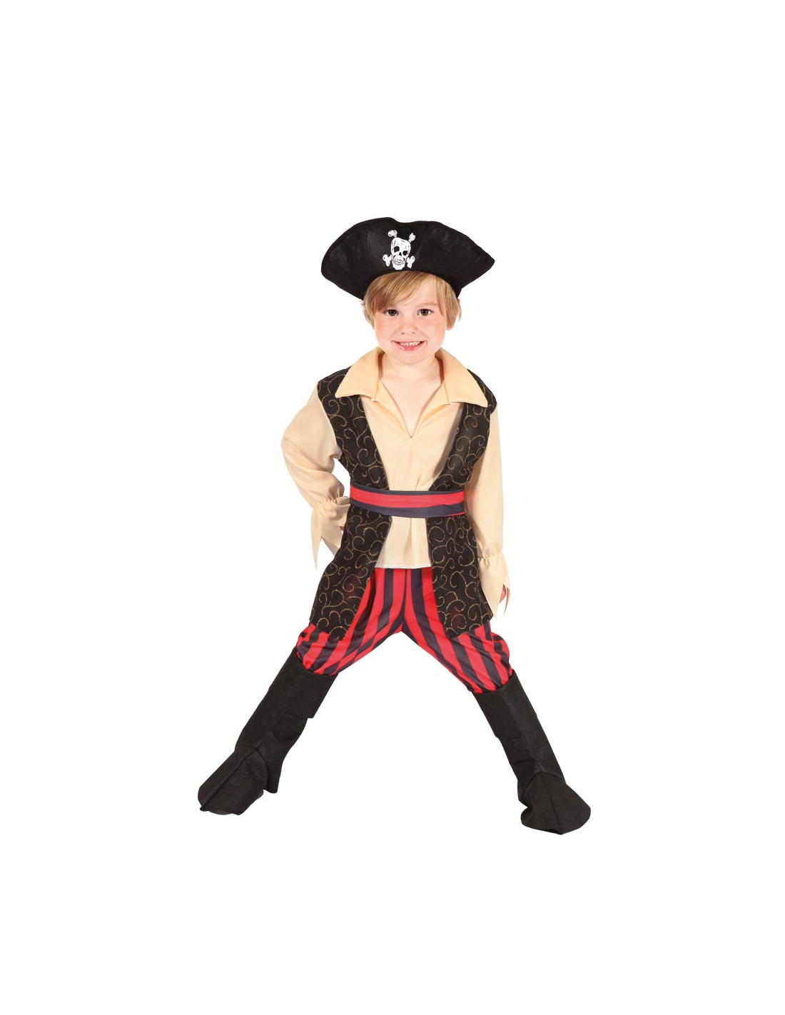 Verkleed je als een stoere piraat met deze complete set. Inhoud: hoed, shirt met vest, broek en beenkappen. Brandvertragend.