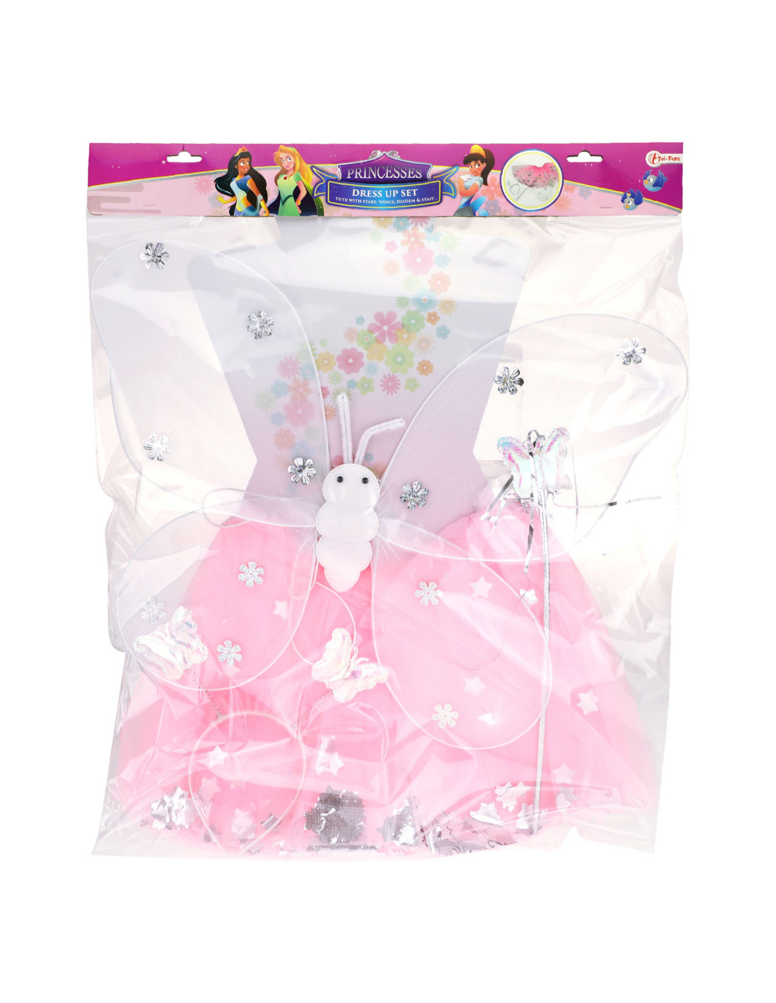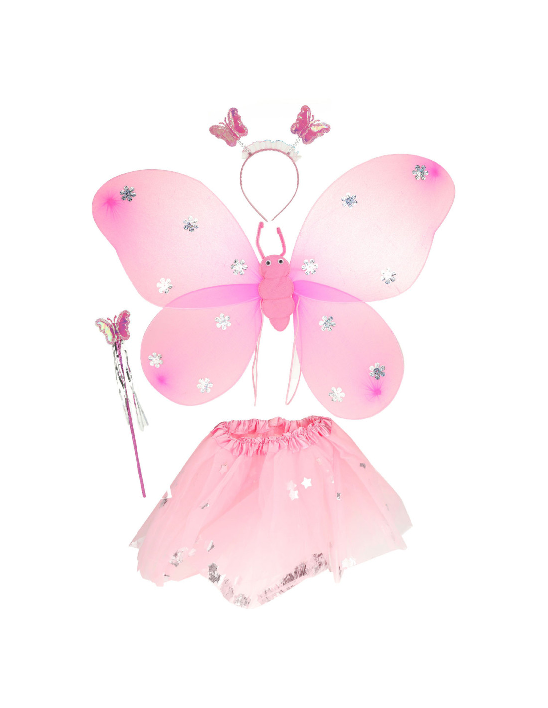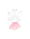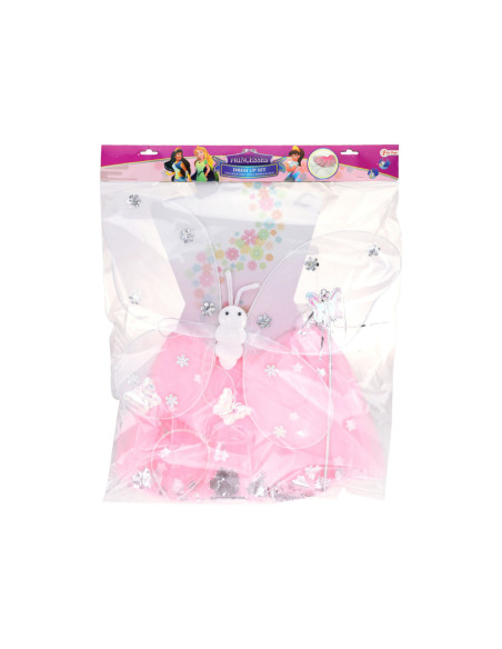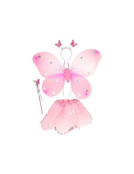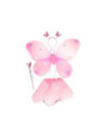 Vlinderfee verkleedset bestaande uit een tulen rokje, vleugels, een toverstaf en tiara met vlindertjes erop. Geschikt vanaf 3 jaar.