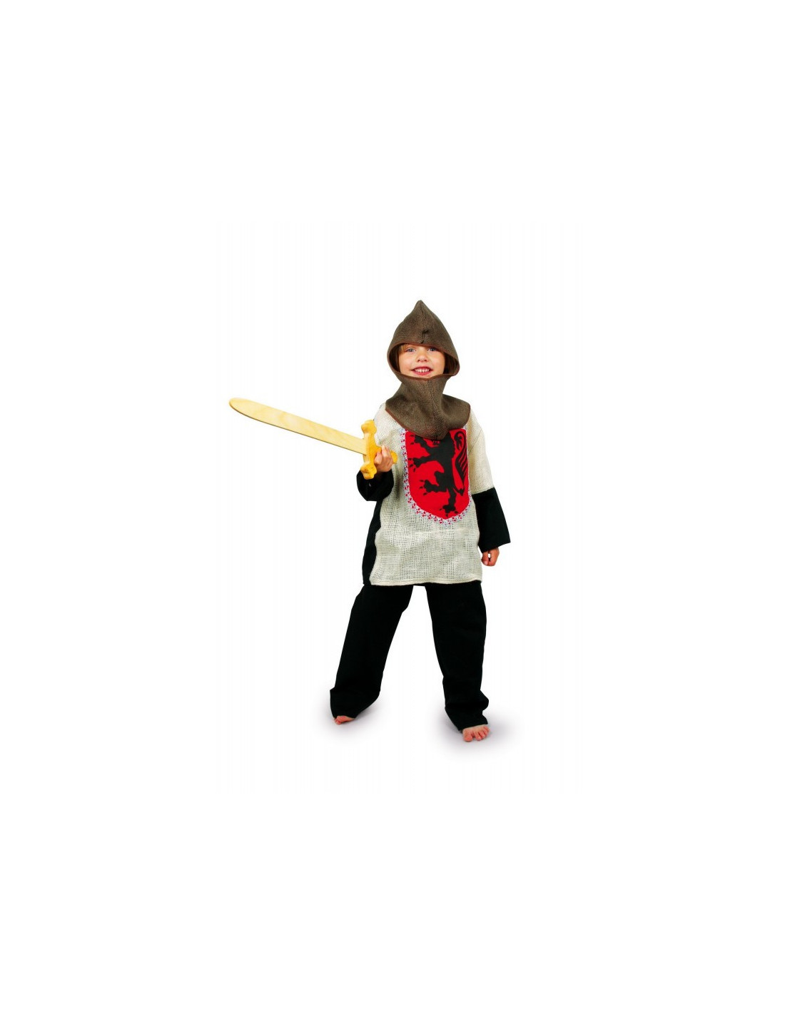 Ridder Arthur kostuum voor kinderen van 3 tot 5 jaar, wasbaar. Het kostuum maakt van ieder kind een held! Op de stoffen bovenkant is het wapens omzoomd met een band van pailletten. De set bevat ook een helm in gemaakt van een jute stof.