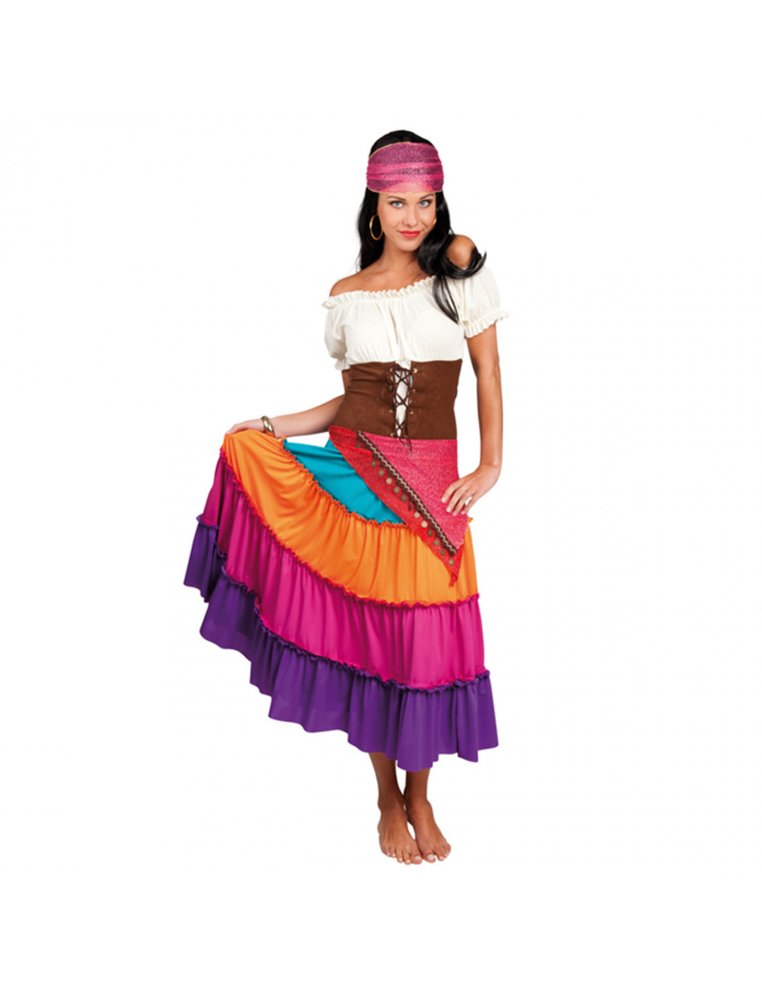 Volwassenkostuum elite zigeuner Nadya bestaande uit een bandana, jurk en ceintuur.