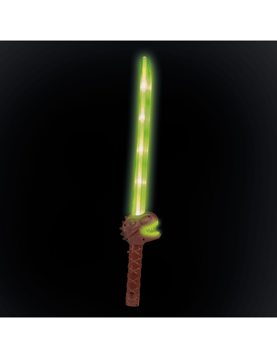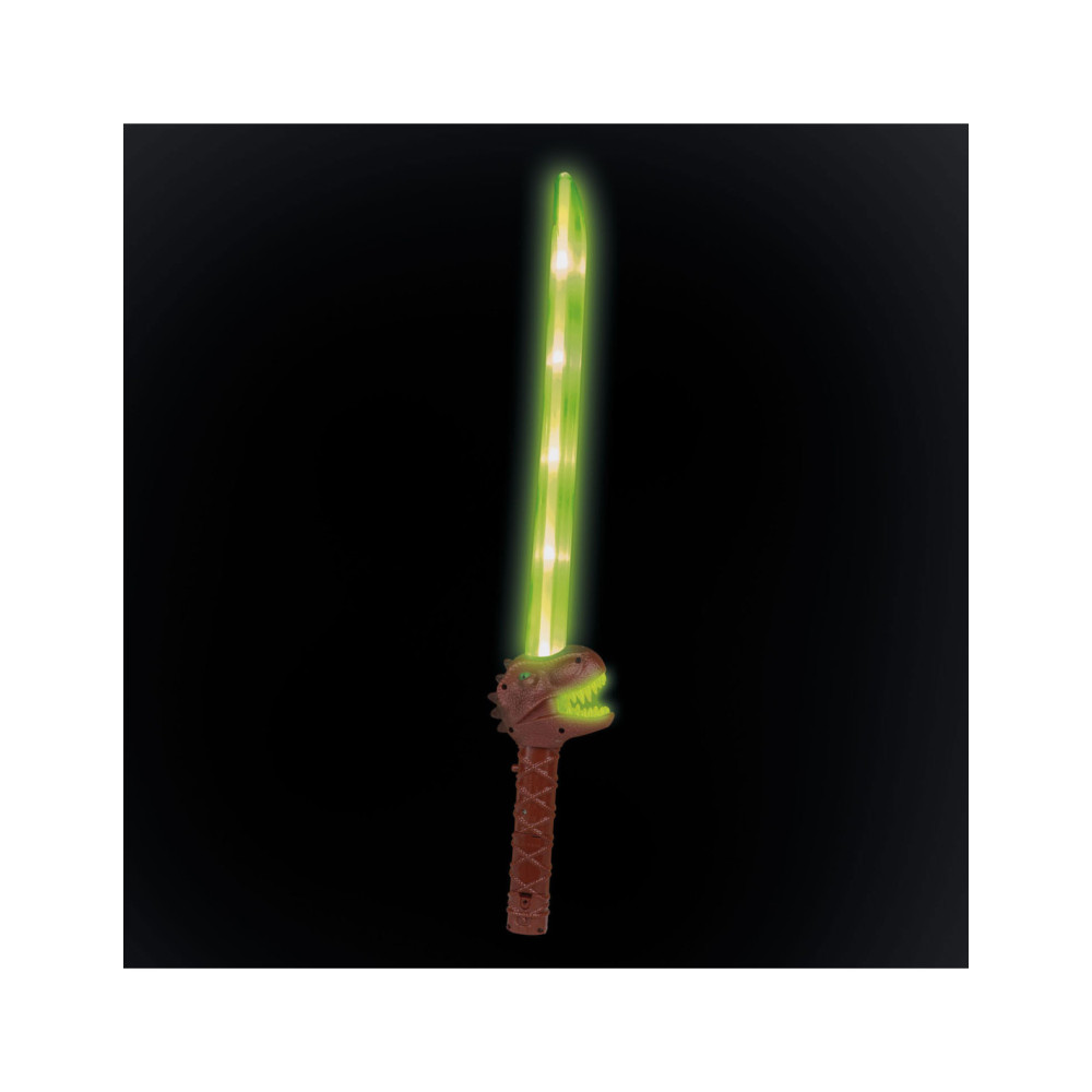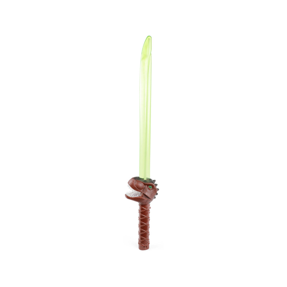 Dit dinosauruszwaard ziet er heel gevaarlijk uit en zo klinkt hij ook. Als je op de knop drukt klinkt er gebrul uit de bek van de T-rex, geven zijn tanden licht maar ook het zwaard zelf. Zeker weten dat je hiermee elke vijand verslaat.