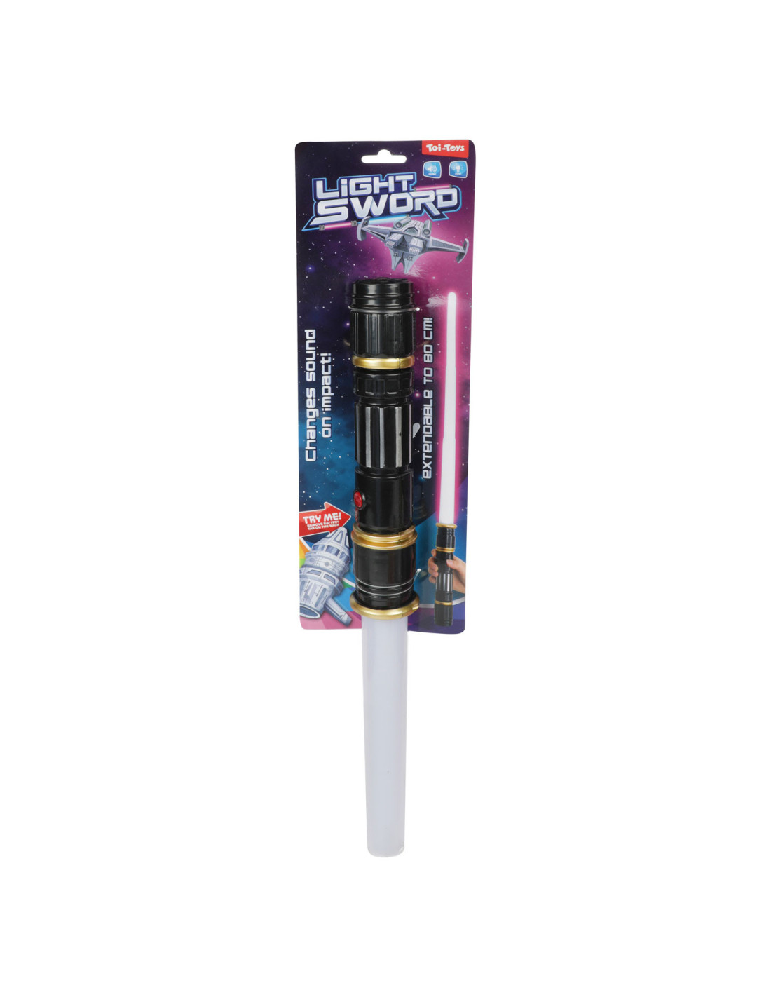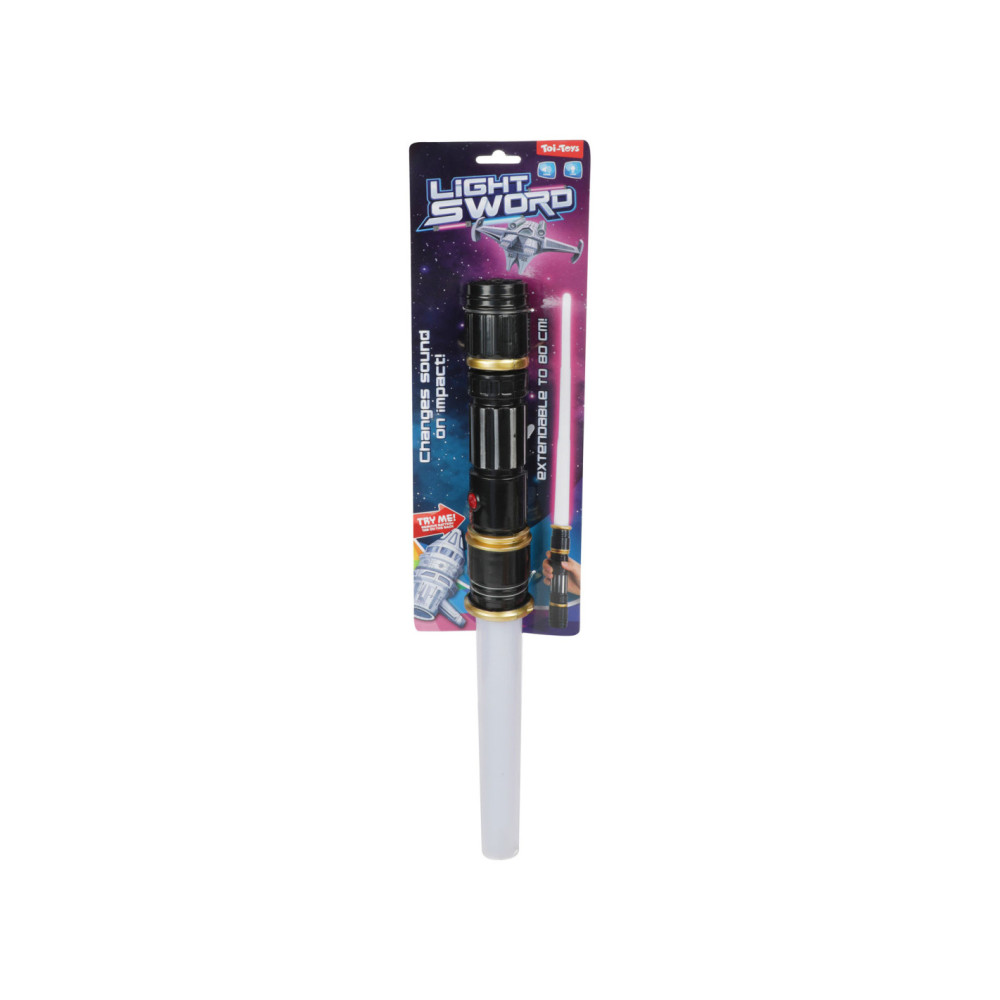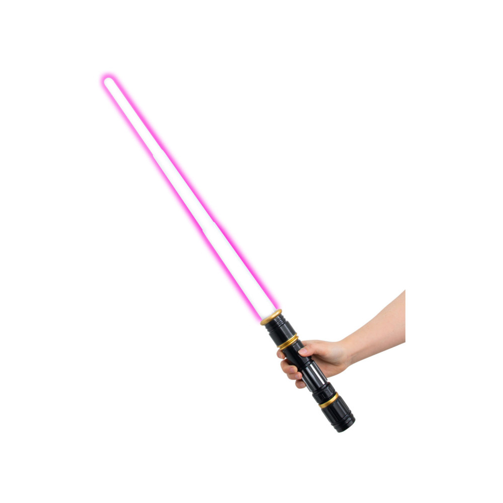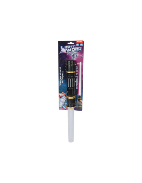Uitschuifbaar lichtzwaard met licht en geluid. Lengte: tot 80 cm. Inclusief 3 AAA-batterijen. Leeftijd: 3+