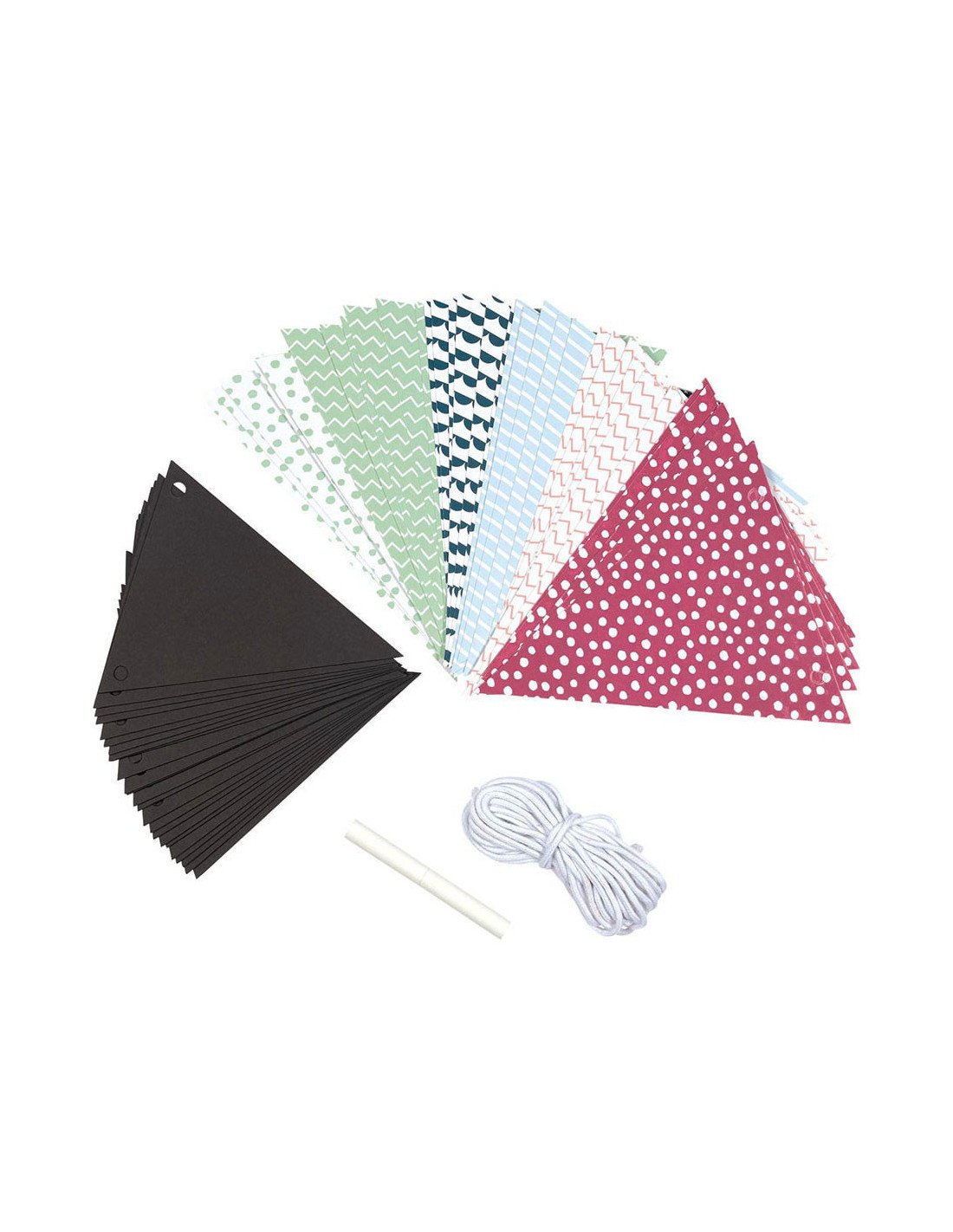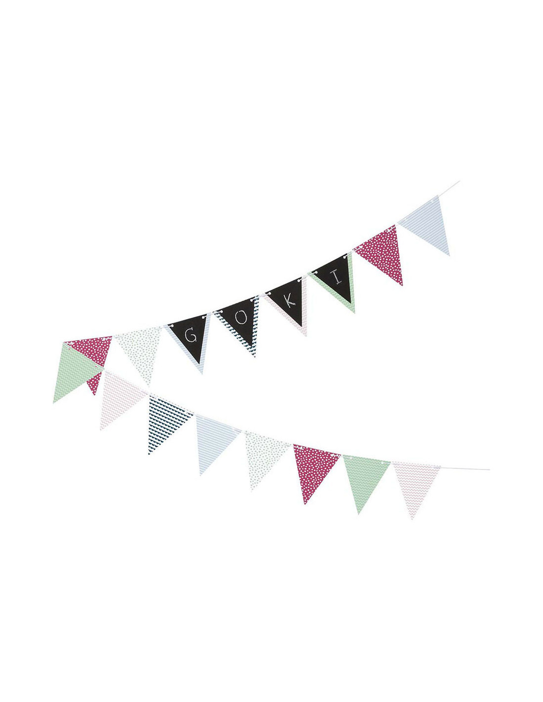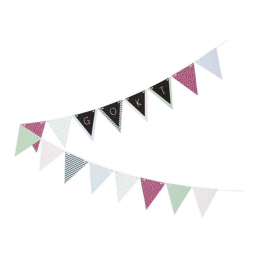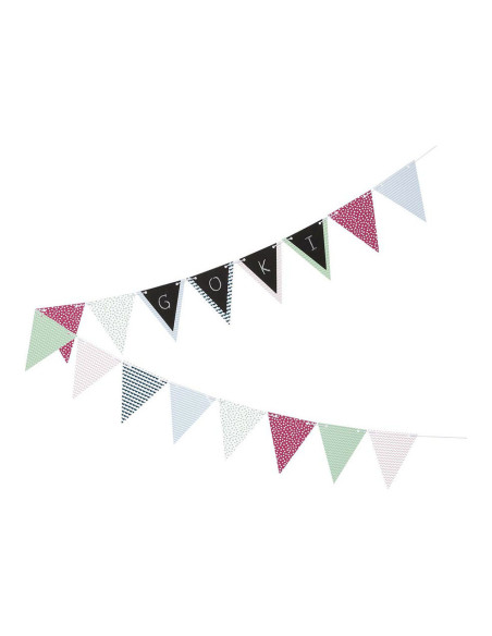 Goki vlaggenlijn met 63 losse vlaggetjes. Een deel heeft een vrolijk gekleurd printje en een deel heeft een krijtbordcoating om zelf te versieren met krijt. Totale lengte: 5 meter.