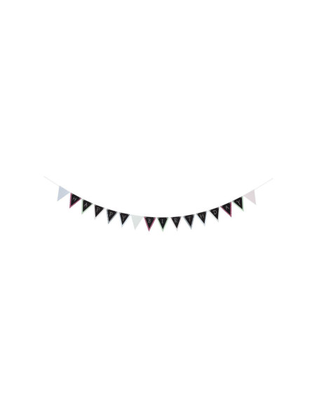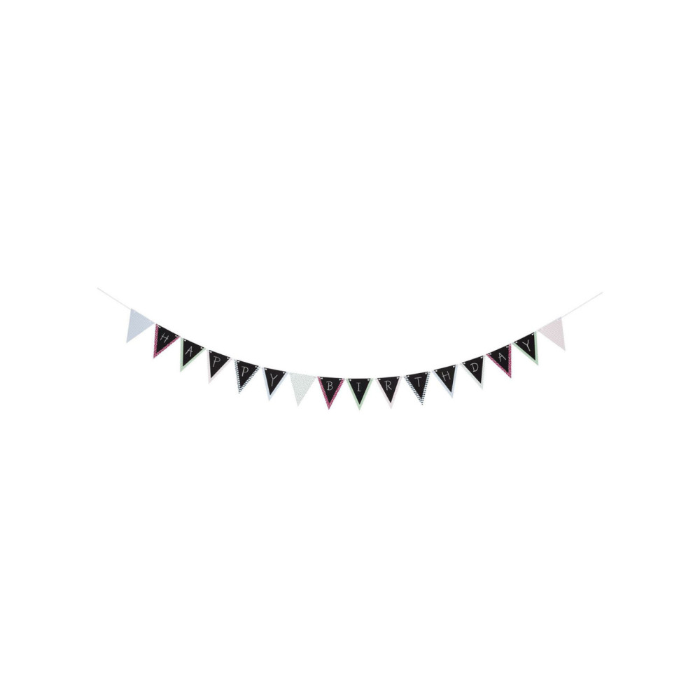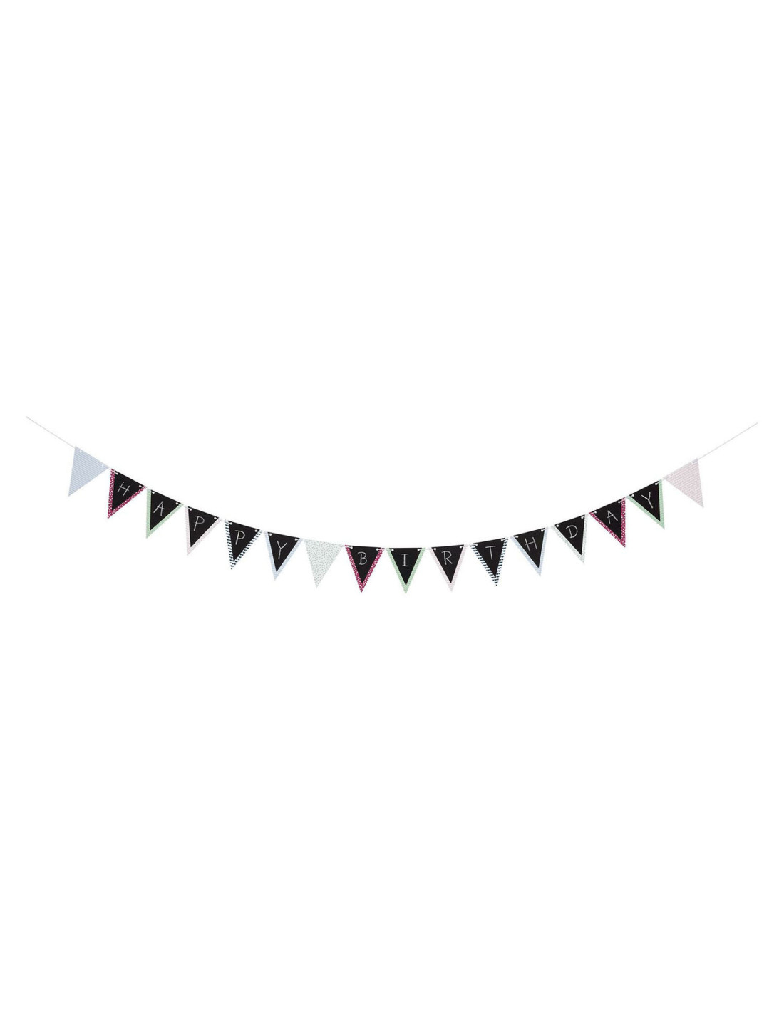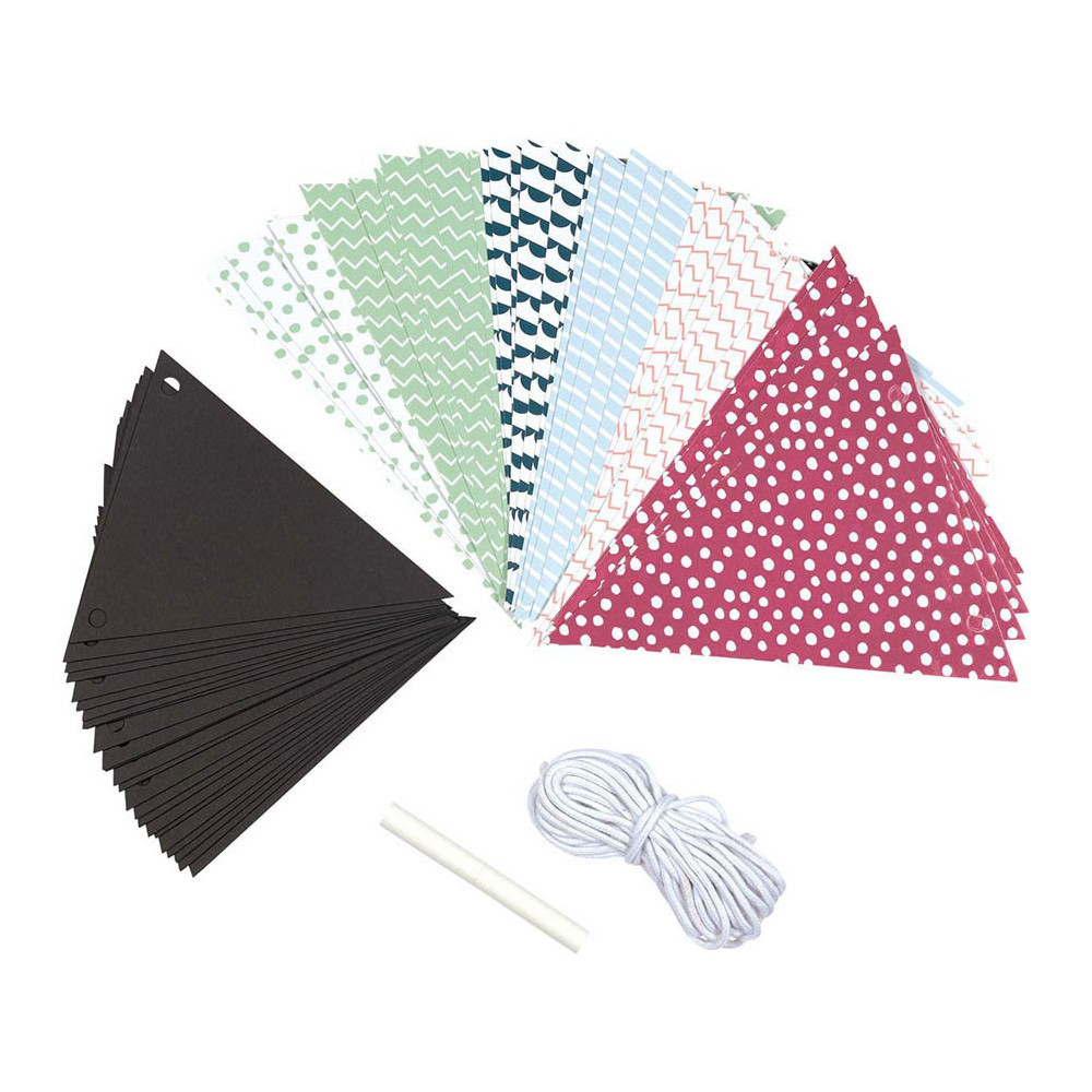 Goki vlaggenlijn met 63 losse vlaggetjes. Een deel heeft een vrolijk gekleurd printje en een deel heeft een krijtbordcoating om zelf te versieren met krijt. Totale lengte: 5 meter.