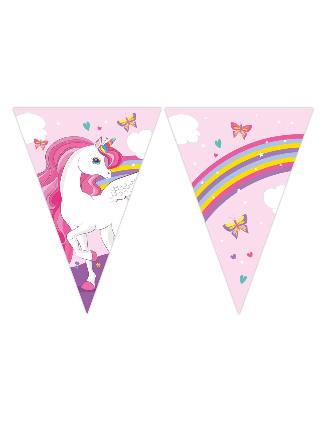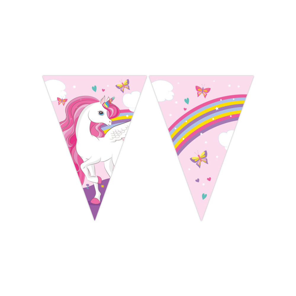 Roze eenhoornvlaggenlijn gemaakt van FSC-gecertificeerd papier. De vlaggenlijn is 3 meter lang. Geweldige decoratie voor een eenhoorn themafeestje of verjaardag van een fan!