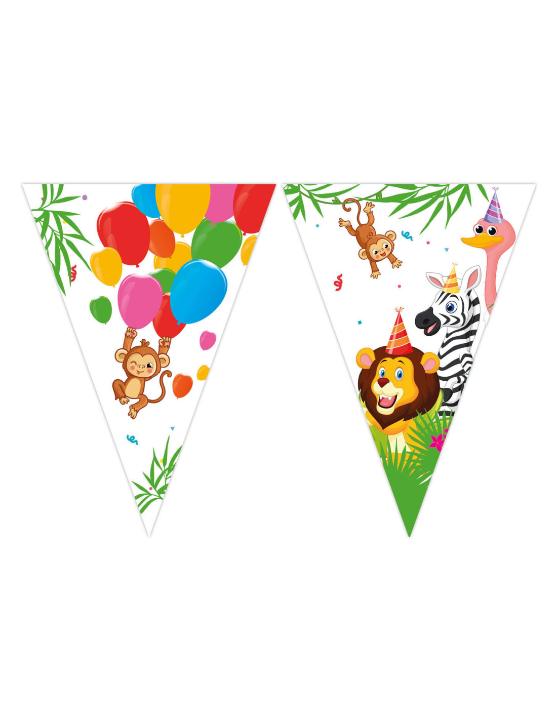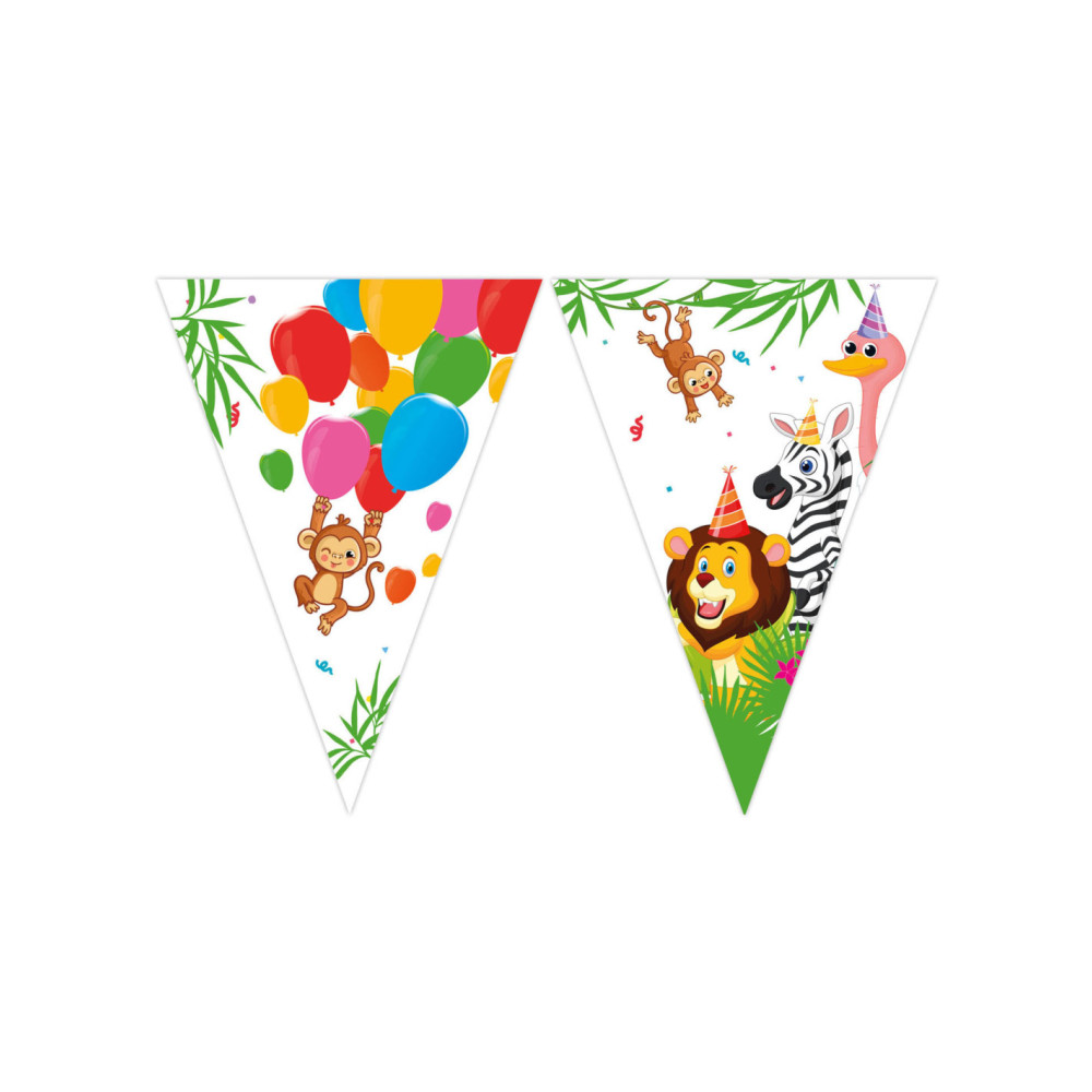Vrolijke vlaggenlijn in junglethema, gemaakt van FSC-gecertificeerd papier. De vlaggenlijn is 3 meter lang. Onmisbaar voor een junglefeestje of verjaardag van een dierenliefhebber!