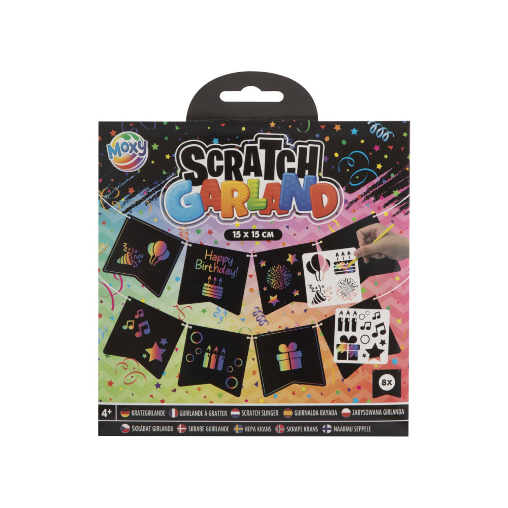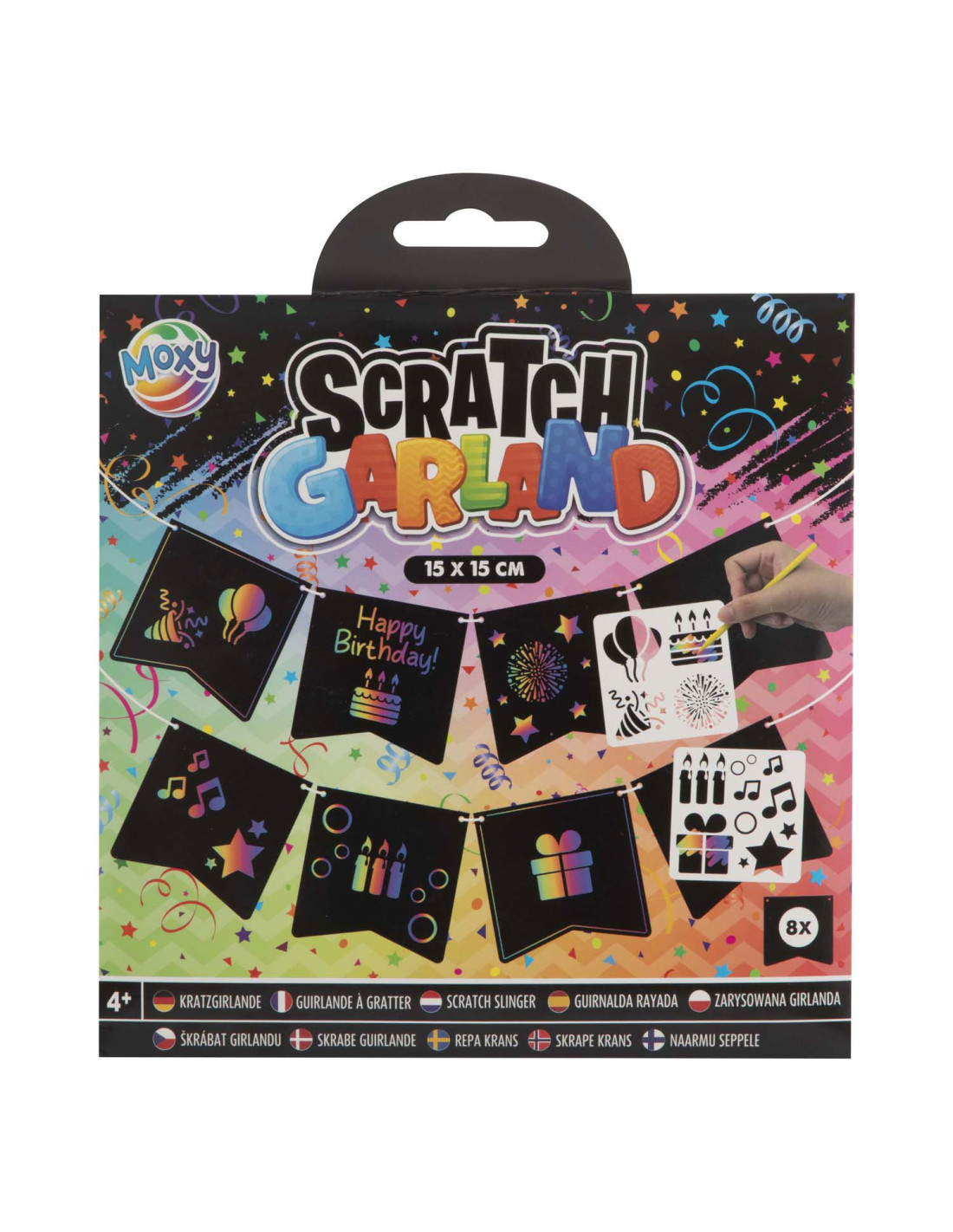 Vlaggenlijn met 8 zwarte scratch vlaggen van 15 x 15 cm groot. In de verpakking zitten 2 sjablonen waarmee vormen op de vlag gekrast kunnen worden. Geschikt voor kinderen vanaf 3 jaar.