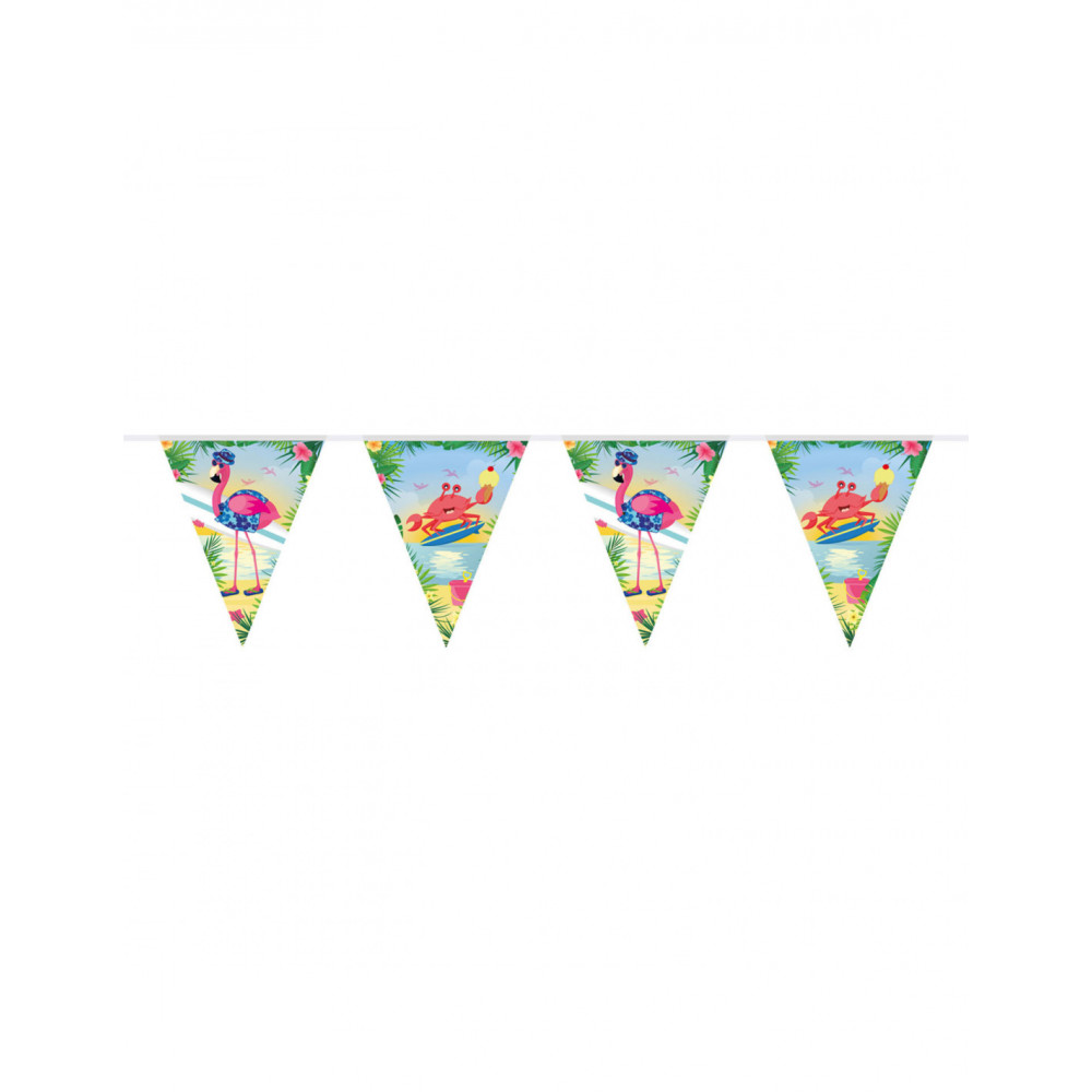 Maak je zomerse feest compleet met deze flamingo vlaggenlijn van wel 10 meter. Op de dubbelzijdig bedrukte vlaggetjes staan leuke afbeeldingen van een surfende krab en een zomers geklede flamingo met een surfbord onder zijn poot.