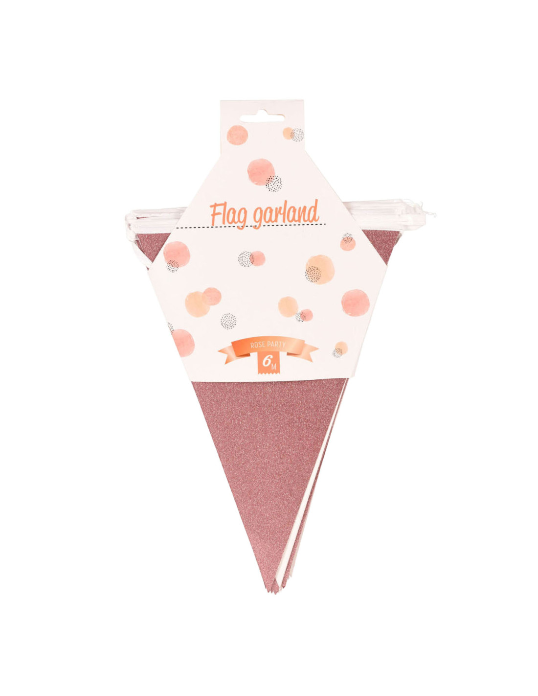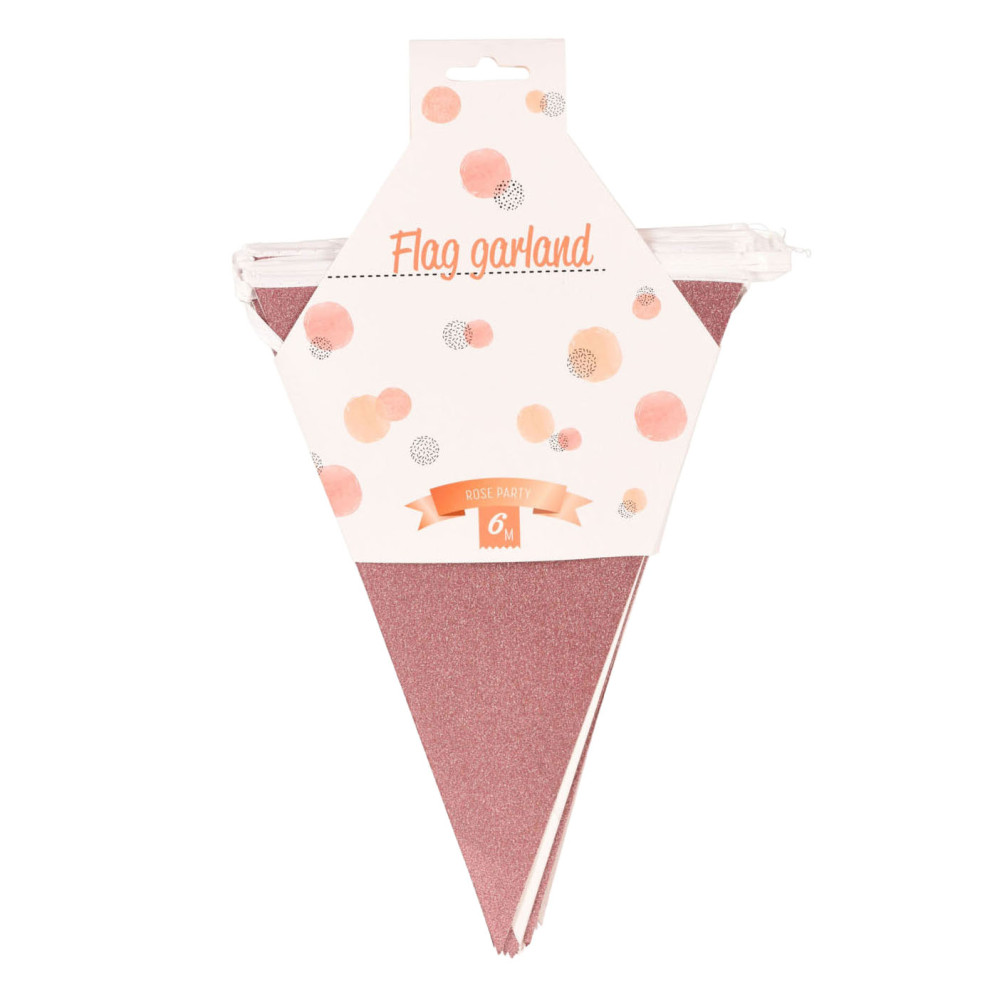 Vlaggenlijn van 6 meter lang, met daaraan 25 rosegouden, papieren vlaggetjes.