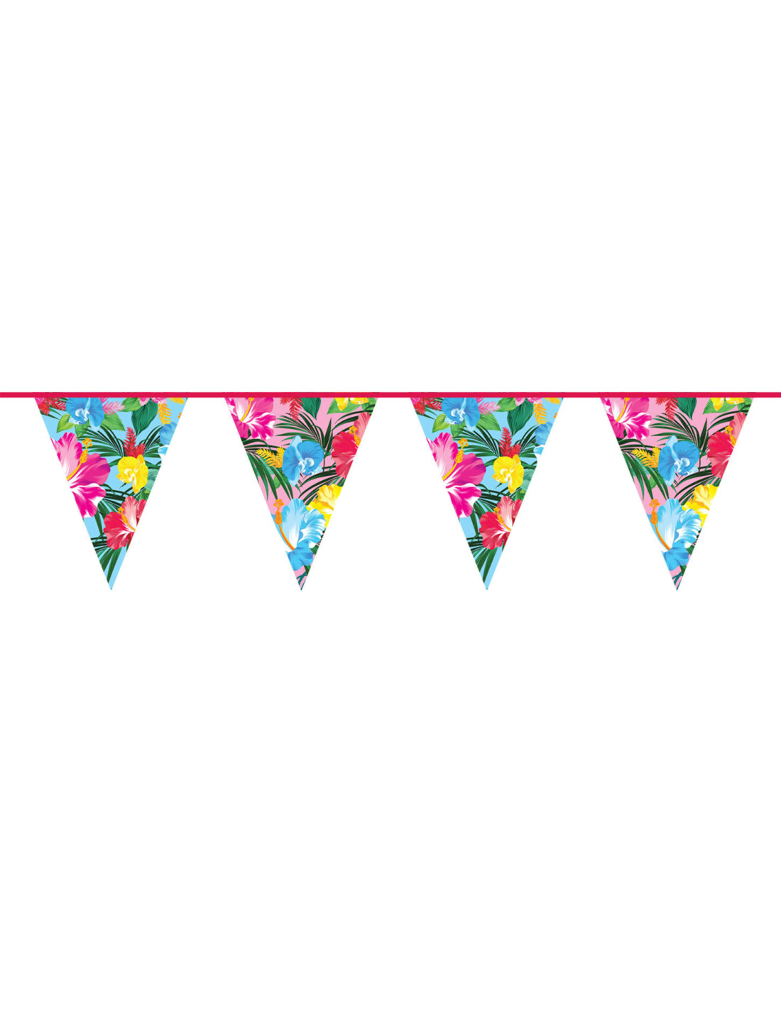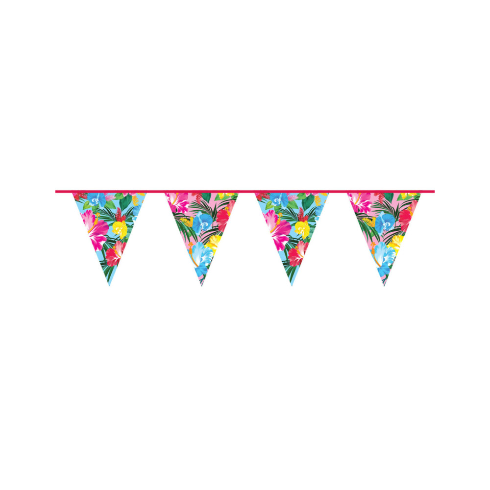 Je tropische feestje maak je helemaal compleet met deze kleurrijke tropical bloemen slinger. De vlaggenlijn is dubbelzijdig bedrukt en geeft een echt Hawaiiaans tintje doordat er op de vlaggen de bekende Hawaiiaanse bloem, de plumeria, is afgebeeld. De tropical bloemen slinger is 10 meter lang.
