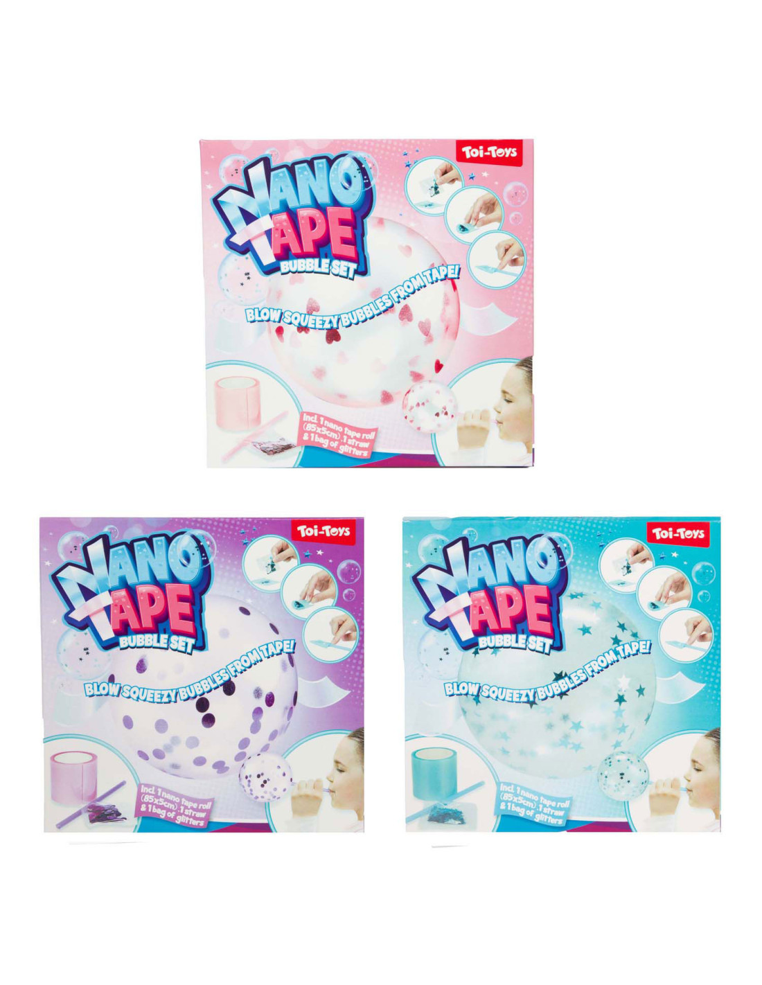 FUN Bellen Maken van Nanotape met Glitters. Inhoud: 1 rol nanotape, 1 rietje en 1 zakje glitters.