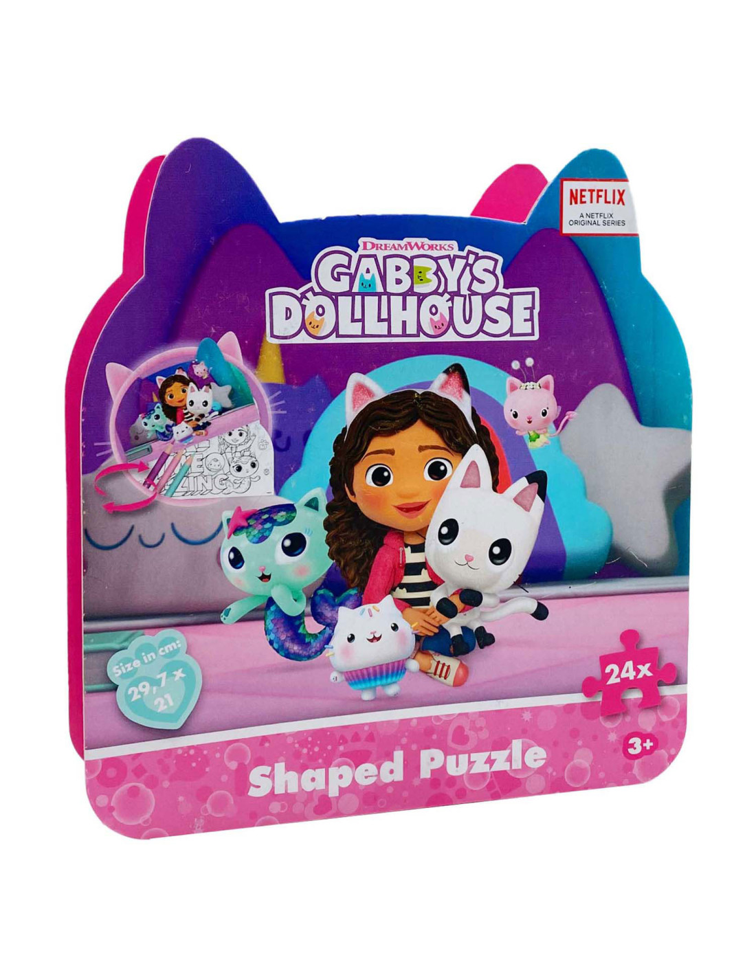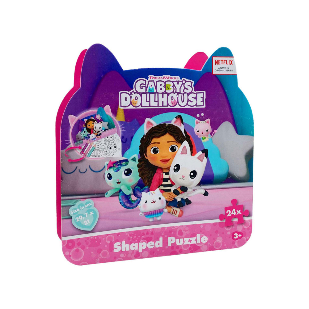 Gabby’s Dollhouse vormpuzzel met 24 stevige stukken in kattenvormige doos. Afmetingen puzzel: 29 x 21 cm. Geschikt voor kinderen vanaf 3 jaar.