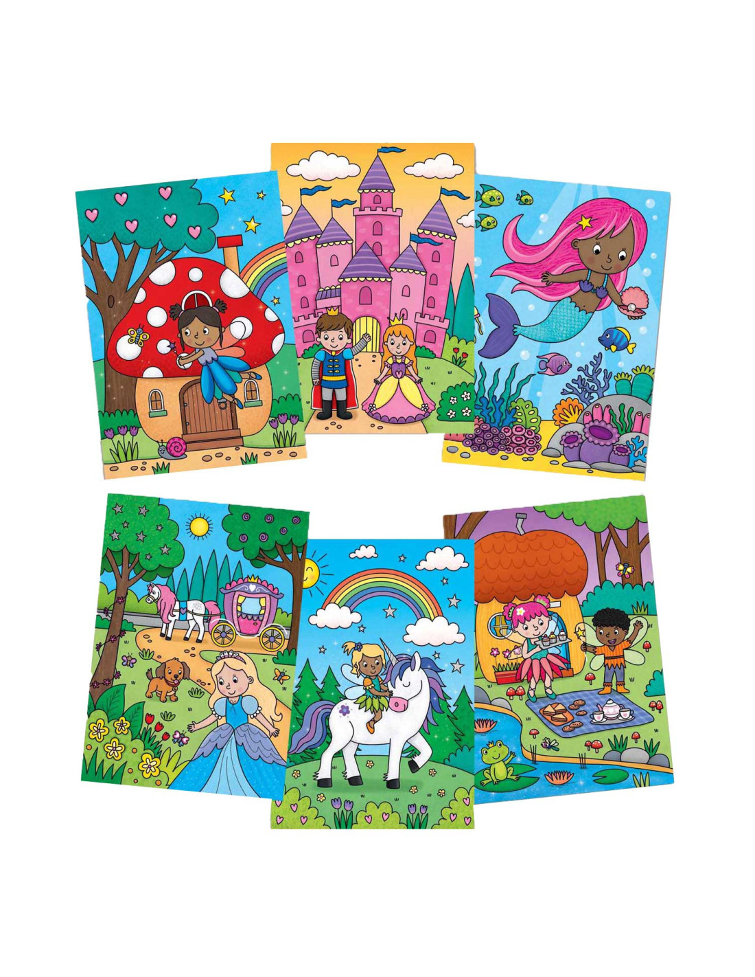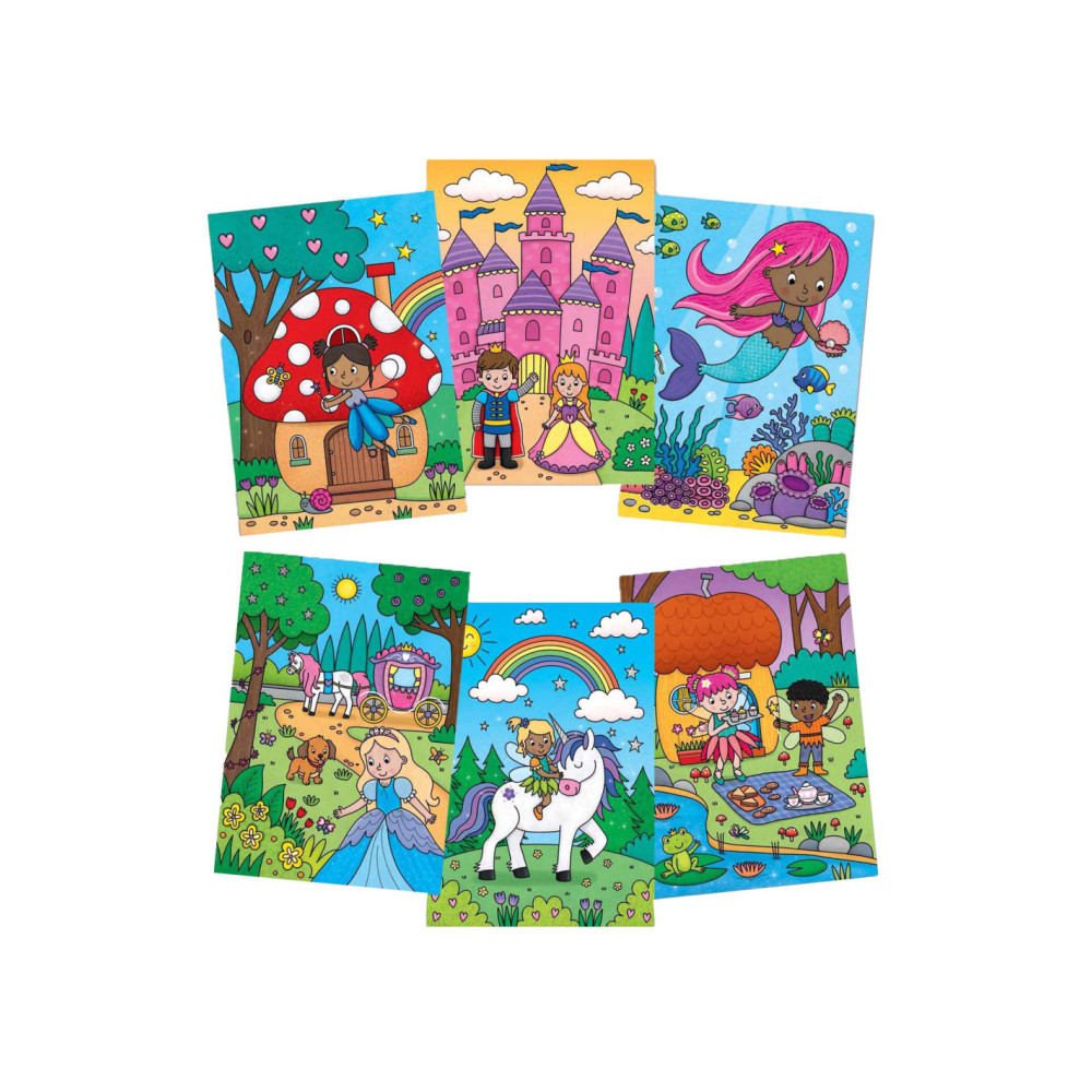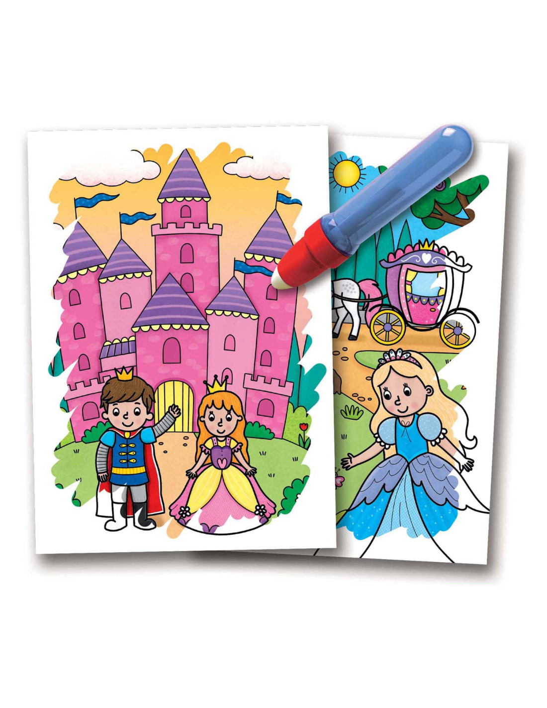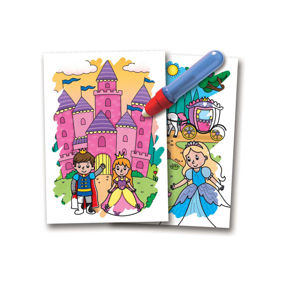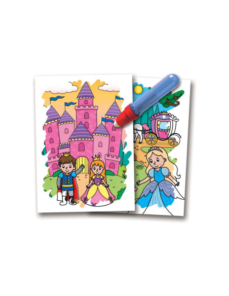 6 herbruikbare kleurplaten met een sprookjesthema om in te kleuren met de waterpen. Vul de pen met water en gebruik deze om de verborgen afbeeldingen te onthullen. Kleuren verschijnen op magische wijze keer op keer. Ideaal voor onderweg. Afmetingen van de pagina's: 21 x 15 cm.
