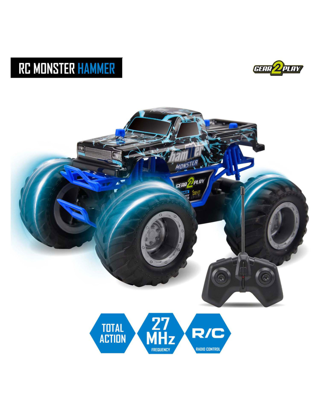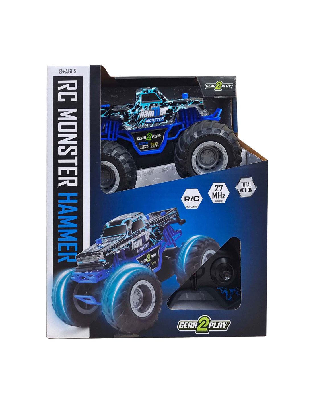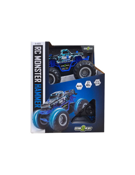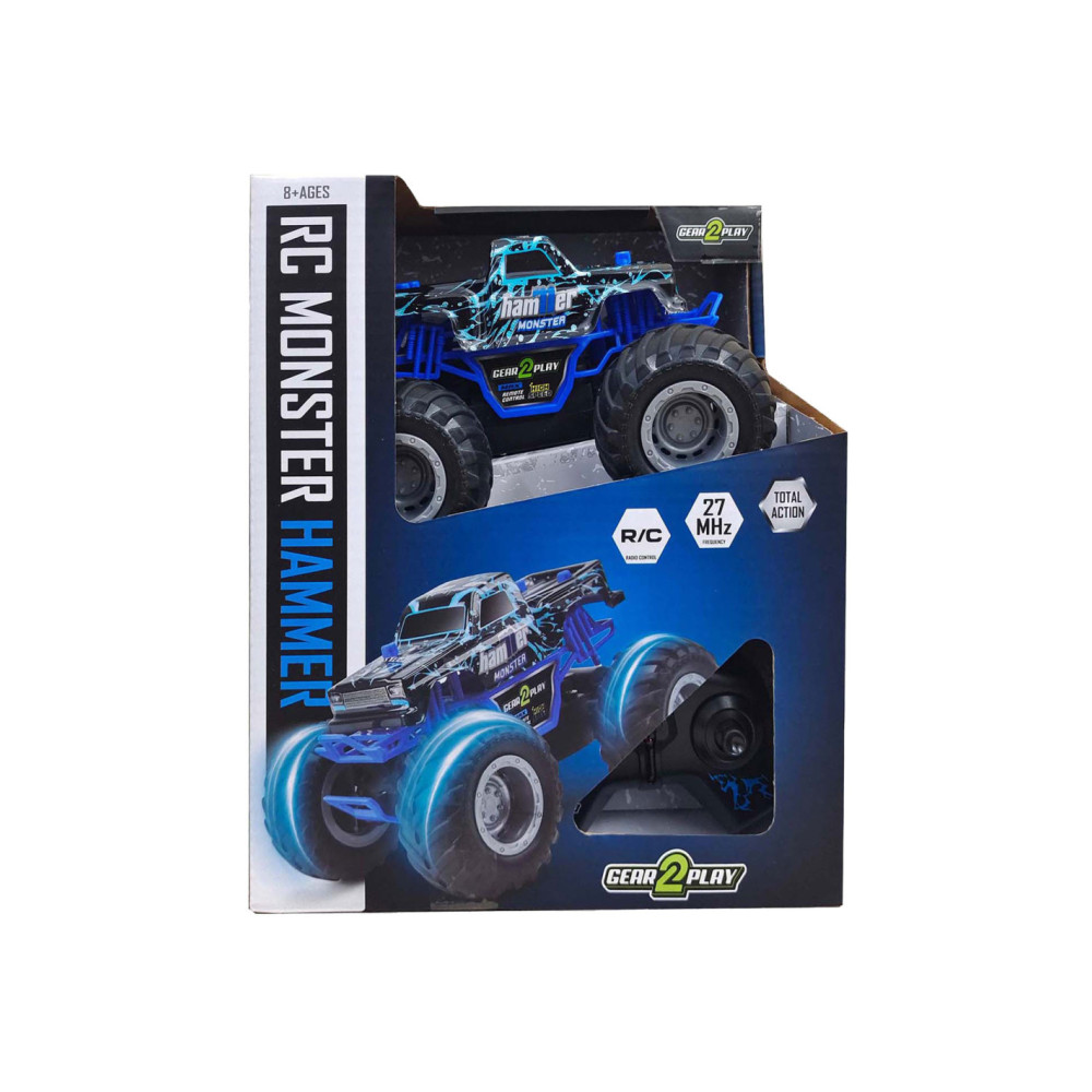 De Gear2Play RC Monster Hammer is een stoere Monstertruck met een schaal van 1:24. Met de controller stuur je deze monstertruck alle kanten op, naar voren, naar achteren en naar links en rechts. Door de krachtige motor kan deze auto snelheden tot maximaal 10 km/u halen. Geschikt voor zowel binnen als buitenshuis, want met zijn 2x2 Big Wheels kan hij alle ondergronden aan. Frequentie: 27 Mhz. Batterij informatie: Auto: 2 x AA batterijen (niet meegeleverd) - Controller: 2 x AA batterijen (niet meegeleverd). Leeftijdsindicatie: 5 jaar+.