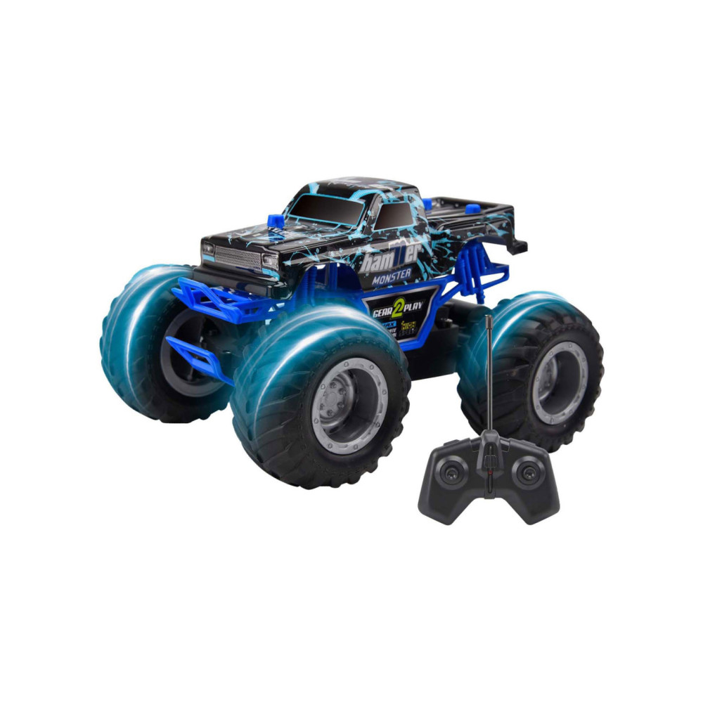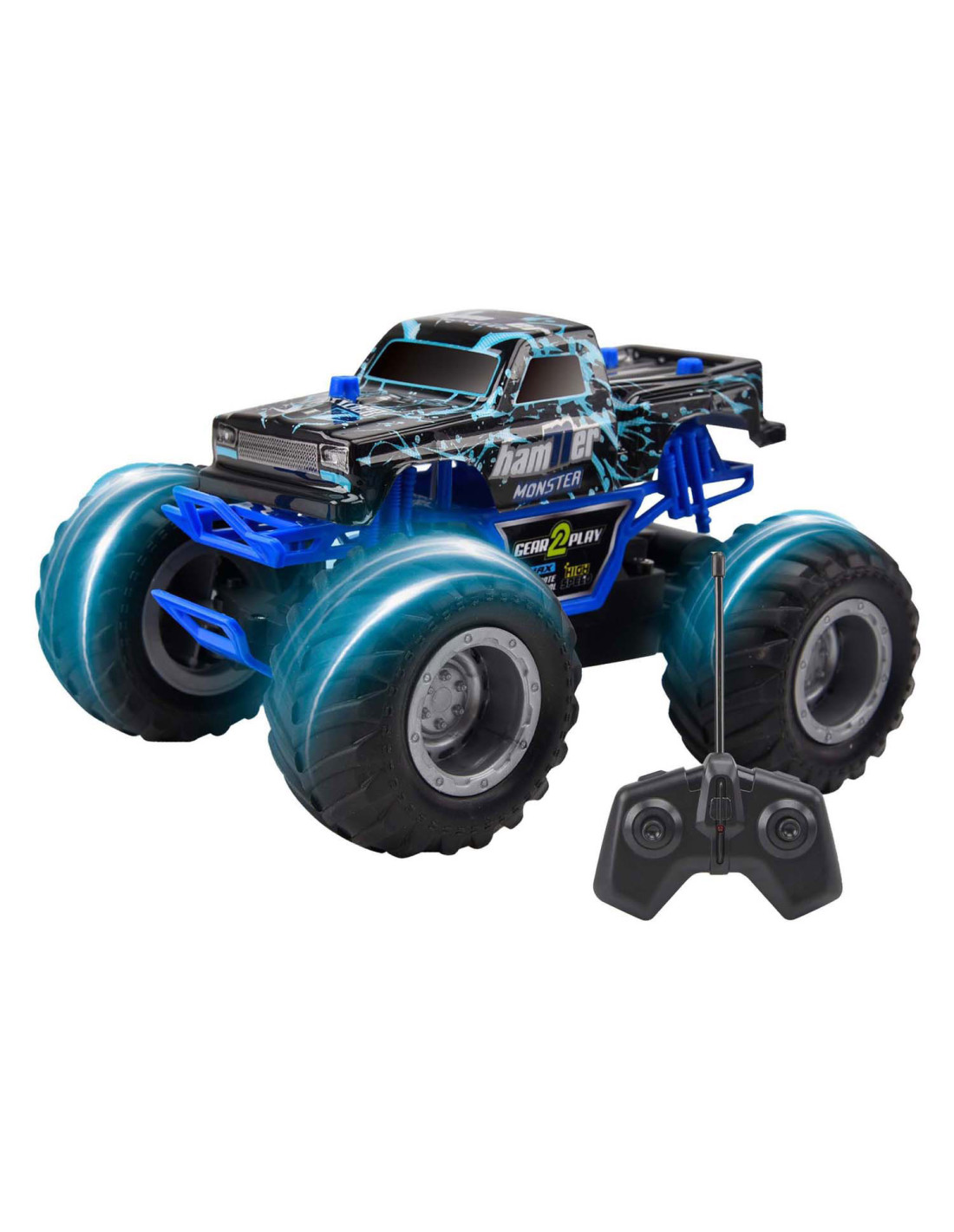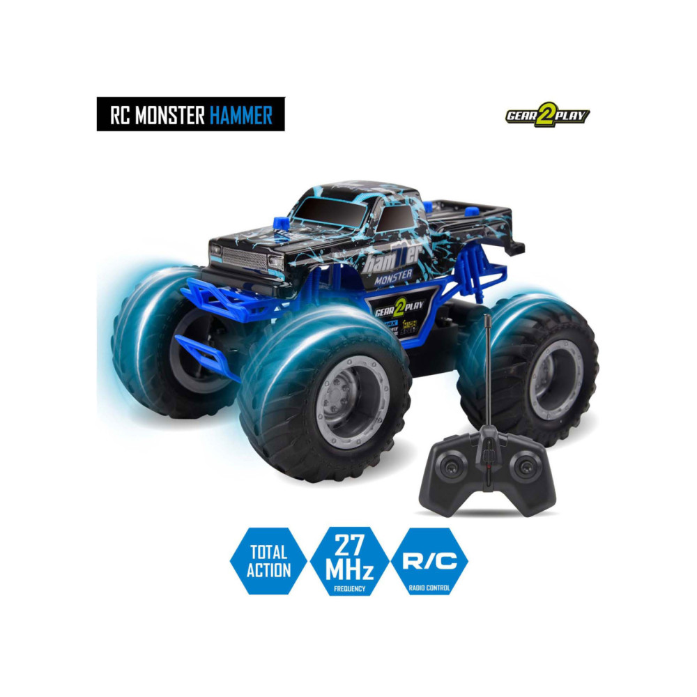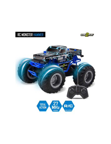 De Gear2Play RC Monster Hammer is een stoere Monstertruck met een schaal van 1:24. Met de controller stuur je deze monstertruck alle kanten op, naar voren, naar achteren en naar links en rechts. Door de krachtige motor kan deze auto snelheden tot maximaal 10 km/u halen. Geschikt voor zowel binnen als buitenshuis, want met zijn 2x2 Big Wheels kan hij alle ondergronden aan. Frequentie: 27 Mhz. Batterij informatie: Auto: 2 x AA batterijen (niet meegeleverd) - Controller: 2 x AA batterijen (niet meegeleverd). Leeftijdsindicatie: 5 jaar+.