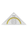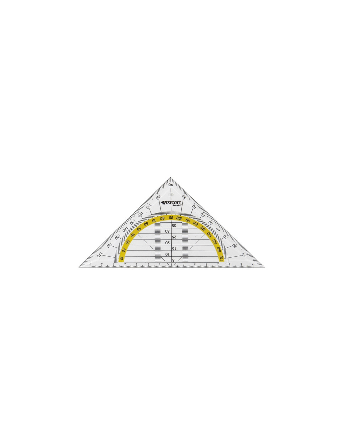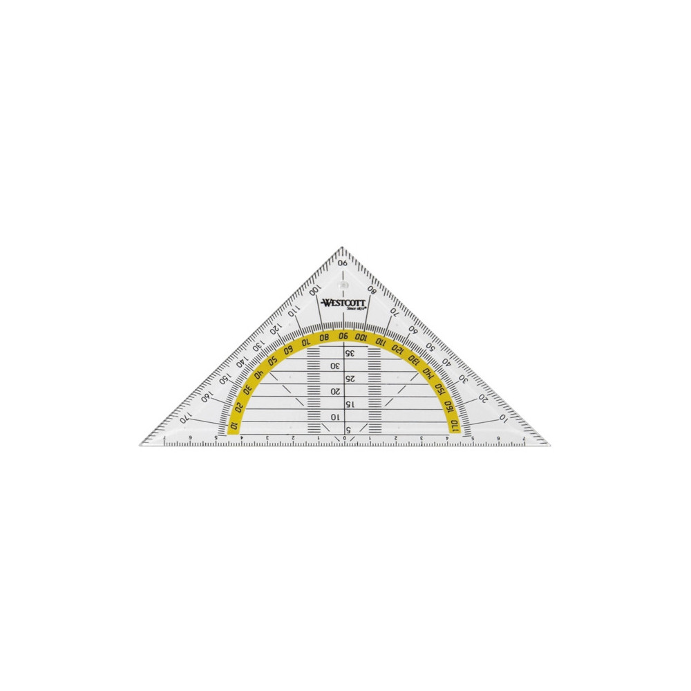 Transparante kunststof tekendriehoek en geodriehoek met gele inktrand. Aan één zijde een cm/mm-verdeling in zwart.
