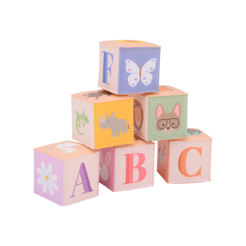 Happy World bad blokken in zachte kleuren. Deze set bevat 6 blokken, elk met een formaat van 7,5 x 7,5 x 7,5 cm.