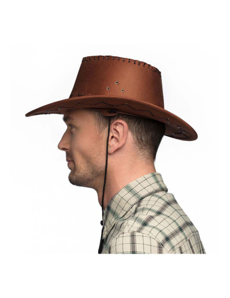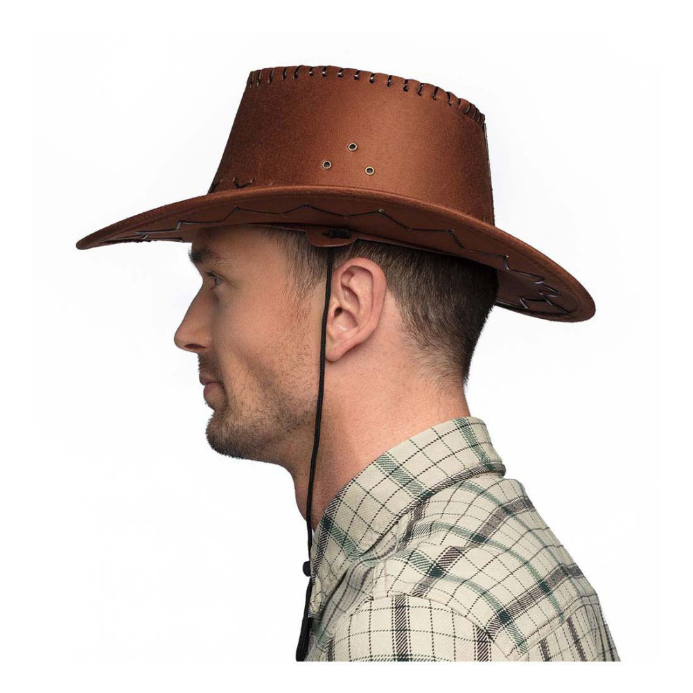 De Boland Hoed Elroy is een bruine cowboyhoed in leatherlook, geschikt voor volwassenen vanaf 14 jaar. Met een hoofdomtrek van 59 cm en een comfortabele pasvorm is deze hoed ideaal voor themafeesten, carnaval of verkleedpartijen. Een stijlvolle toevoeging aan elke westernoutfit.