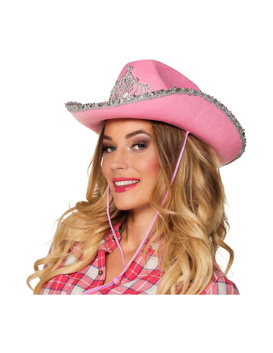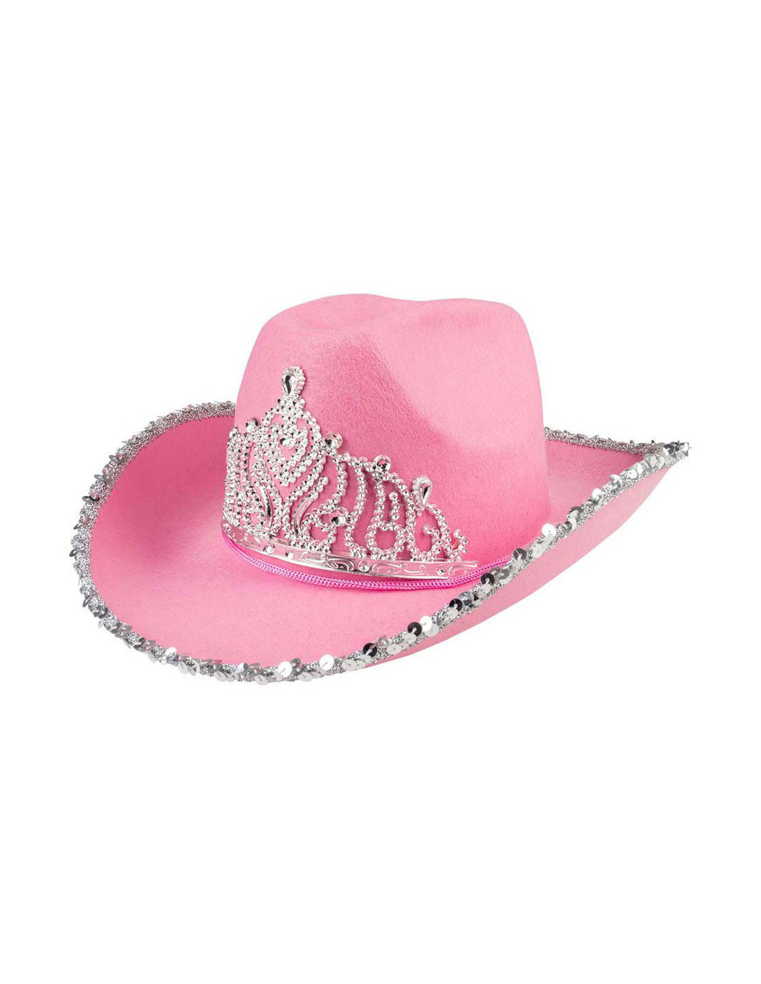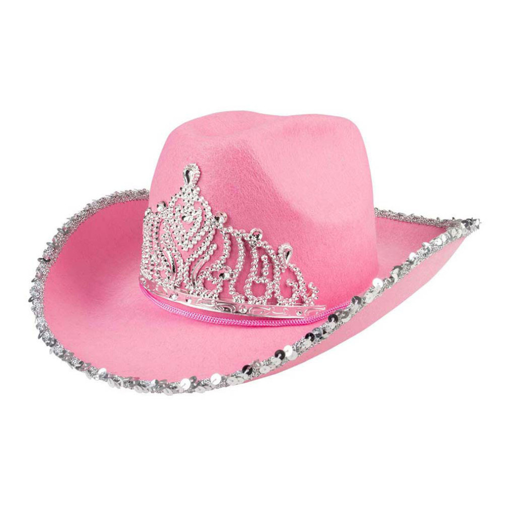 Roze cowboyhoed met zilveren pailletten en tiara, gemaakt van 93% polyester, 4% polystyreen, 2% polyethyleen en 1% polypropyleen. Hoofdomtrek circa 57 cm. Geschikt vanaf 14 jaar.​