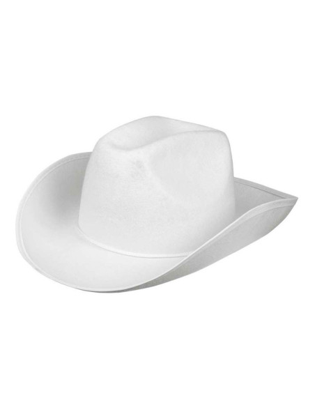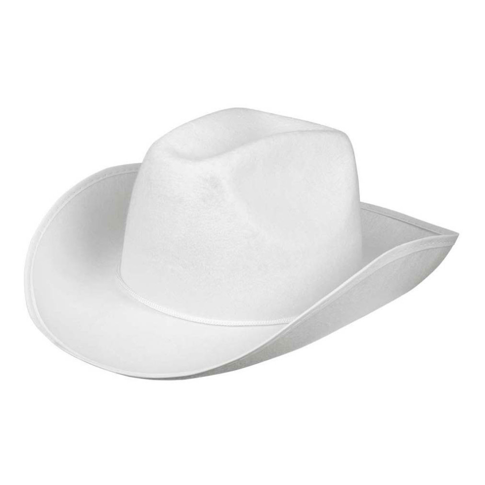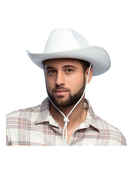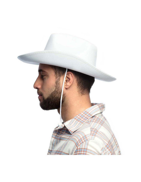 De Boland cowboyhoed 'Rodeo' is een witte hoed van synthetisch vilt met een comfortabele pasvorm voor volwassenen. Geschikt voor een hoofdomtrek van 59 cm.