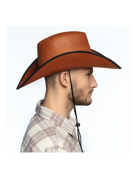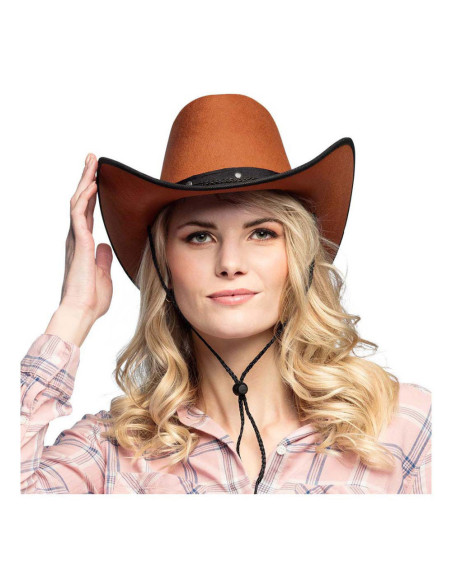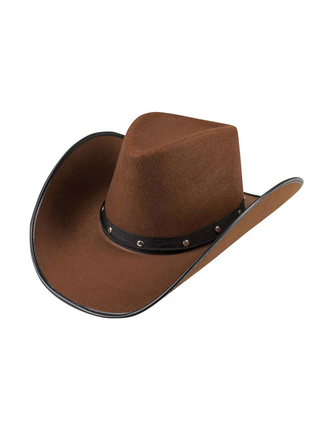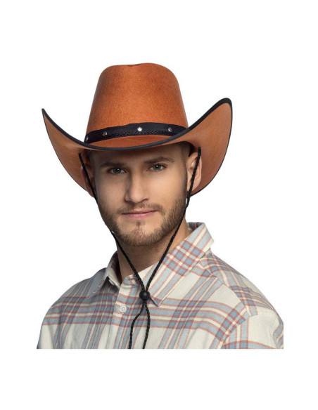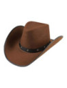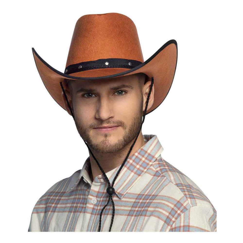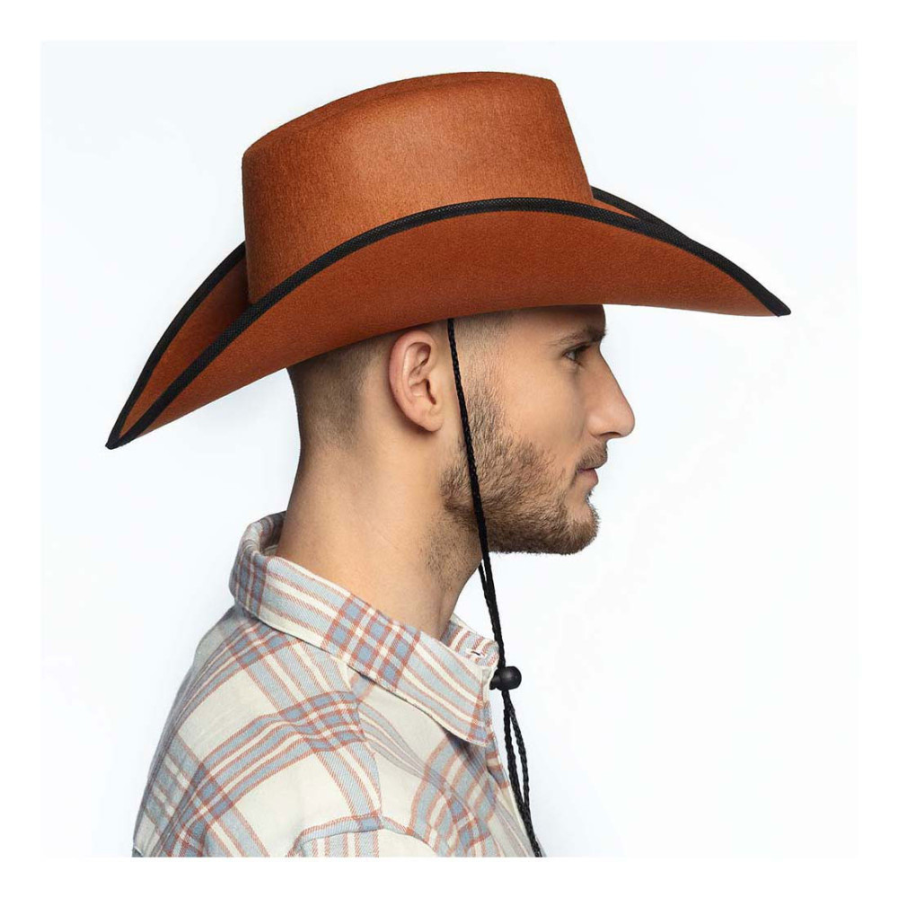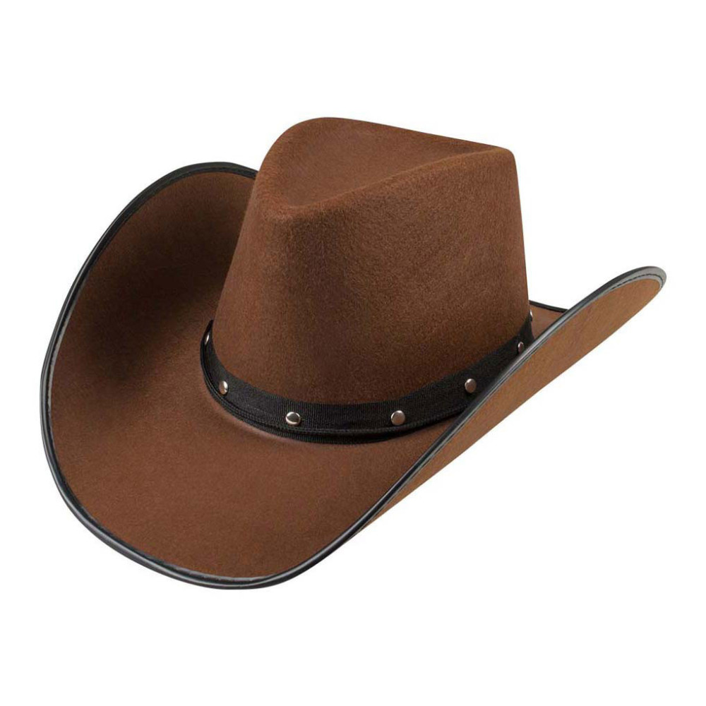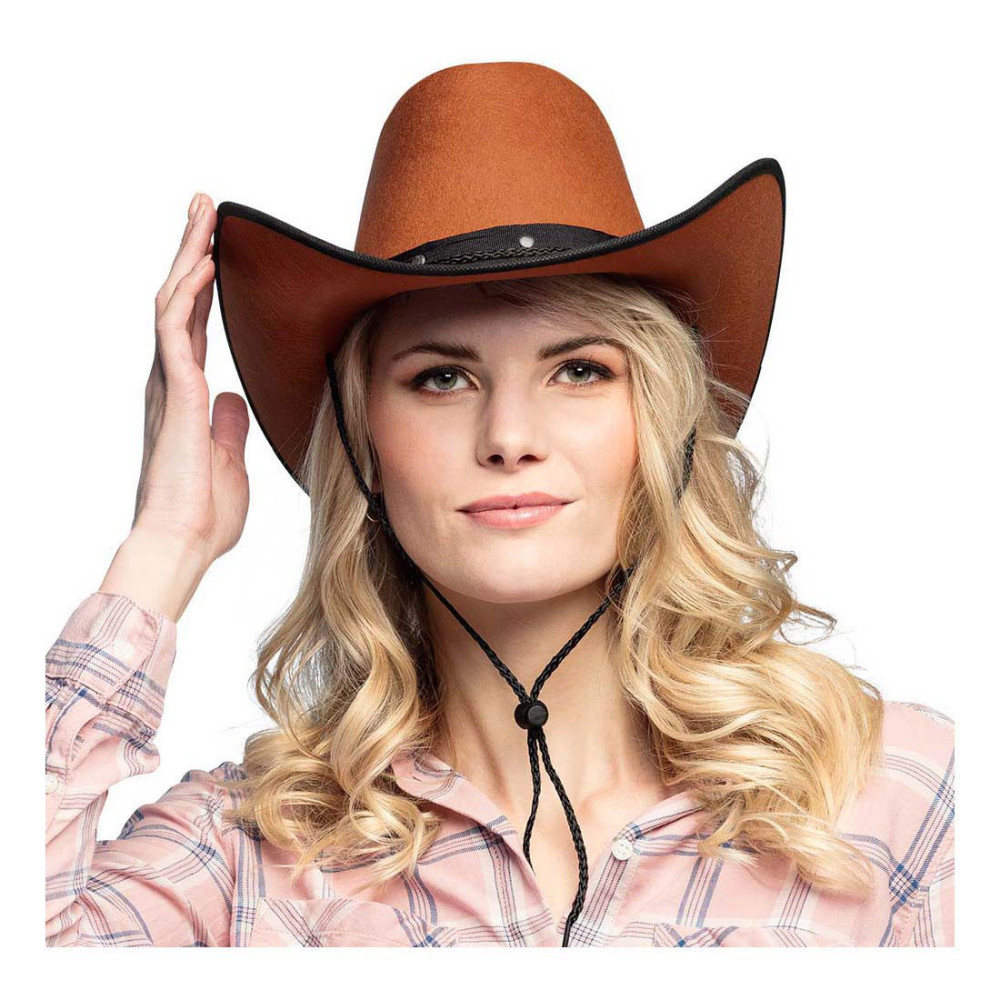 Bruine cowboyhoed van 94% polyester, 5% ijzer en 1% polypropyleen met een hoofdomtrek van circa 59 cm. Geschikt vanaf 14 jaar.