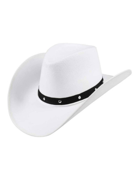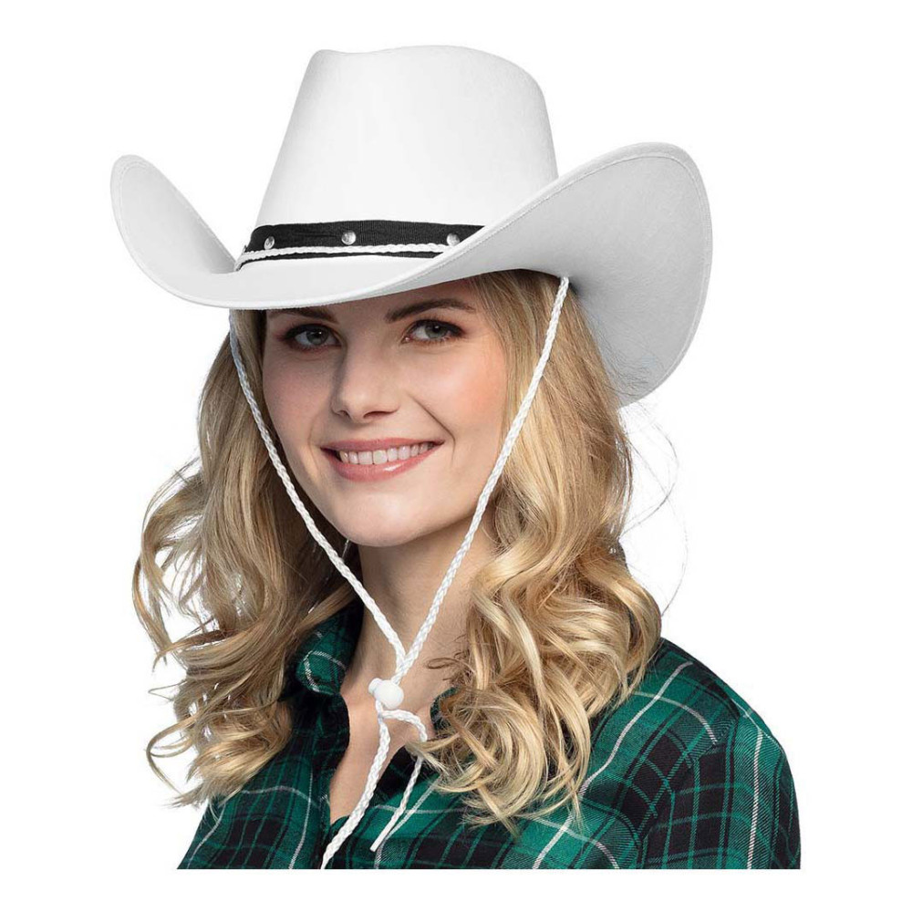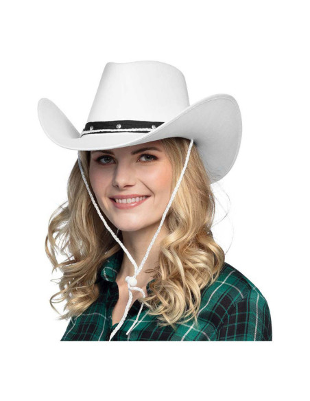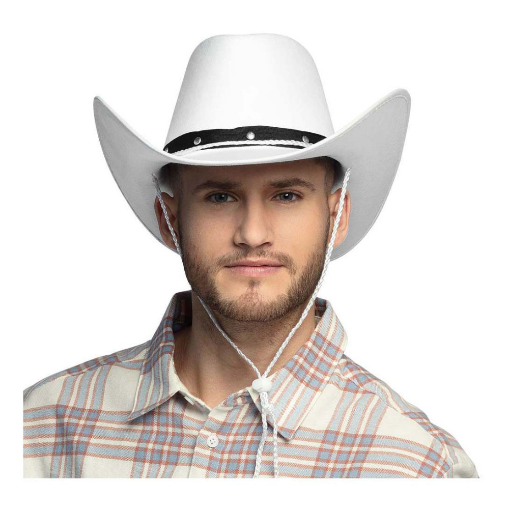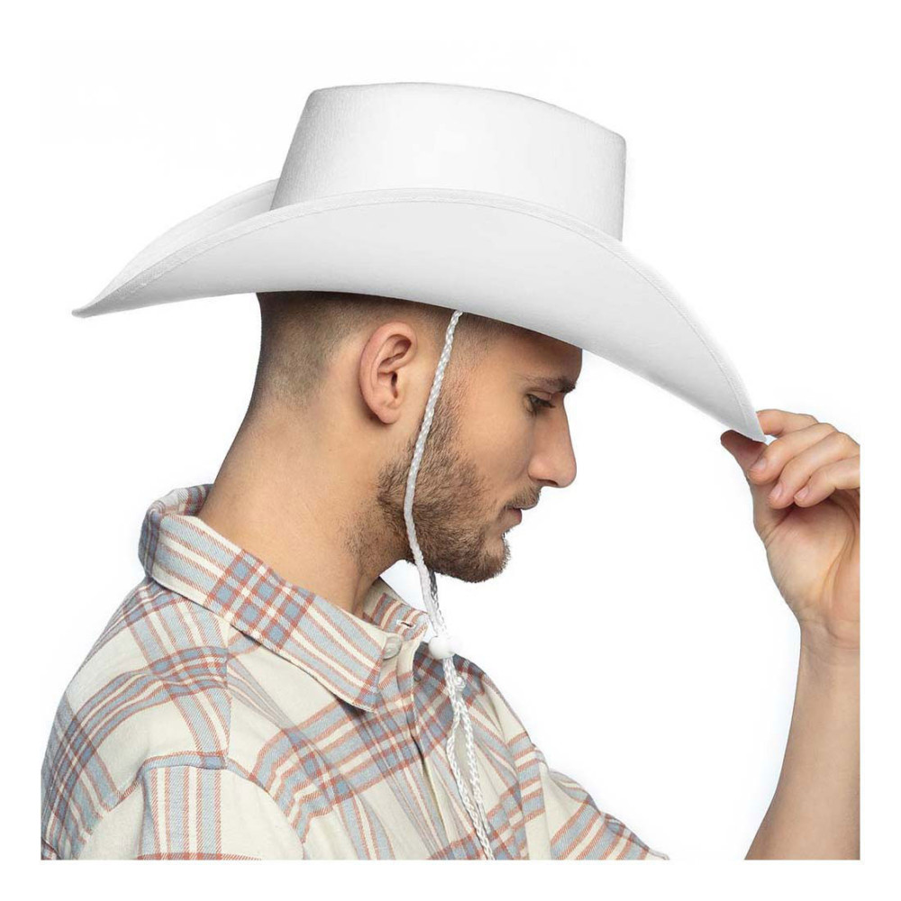 Witte cowboyhoed van 100% polyester met een hoofdomtrek van circa 59 cm. Geschikt vanaf 14 jaar.