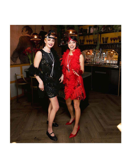 Jaren 20 Charleston hoofdband met pailletten, struisvogelveer en een embleem. Geschikt voor volwassenen.