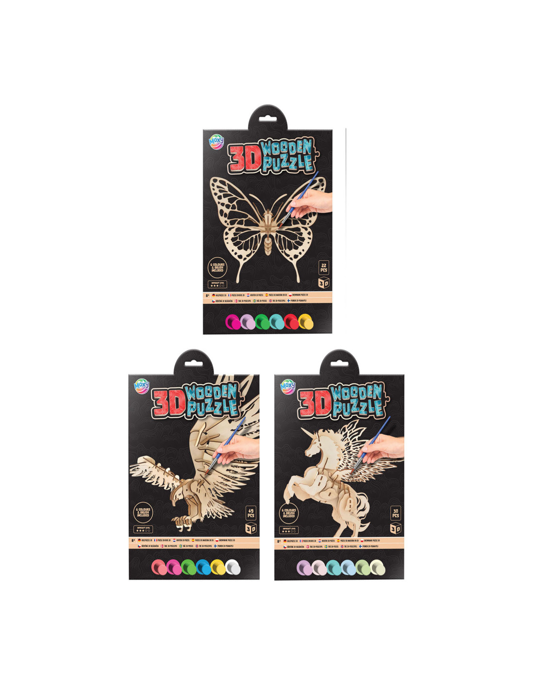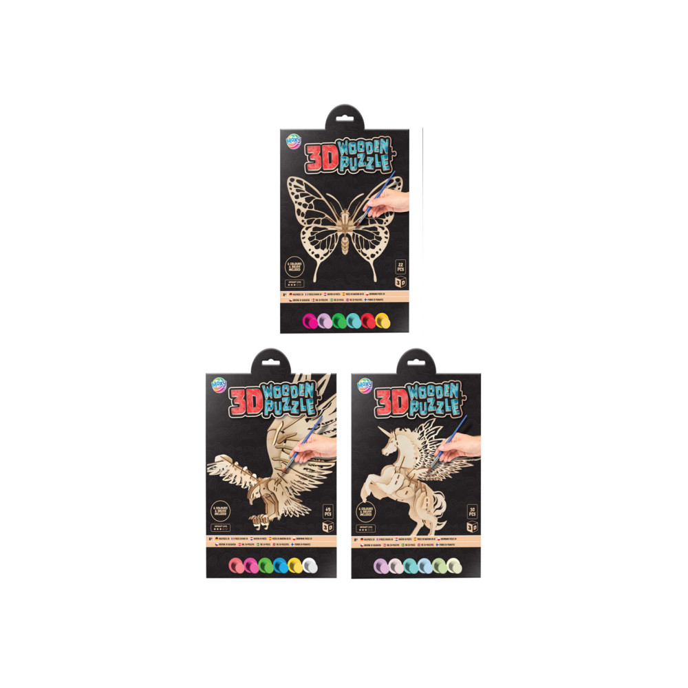 Houten 3D-puzzel in variant linder (22 delen), Roofvogel (49 delen), en Eenhoorn (30 delen). Inclusief 6 potjes verf en 1 penseel. Geschikt vanaf 8 jaar.