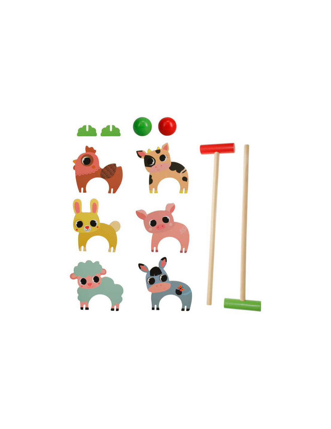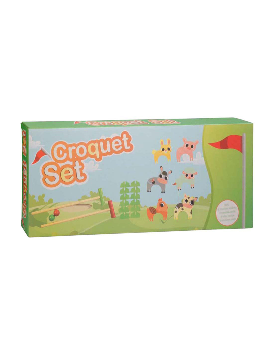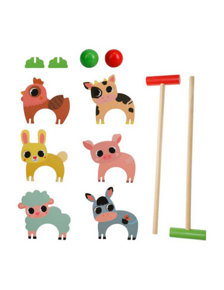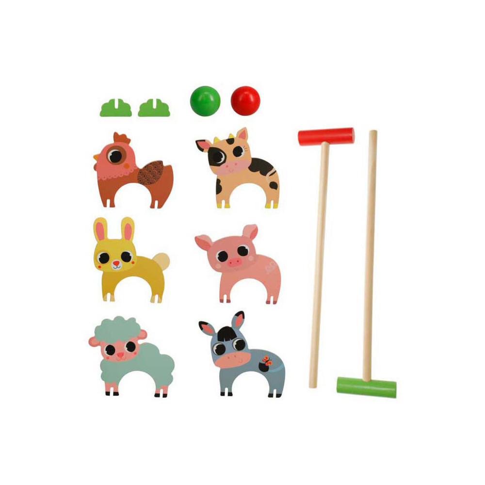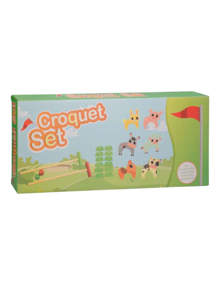 Houten Boerderij Dieren Croquetspel. De set bevat 2 clubs, 2 ballen en 6 poortjes. Afmeting: 43 x 19 x 4,5cm.