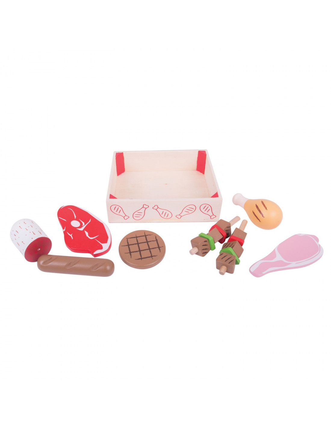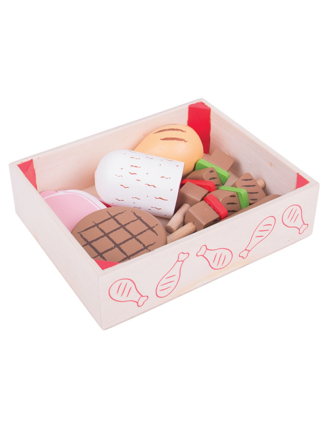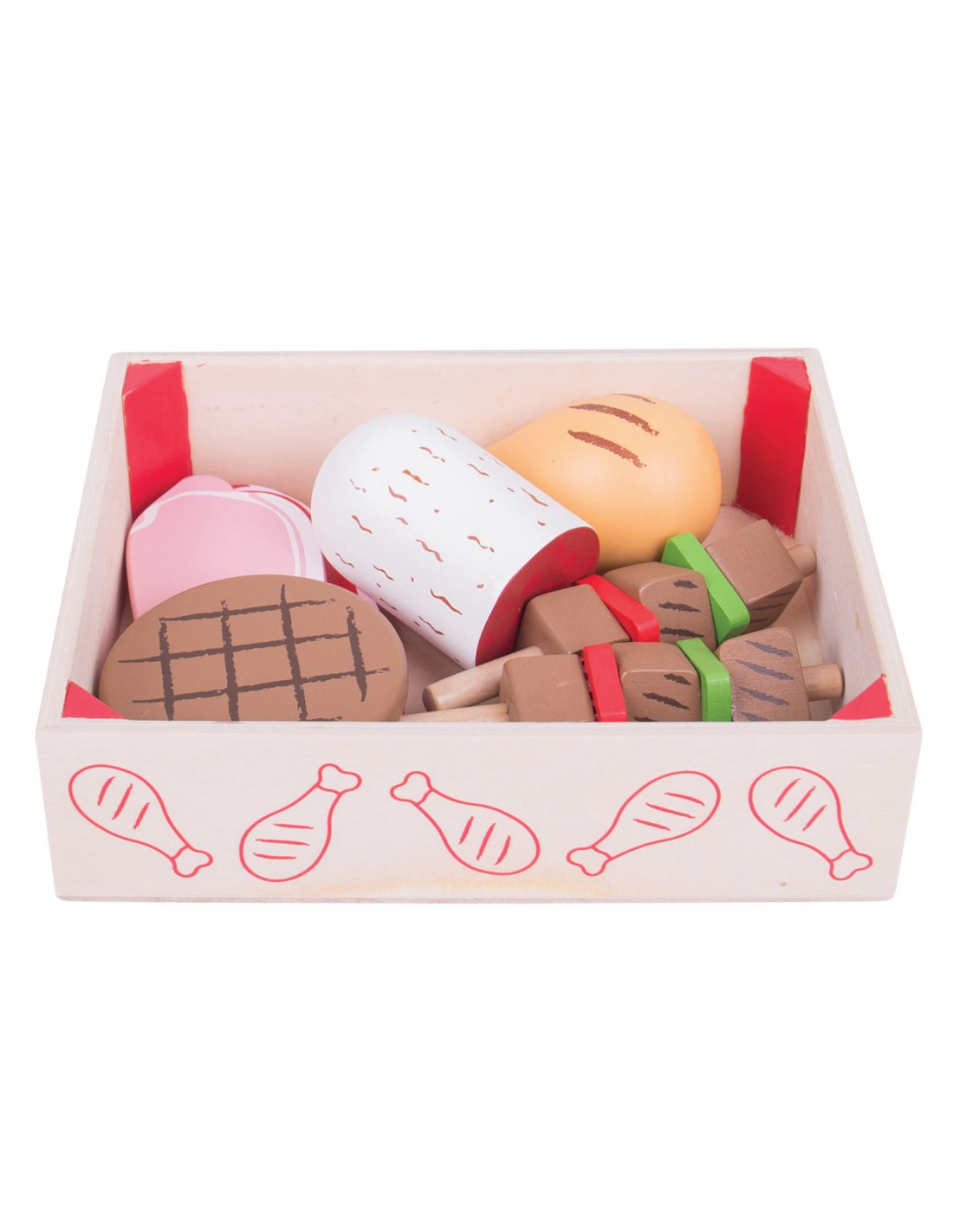 Organiseer een barbecue met dit houten kistje met vleeswaren van BigJigs. Het houten kistje bevat prachtig afgewerkte houten figuren van shaslicks, worstjes, hamburgers, een drumstick, worst en karbonades. Wat zullen je gasten smullen! Spelen met het speeleten van de vleeswaren stimuleert de ontwikkeling van fantasie en sociale vaardigheden.