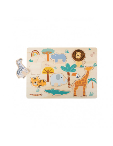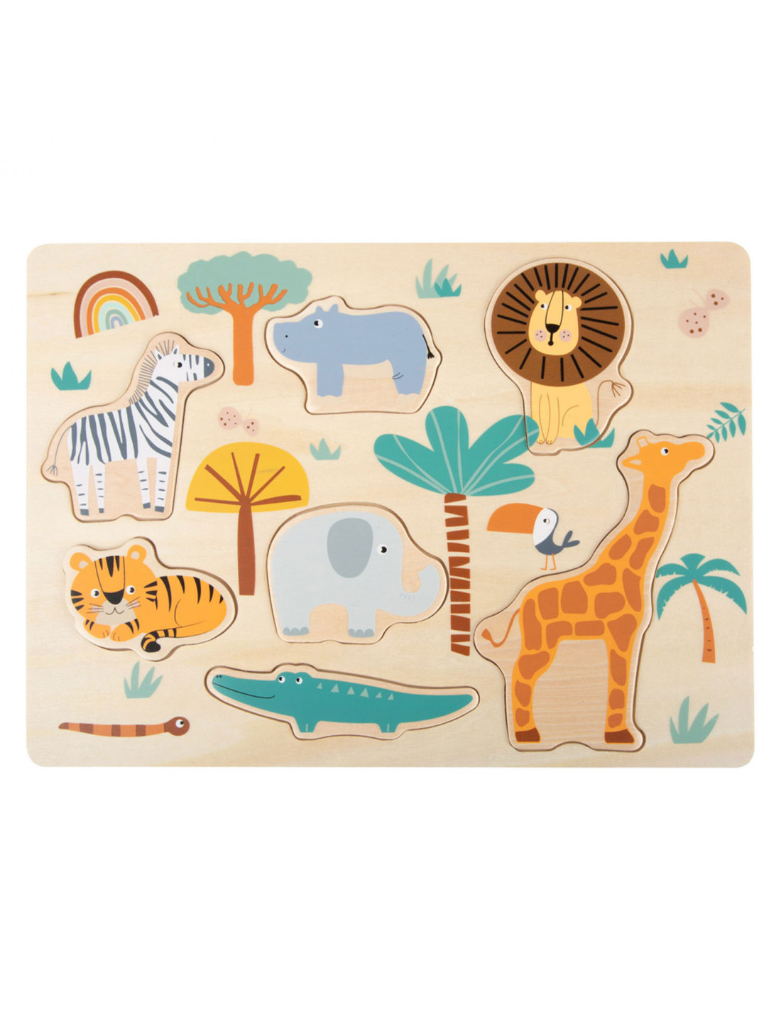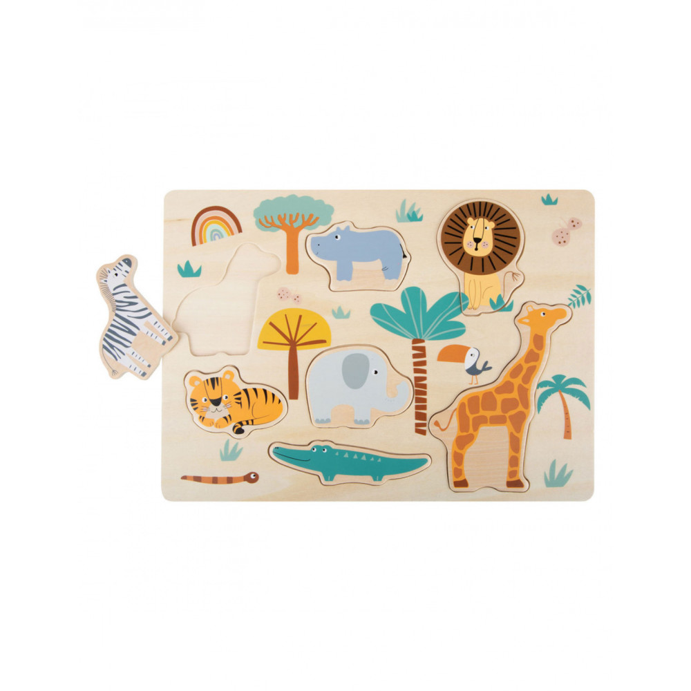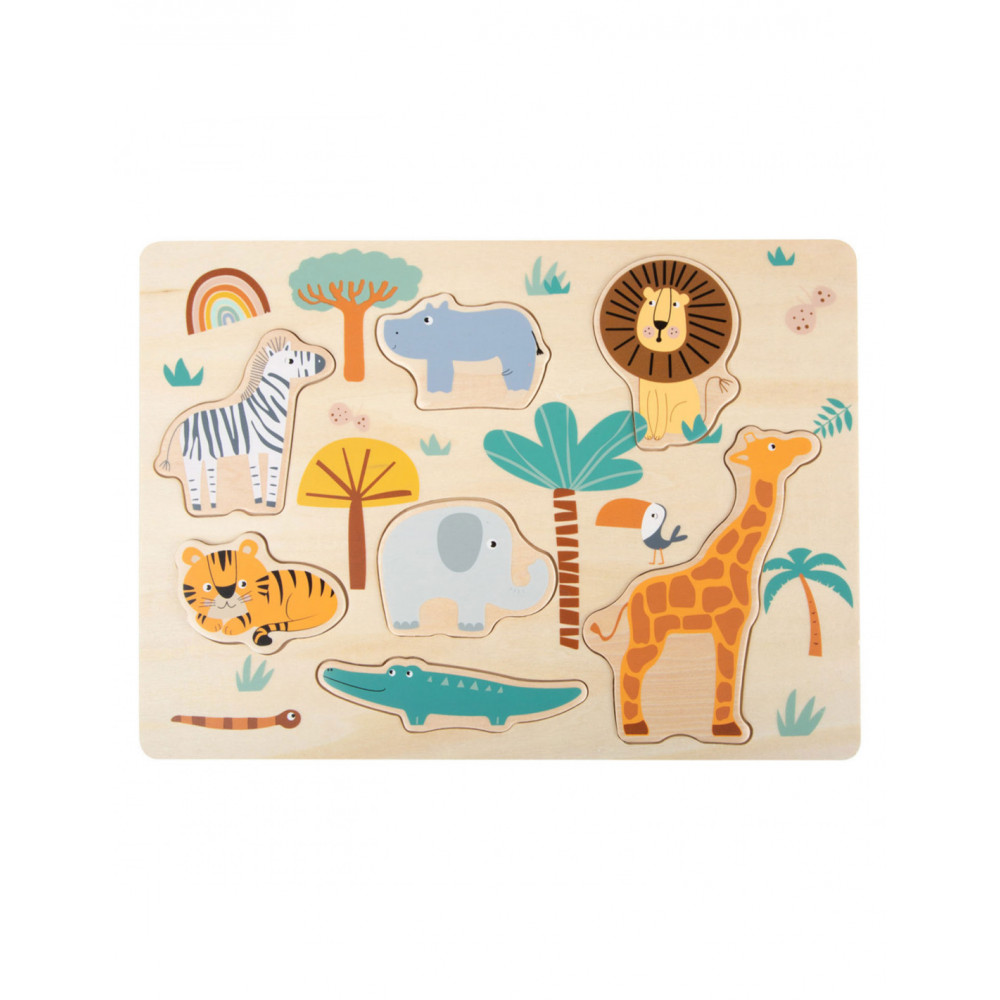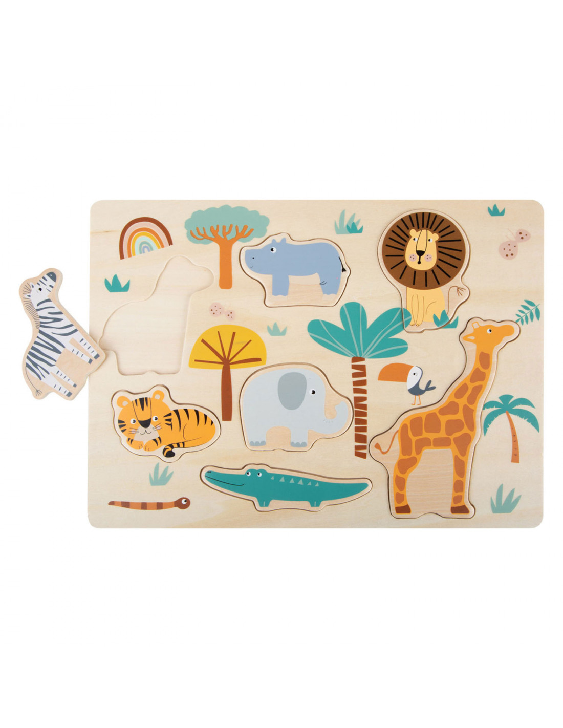Plaats de juiste wilde dieren puzzelstukken in de juiste vorm. De puzzel is gemaakt van hout en hoogwaardige gedrukte illustraties met trendkleuren. Geschikt voor kinderen vanaf 12 maanden.
