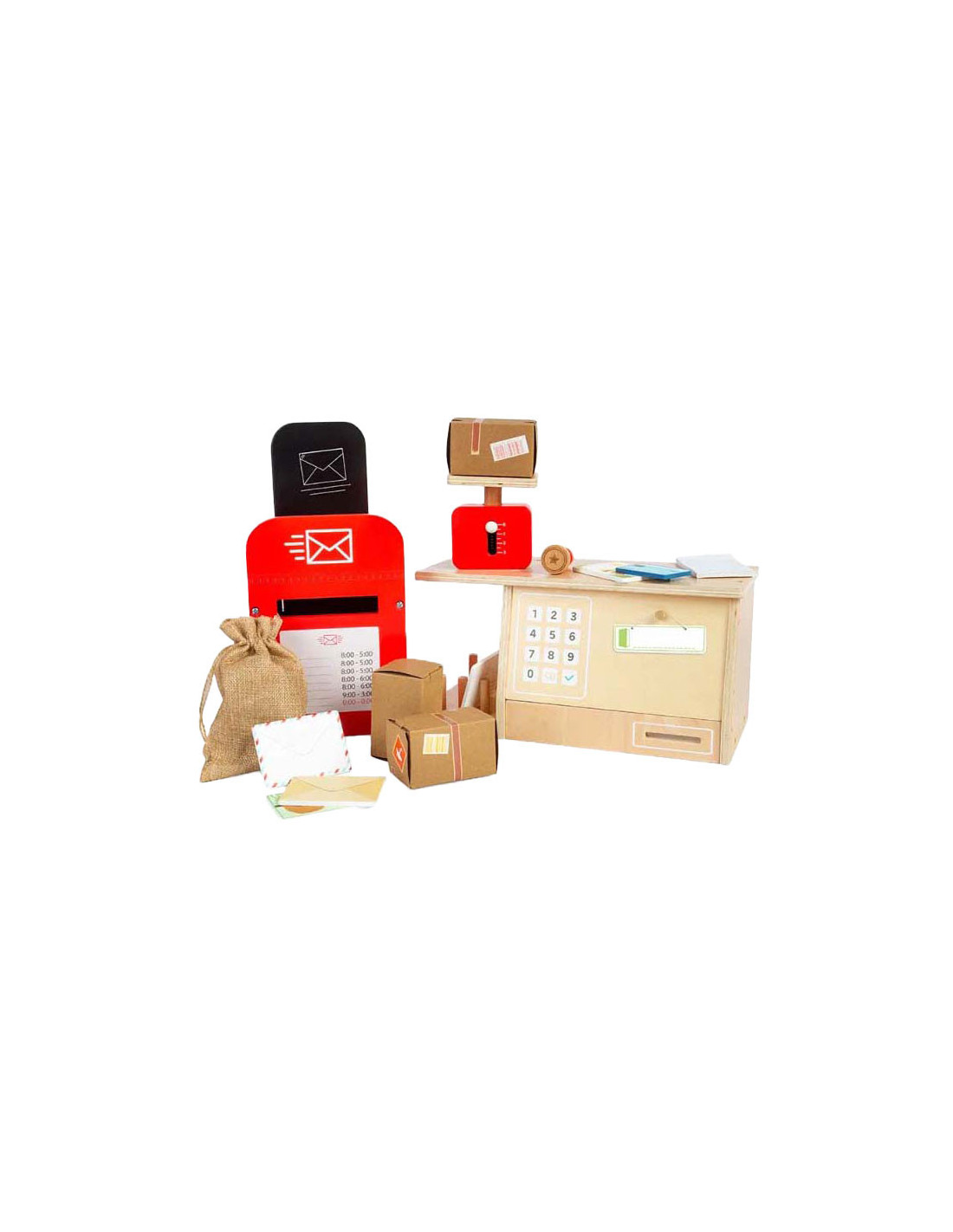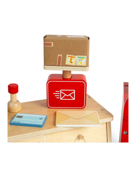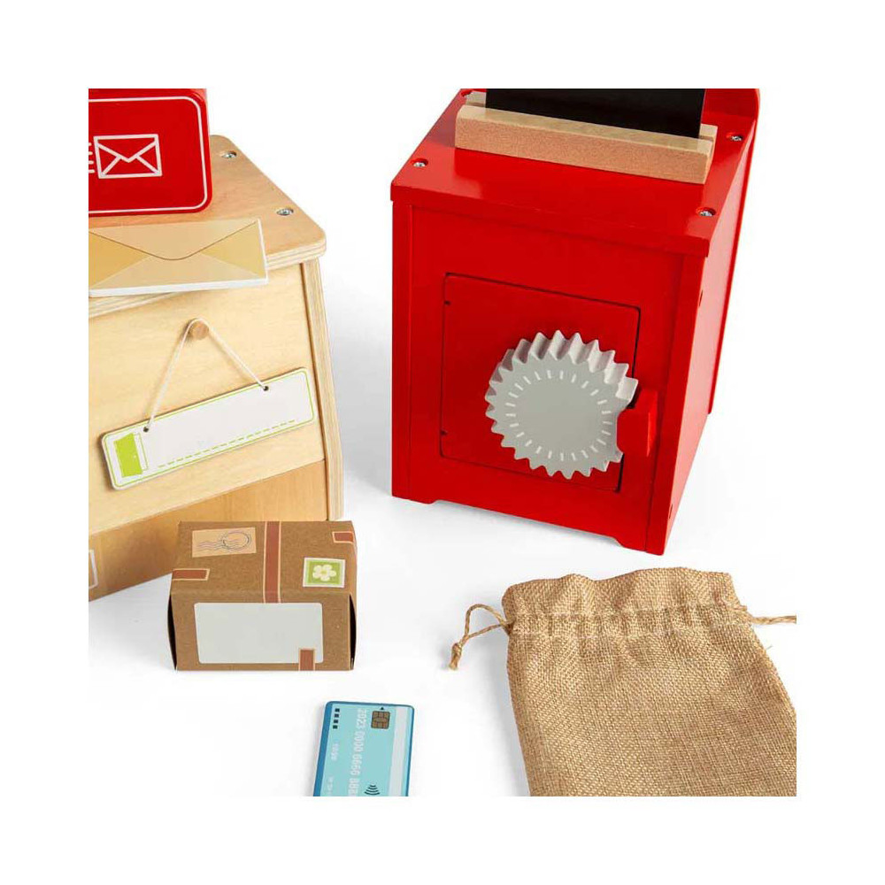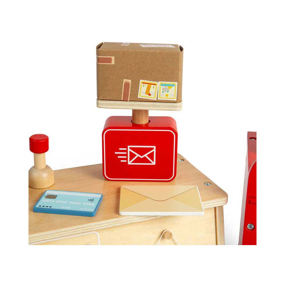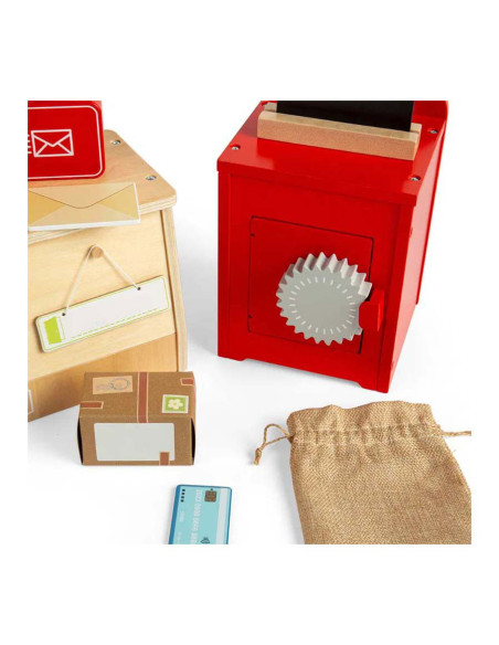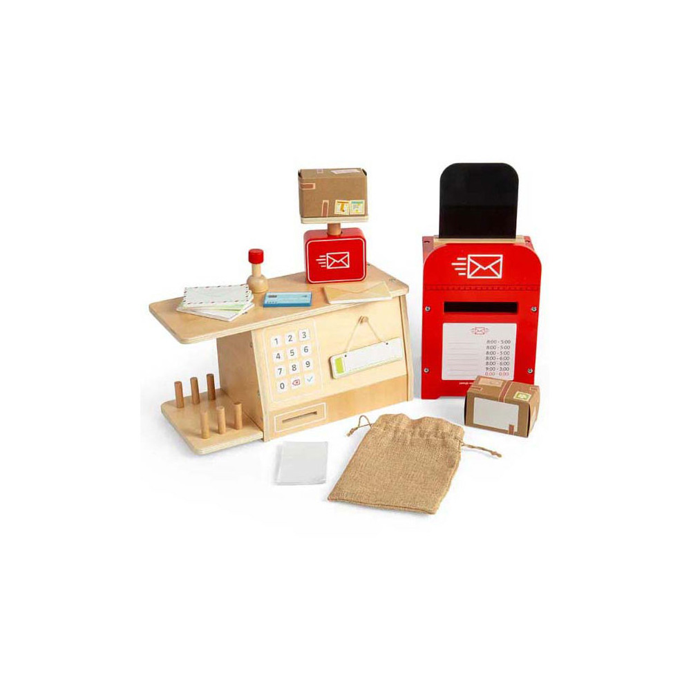 Rollenspelspeelgoed is uitstekend voor de verbeelding , creativiteit , sociale vaardigheden en taalontwikkeling van kinderen! Dit 19-delige postkantoor speelgoed is gemaakt van premium kwaliteit en duurzaam FSC® gecertificeerd hout en gekleurd met niet-giftige verf en lak.