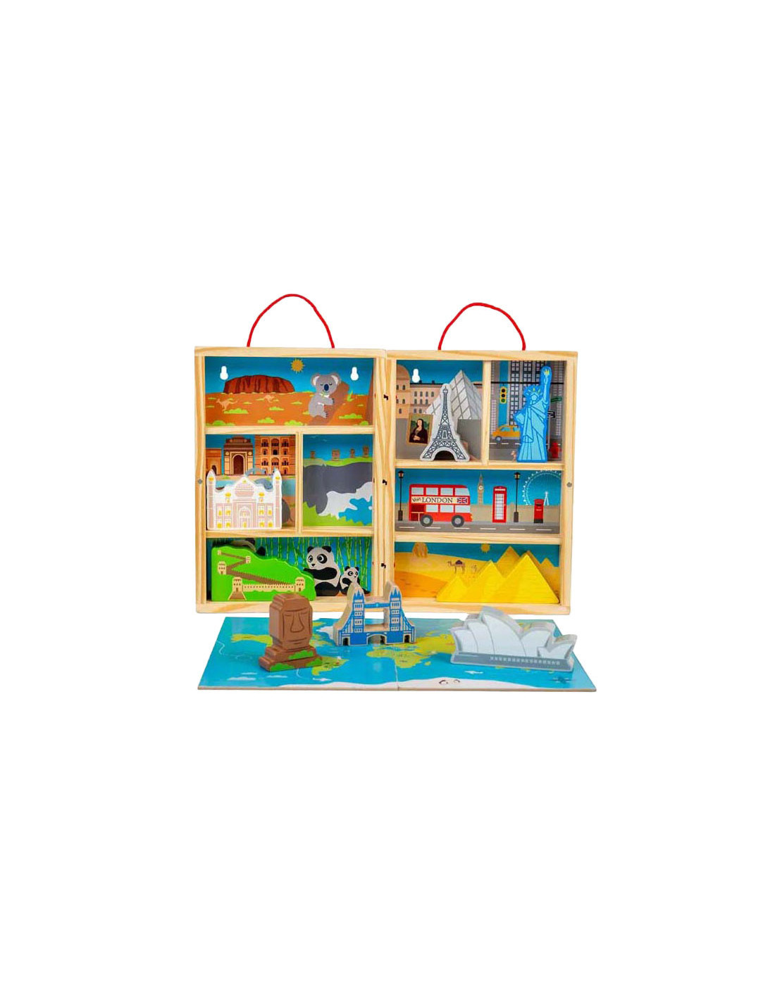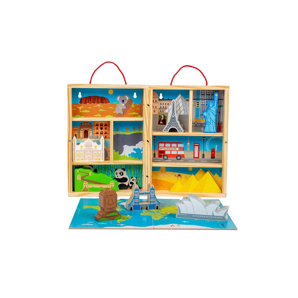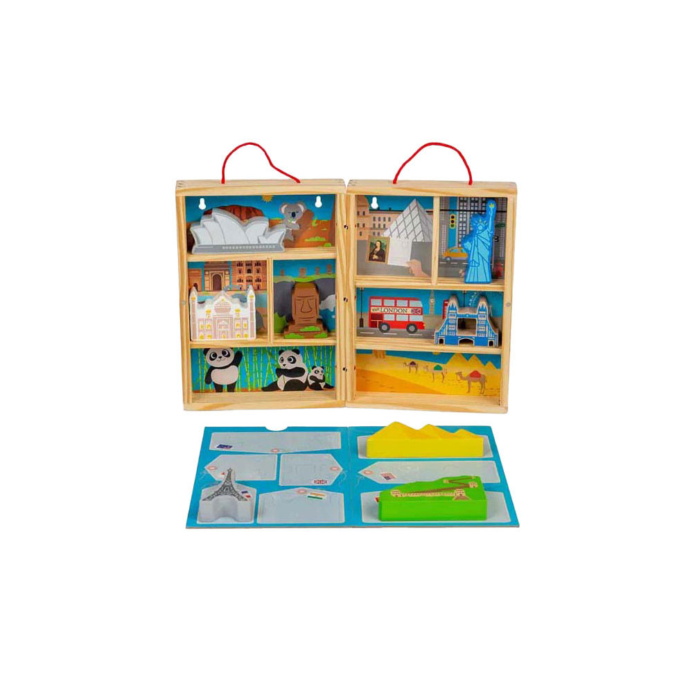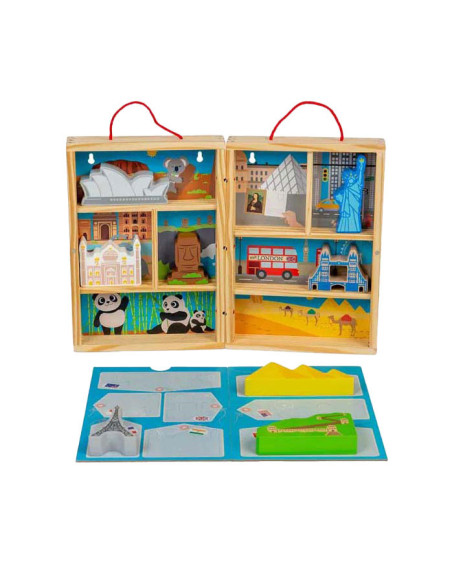 Kleine globetrotters kunnen de grote wijde wereld verkennen vanuit het comfort van hun huis met onze geweldige Travel Playbox . Open de box en ontdek iconische bestemmingen en beroemde bezienswaardigheden, van de Egyptische piramides en de Chinese Muur tot het Sydney Opera House in Australië en de Tower Bridge in Londen!