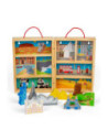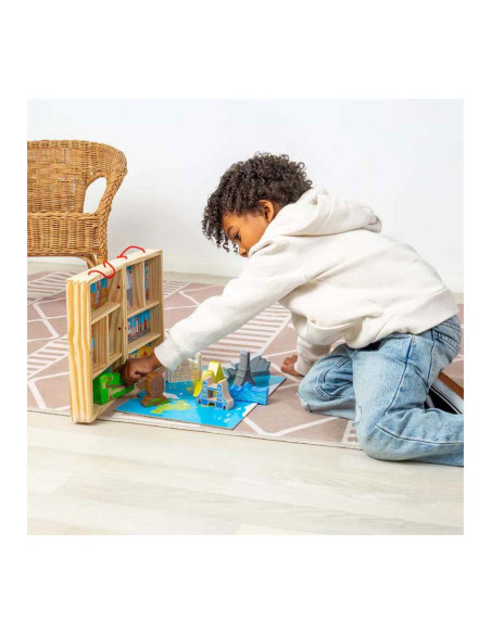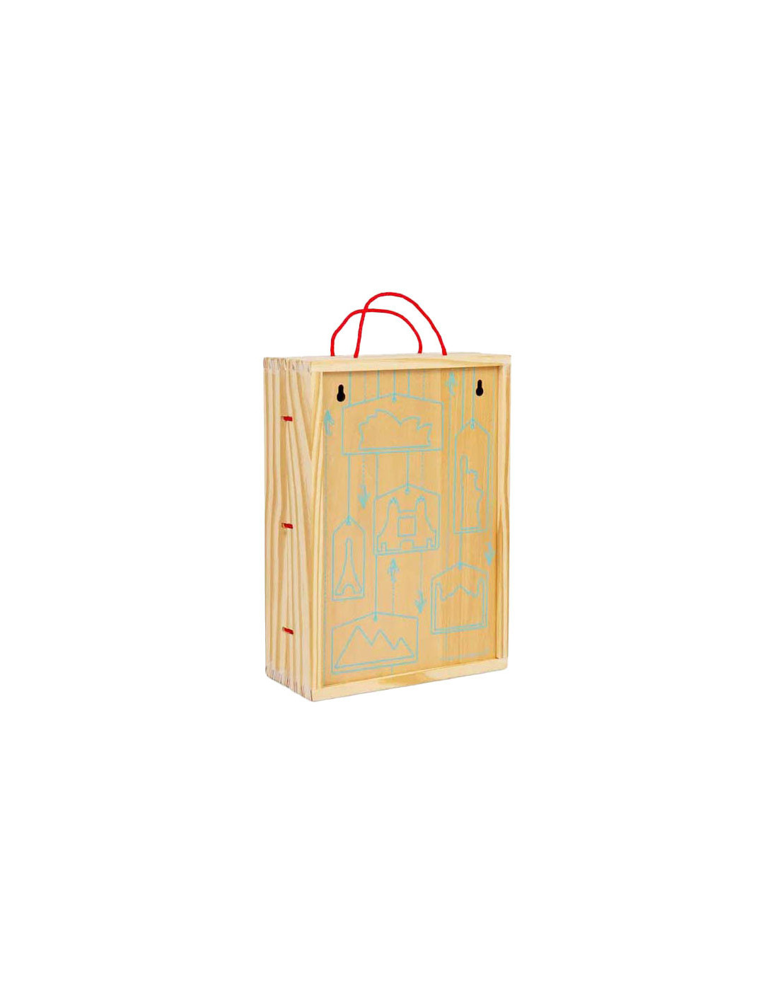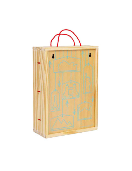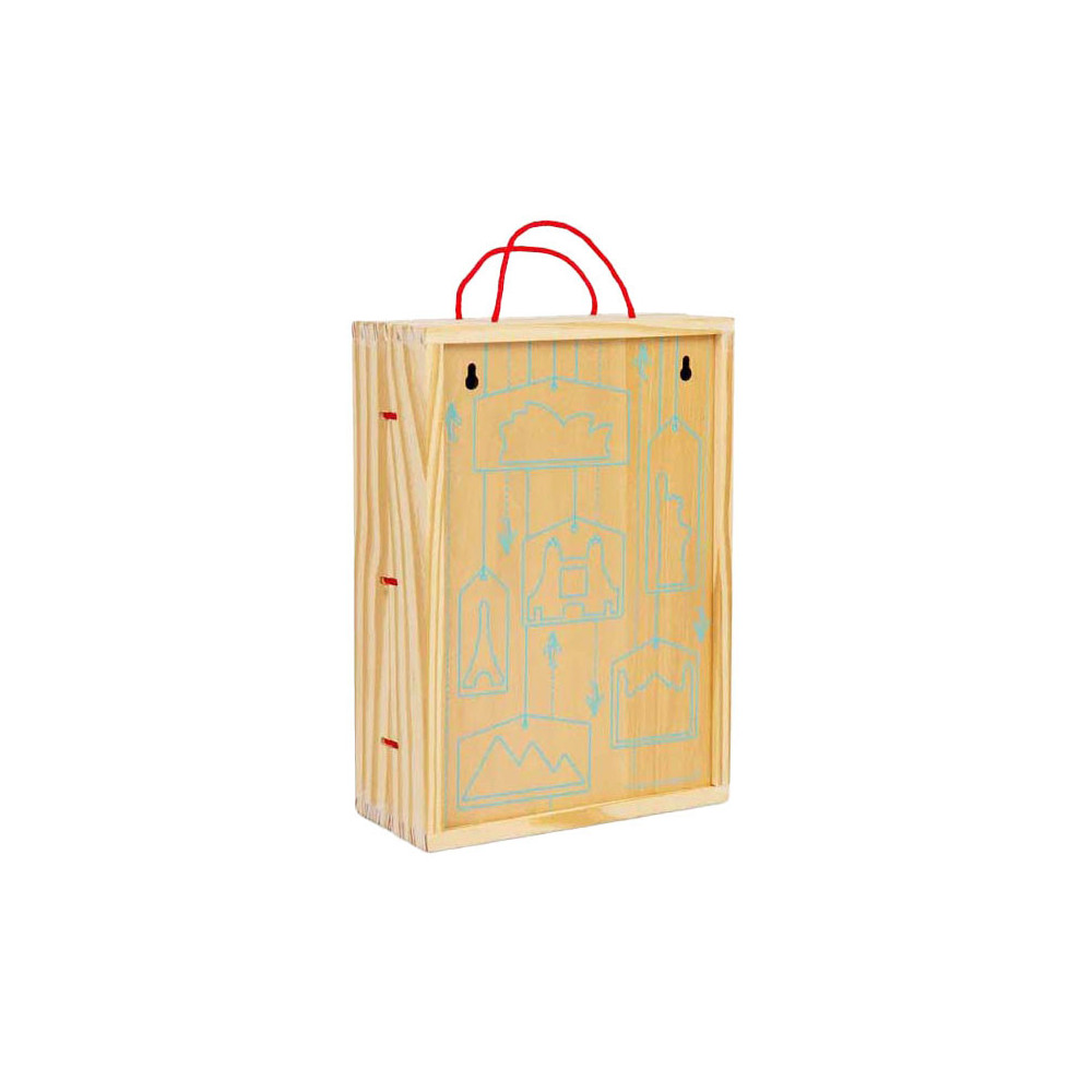 De set wordt geleverd met een verzameling houten herkenningspunten en een uitvouwbare kaart, die na het spelen in de magnetisch doos kan worden opgeborgen.