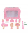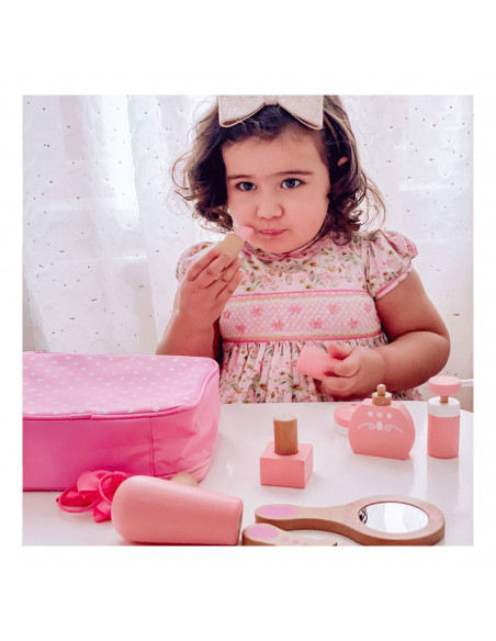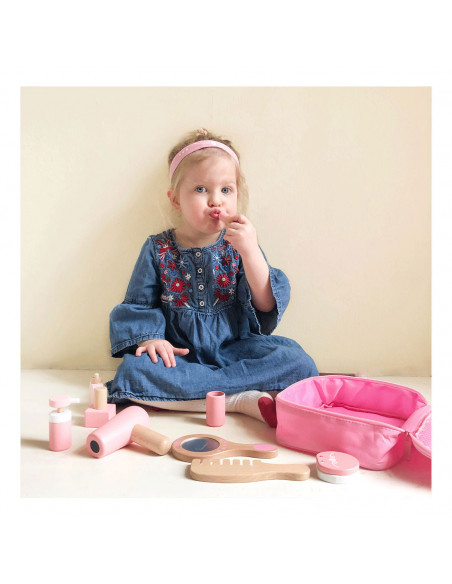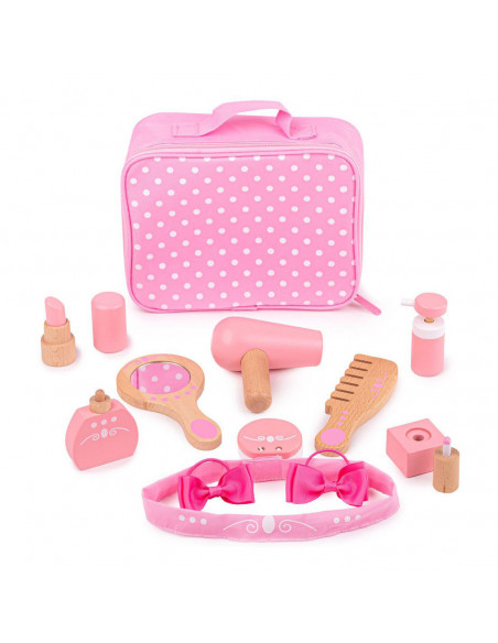 Wie is de mooiste van het land? Dat ben jij, want jij hebt jezelf tot een prachtvrouw gemaakt met de Houten Beauty Case! De 11-delige set bestaat uit: een roze-wit gestippelde koffer, crème, spiegeltje, kam, nagellak, lippenstift, parfum, föhn, gezichtspoeder, haarband en 2 strik haarelastiekjes. De Houten Beauty Case set is gemaakt materialen van hoogwaardige kwaliteit.