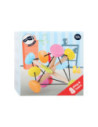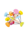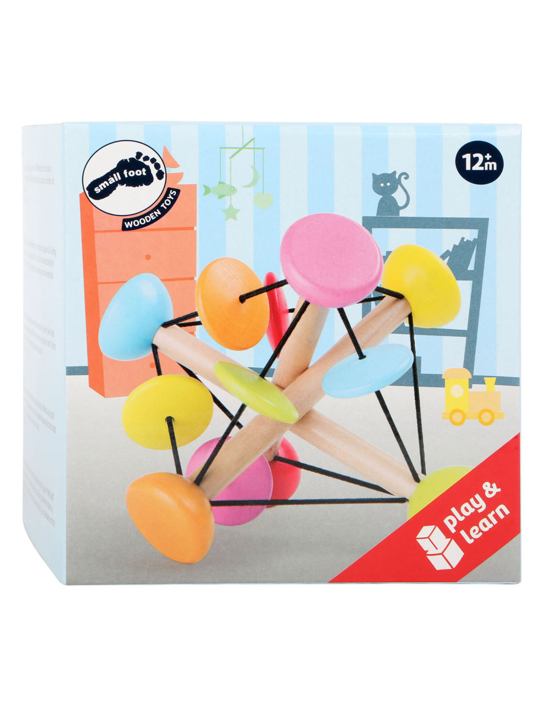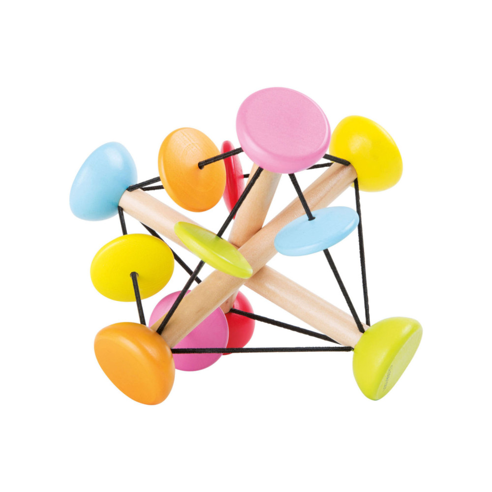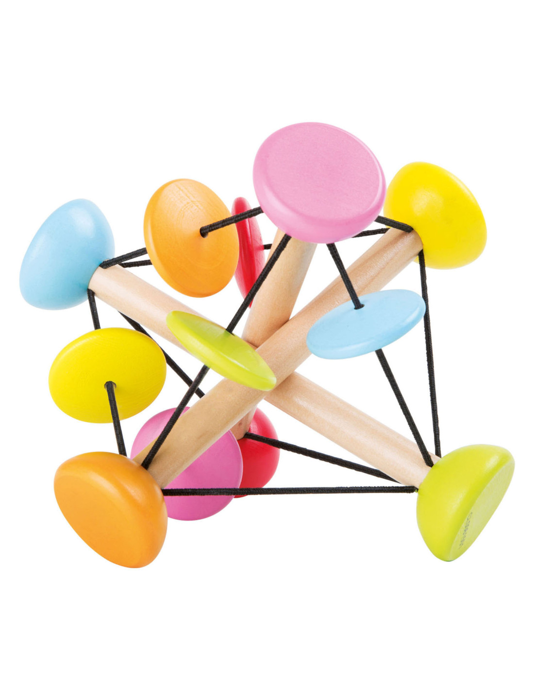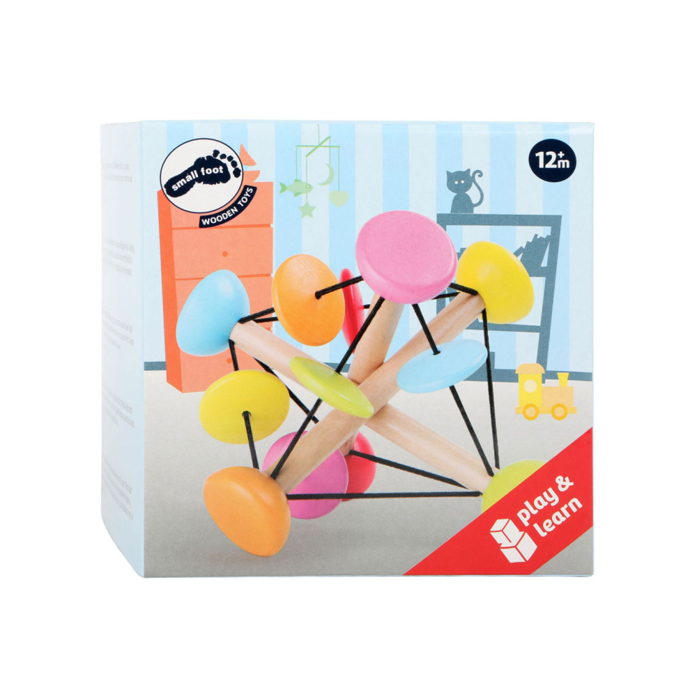 Drie houten staven zijn verbonden met elastiekjes. Ze zijn zeer flexibel en kunnen naar wens worden gedraaid en getrokken. Het is een echte sportieve uitdaging voor kleine handjes. De kleurrijke schuifelementen kletteren bij het schudden.