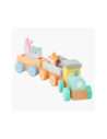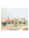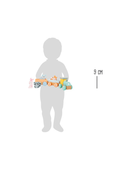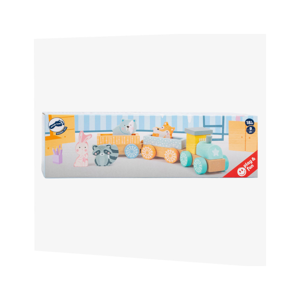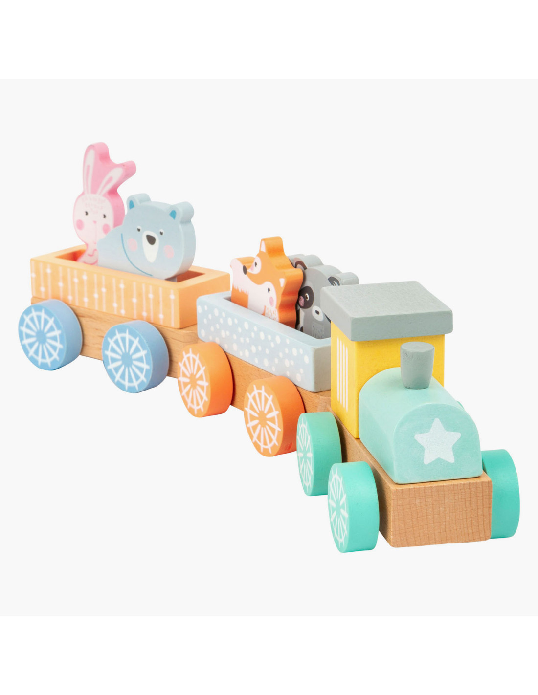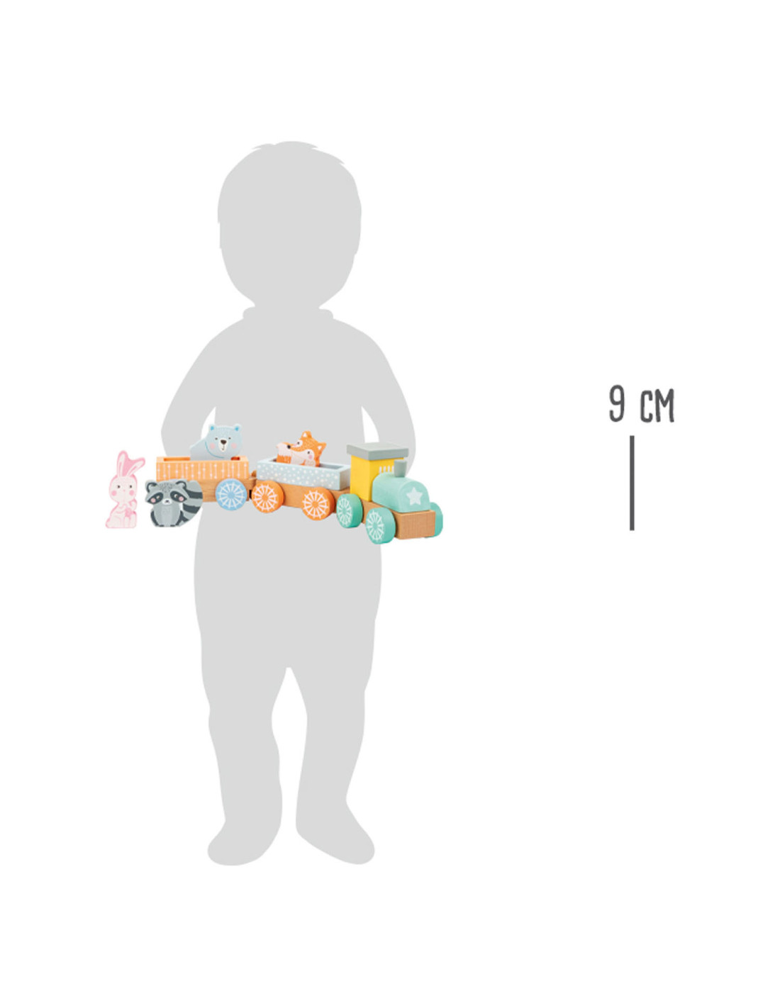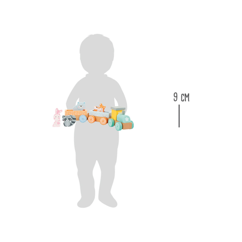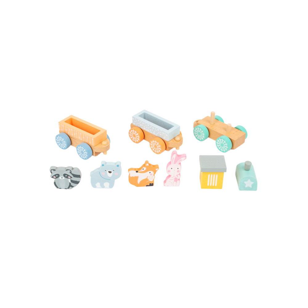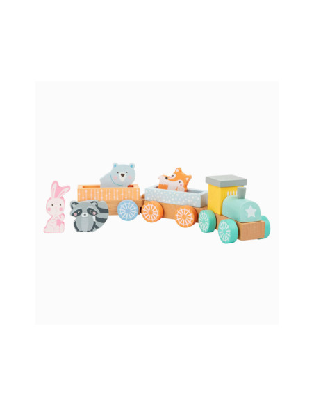 Toet Toet, daar komt de trein! Deze pastelkleurige trein heeft allerlei speelplezier aan boord! De twee treinwagons kunnen via de eenvoudige insteekverbinding aan elkaar worden bevestigd. De kleine locomotief kan worden getrokken met de twee bouwstenen die kunnen worden ingeschoven. De treinwagons bieden plaats aan de vier liefdevol beschilderde bosdiertjes. En iedereen wil een ritje: de vos, het beertje en hun vriendjes wachten vol spanning op de tocht door de kinderkamer!