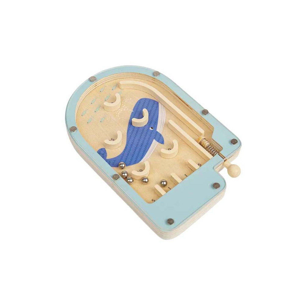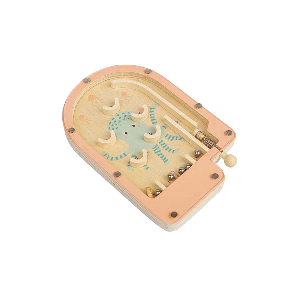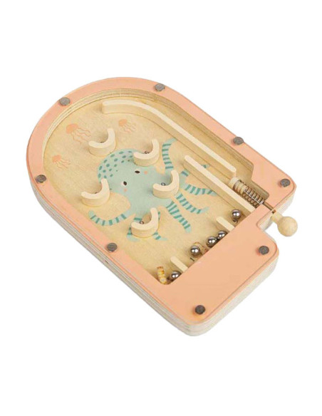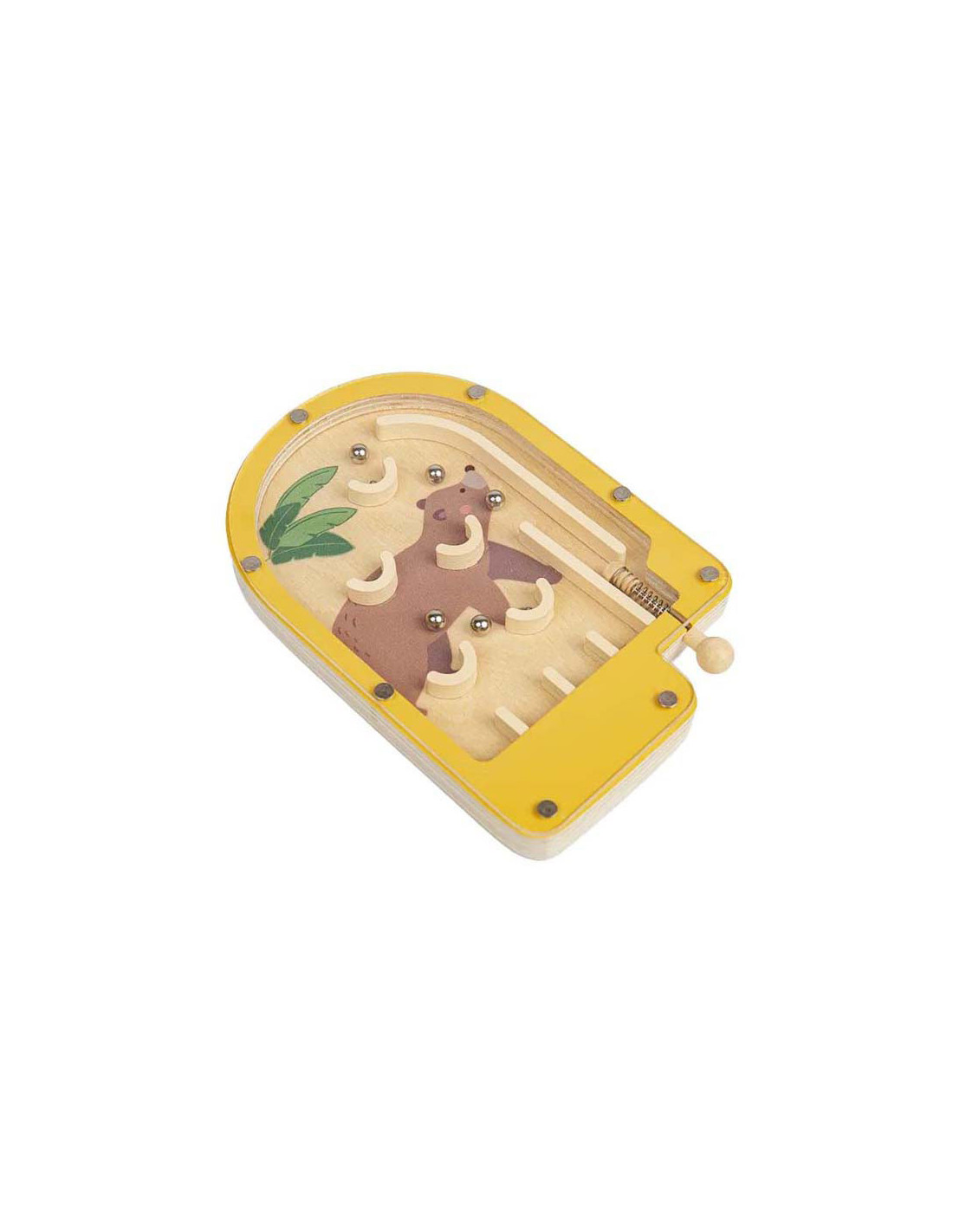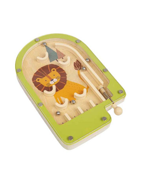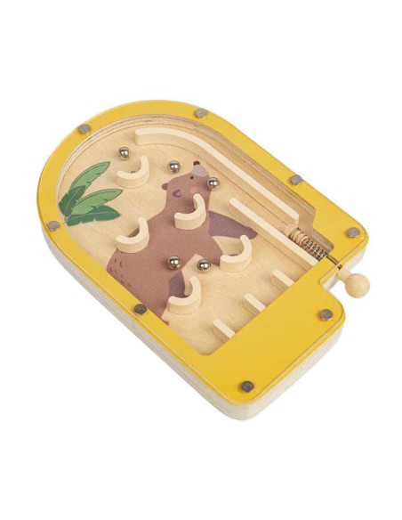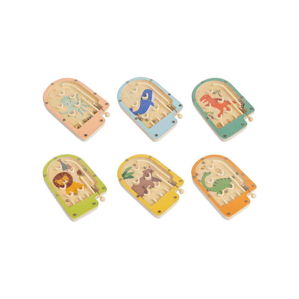 Een klassiek arcadespel in miniatuur formaat! Dit houten pinball spel is bedrukt met een schattig dier en zachte kleuren. Trek de pin terug om de ballen in het spel te lanceren en draai vervolgens het bord om ze door de obstakels te leiden om de doelen onderaan te bereiken. Het spel helpt jonge kinderen met het ontwikkelen van hun reflexen, hand-oogcoördinatie, fijne motoriek én strategisch denken!