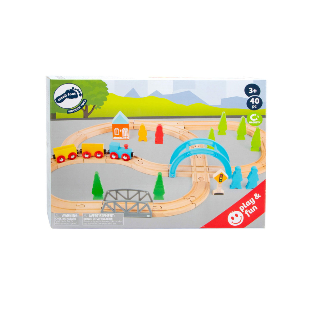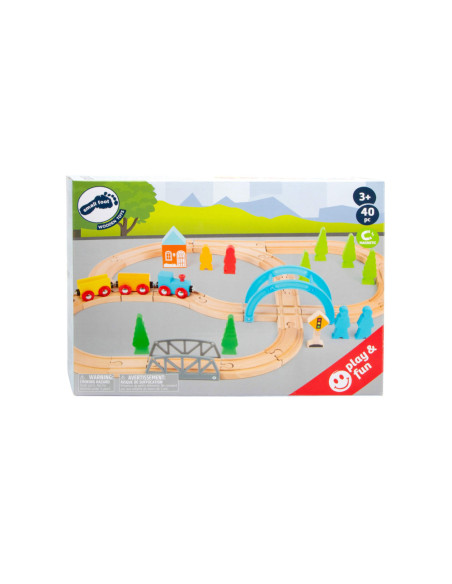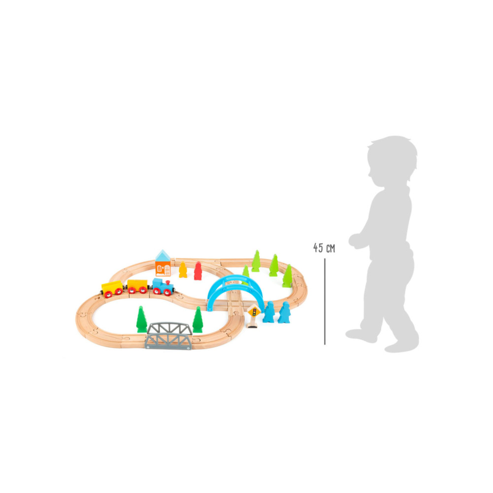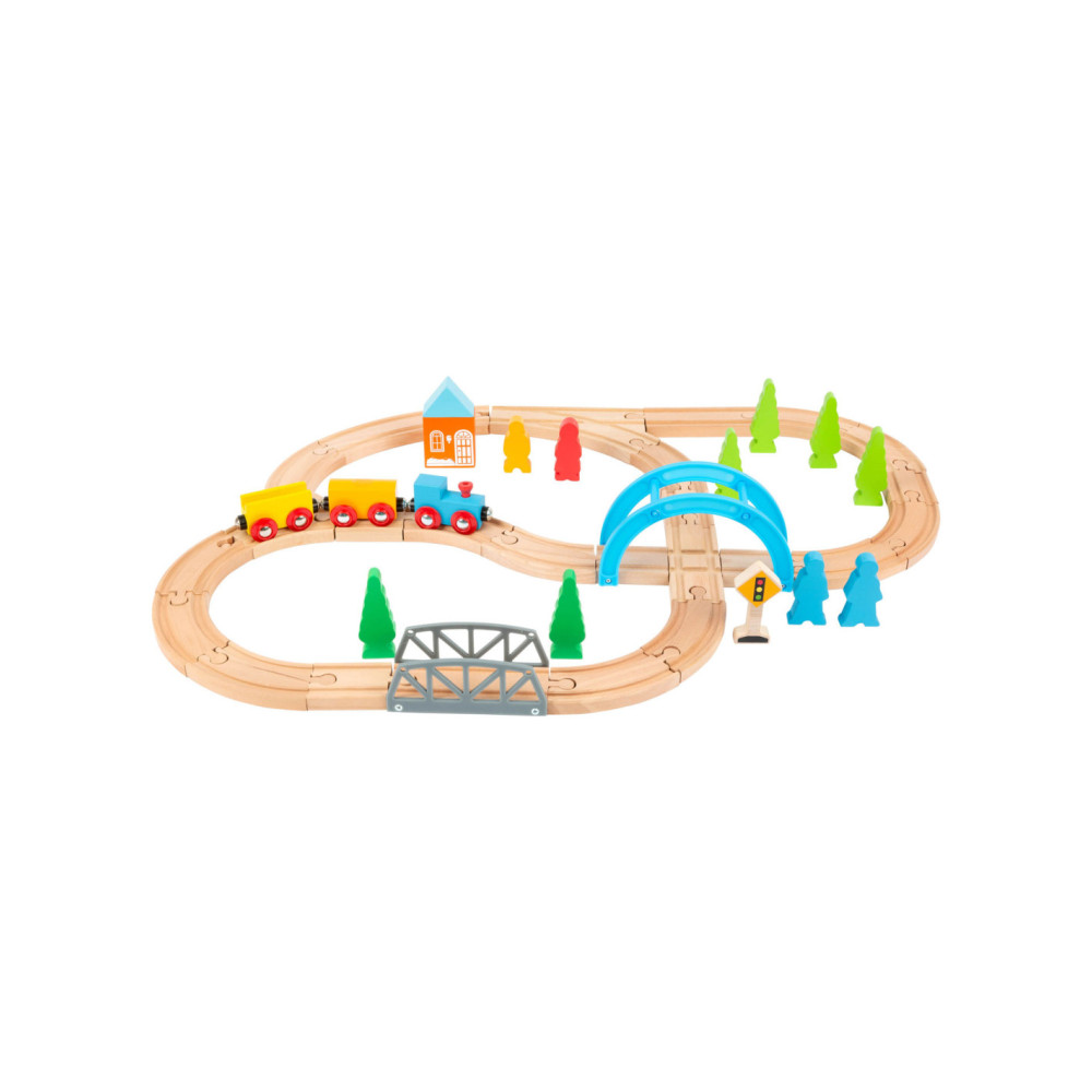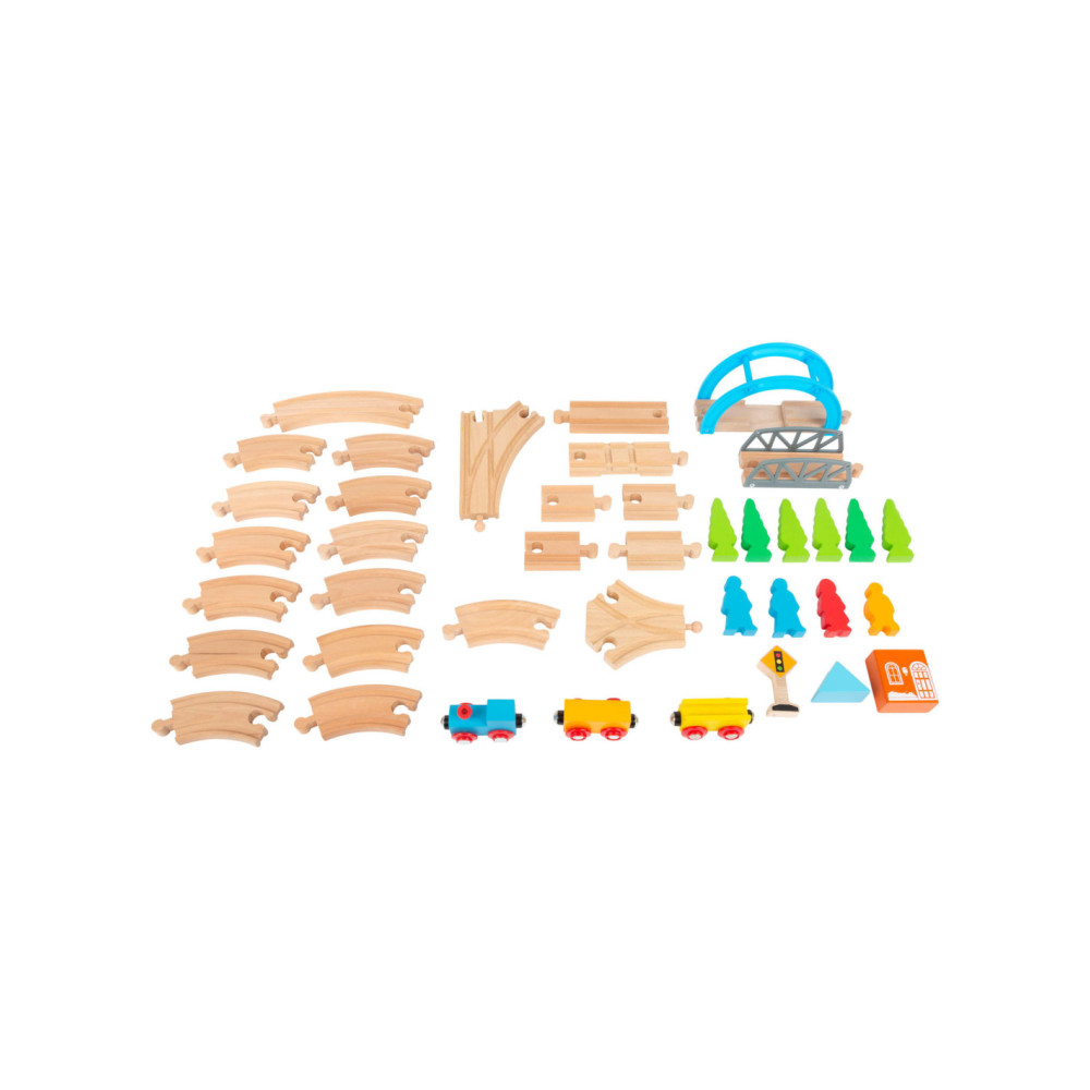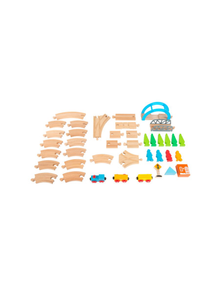 Een speelgoedtreinwereld voor jonge ontdekkingsreizigers! Met deze houten speelgoedtreinset inclusief uitgebreide set accessoires komen de jonge spoorwegbeambten zeker aan hun trekken. Deze spoorlijn strekt zich uit over bruggen en door valleien, en baant voortdurend nieuwe wegen met de verschillende treinbaanknooppunten. De houten rails zijn compatibel met alle andere grote speelgoedtreinsystemen. Dit creatieve speelplezier hoort thuis in elke kinderkamer.