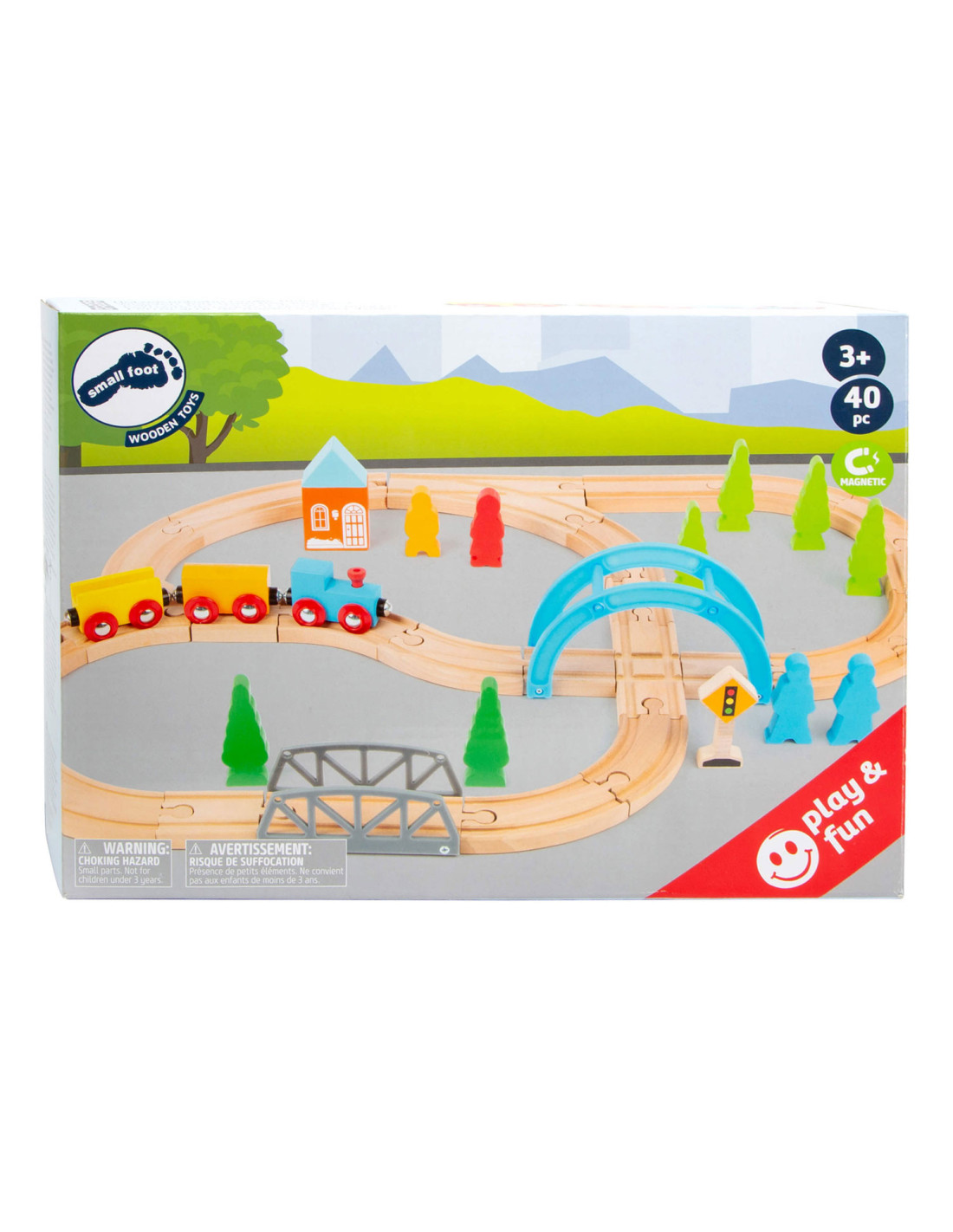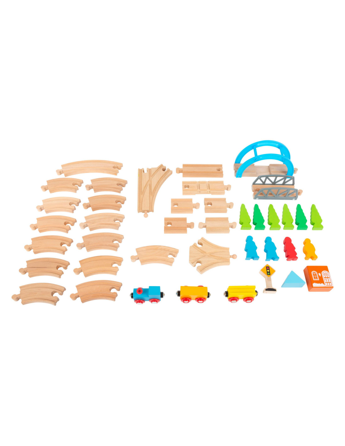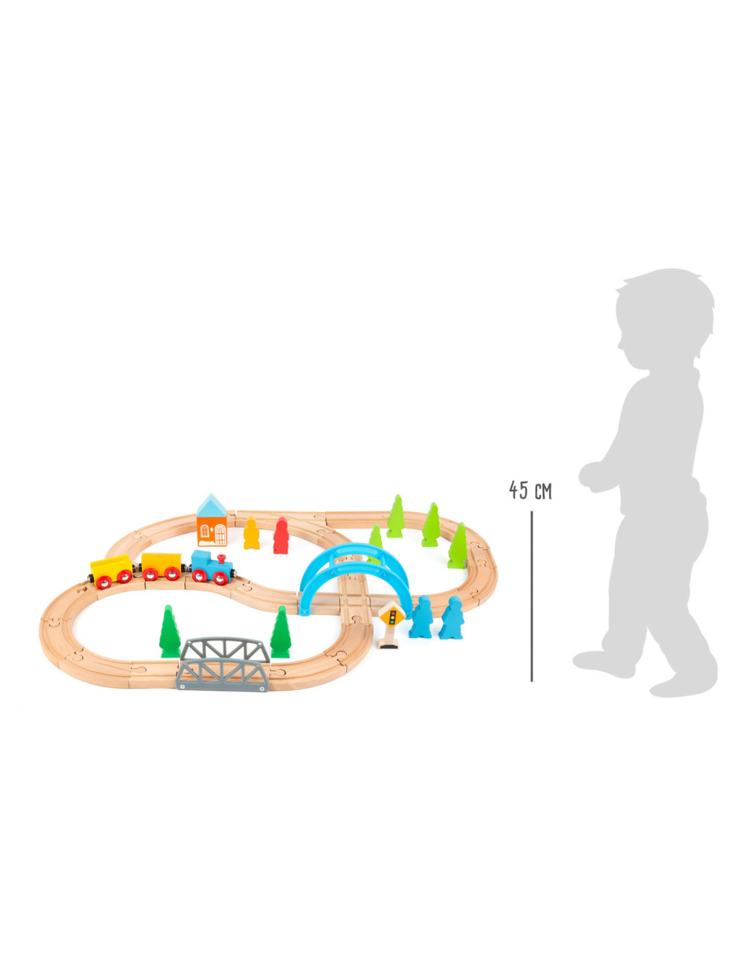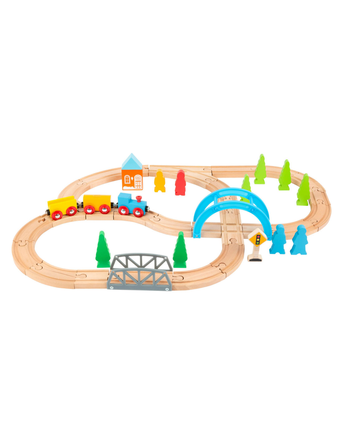 Een speelgoedtreinwereld voor jonge ontdekkingsreizigers! Met deze houten speelgoedtreinset inclusief uitgebreide set accessoires komen de jonge spoorwegbeambten zeker aan hun trekken. Deze spoorlijn strekt zich uit over bruggen en door valleien, en baant voortdurend nieuwe wegen met de verschillende treinbaanknooppunten. De houten rails zijn compatibel met alle andere grote speelgoedtreinsystemen. Dit creatieve speelplezier hoort thuis in elke kinderkamer.