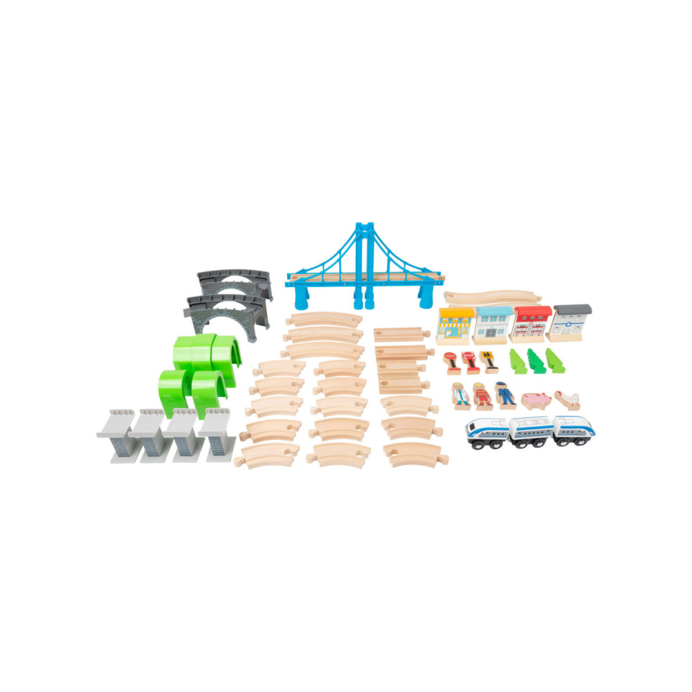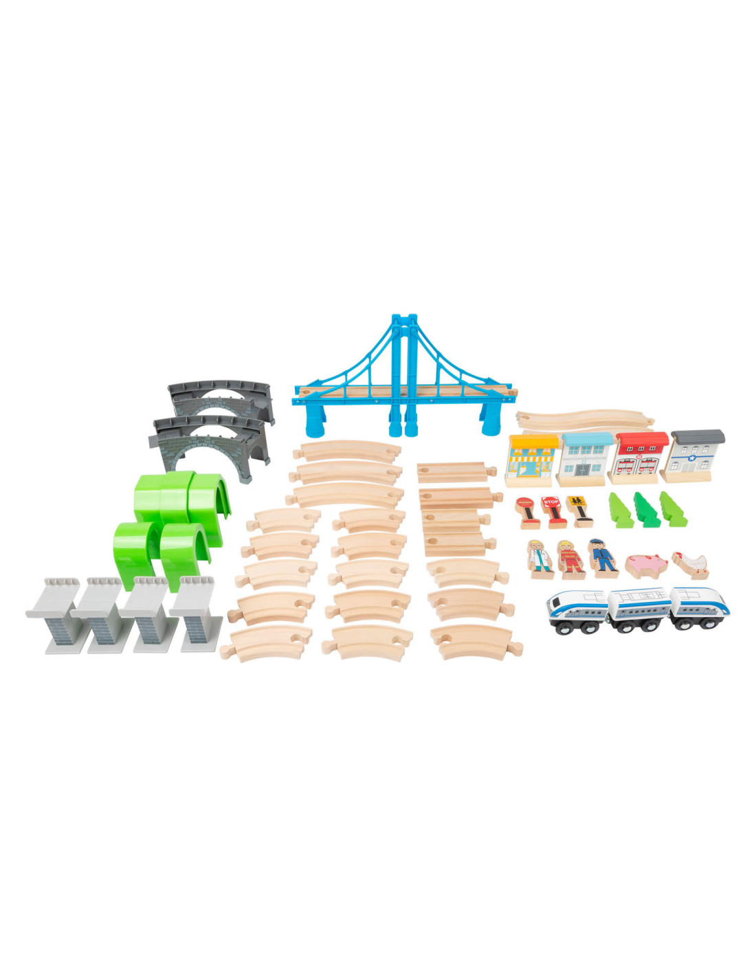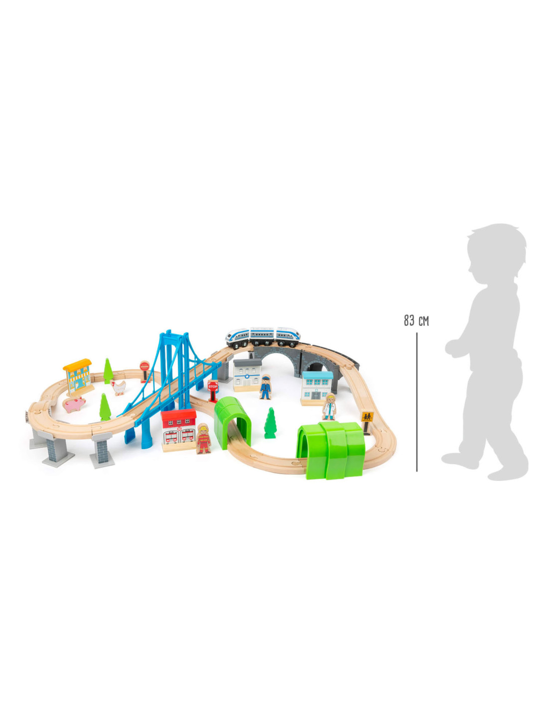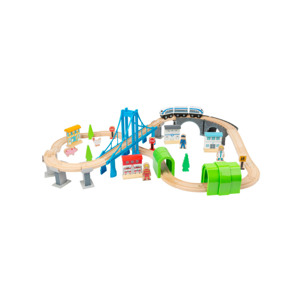 Een reis door de grote, brede speelgoedtreinwereld! Met deze houten speelgoedtreinset in XL-formaat duiken kinderen in een adembenemende miniatuurwereld. Hier rijdt de speelgoedsneltrein over een hangbrug en gaat onderweg door twee tunnels. Jonge machinisten kunnen samen met hun speelgoedtreincollega's veel speelplezier beleven! Een geweldig rollenspelspeelgoed dat de kinderkamer in een oogwenk verandert in een enorme speelgoedtreinwereld.