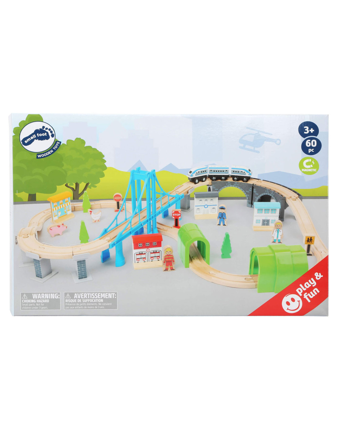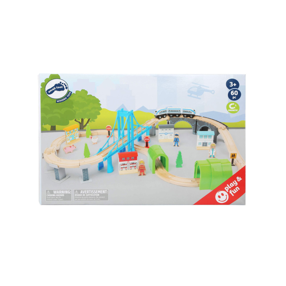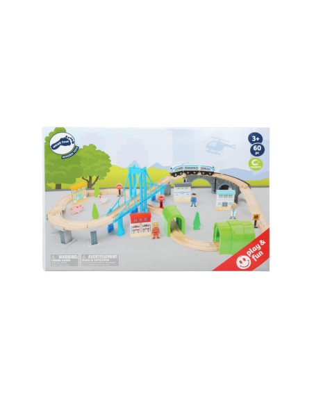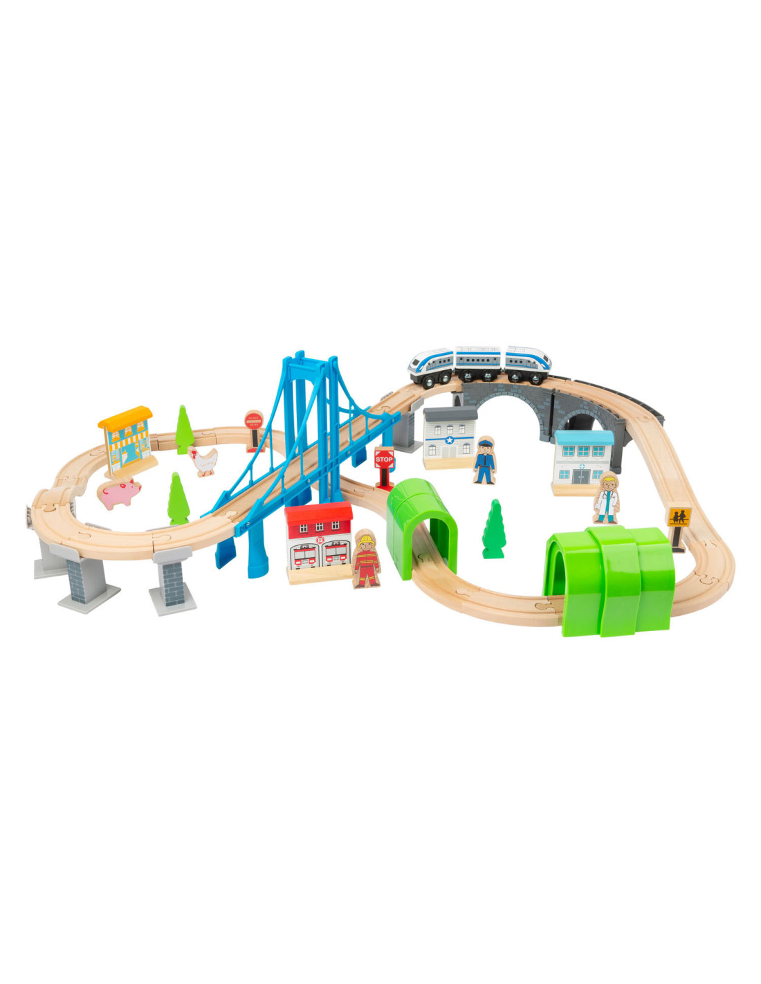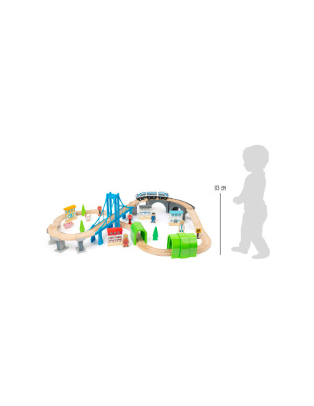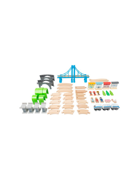 Een reis door de grote, brede speelgoedtreinwereld! Met deze houten speelgoedtreinset in XL-formaat duiken kinderen in een adembenemende miniatuurwereld. Hier rijdt de speelgoedsneltrein over een hangbrug en gaat onderweg door twee tunnels. Jonge machinisten kunnen samen met hun speelgoedtreincollega's veel speelplezier beleven! Een geweldig rollenspelspeelgoed dat de kinderkamer in een oogwenk verandert in een enorme speelgoedtreinwereld.