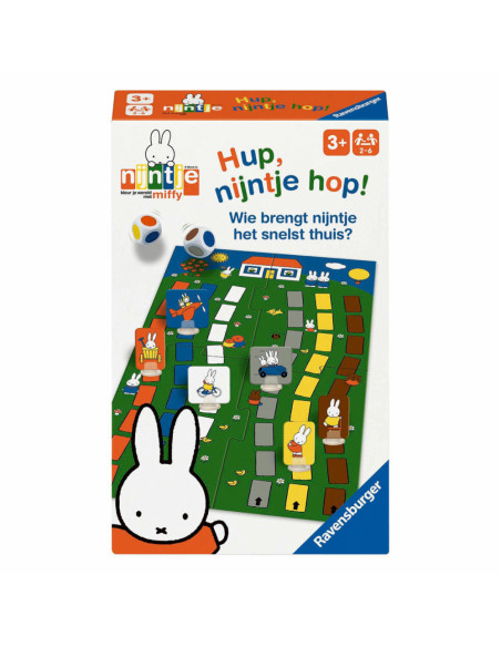 Telkens wanneer de kleurendobbelstenen rollen, klinkt het 'hup, nijntje hop'! Want nijntje wil zo graag zo snel mogelijk naar huis toe. Dat kan op verschillende manieren.. met de auto, het vliegtuig, met de fiets of is de step toch sneller?