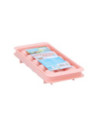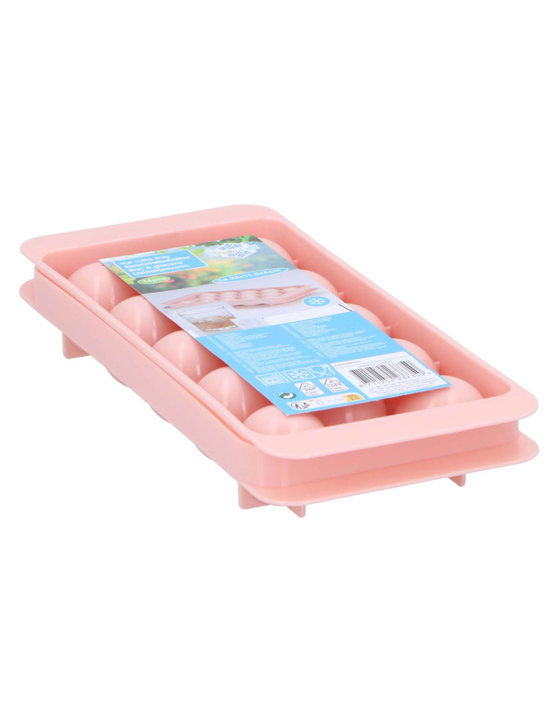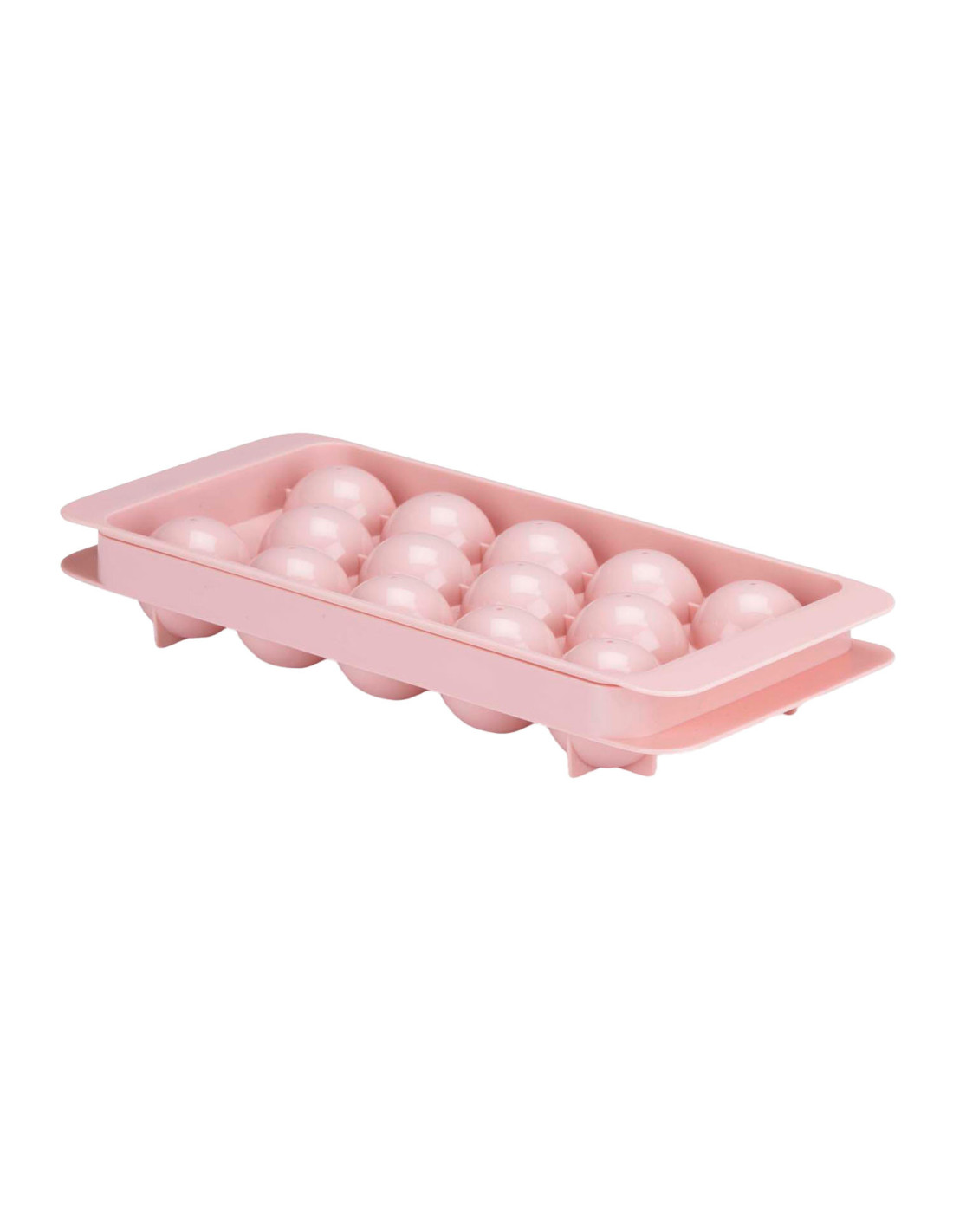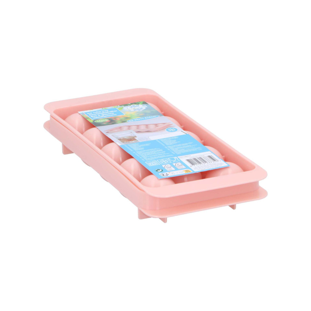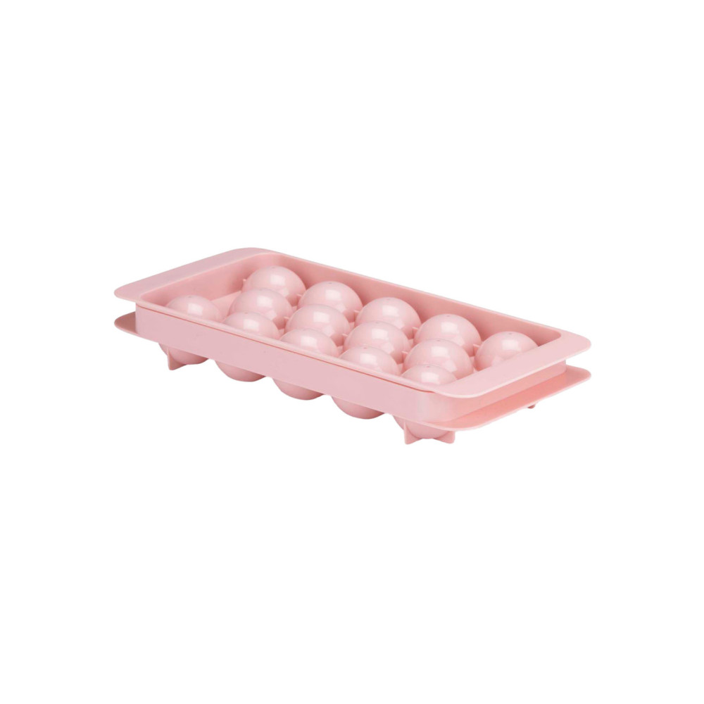 Roze ijsblokjesvorm met deksel voor het maken van 14 ronde ijsklontjes. Afmetingen: 25,5 x 4 x 11,5 centimeter.