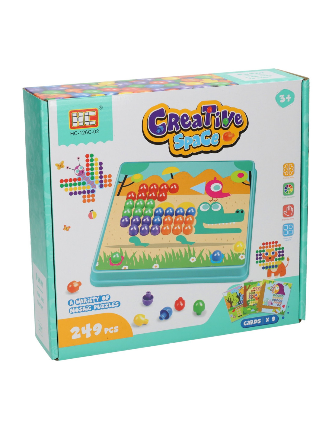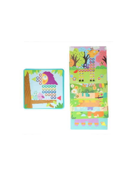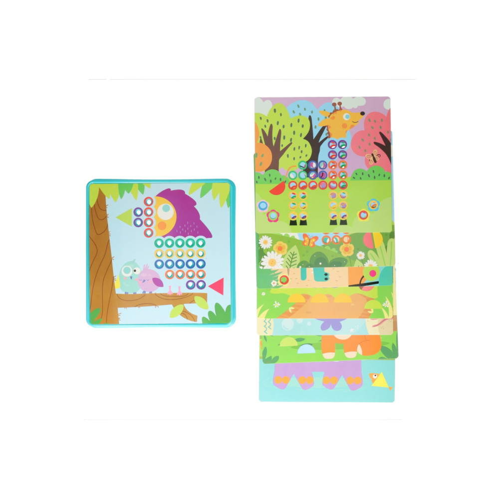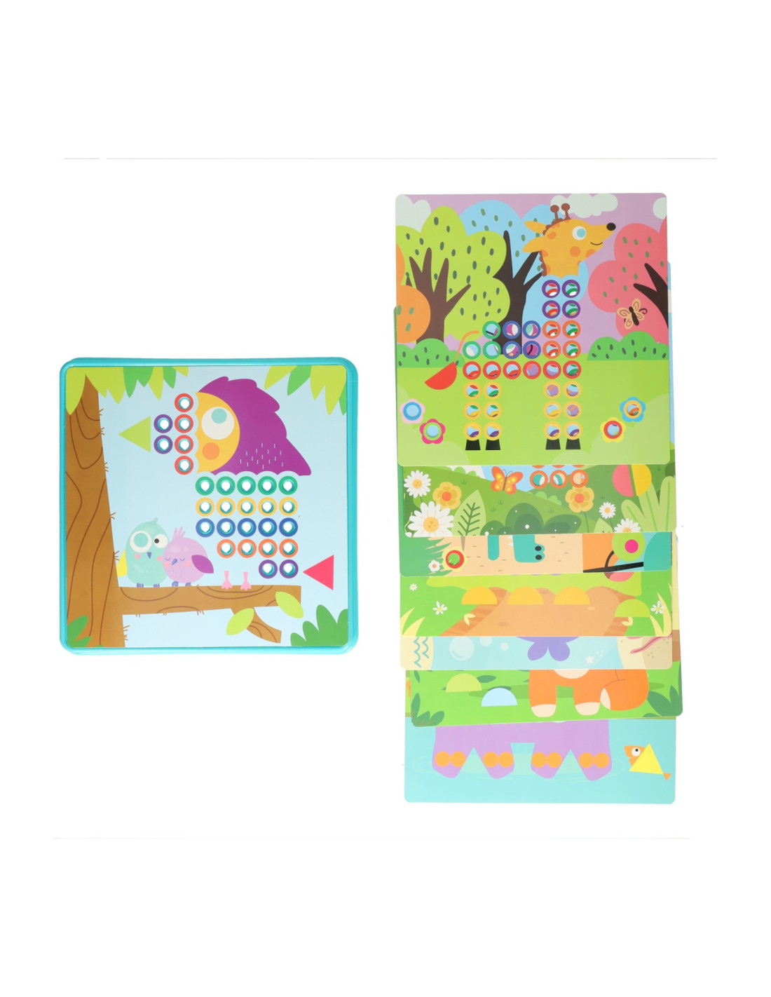 Insteekmozaïek set met 249 gekleurde buttons en 8 kaarten met afbeeldingen van dieren. Geschikt voor kinderen vanaf 3 jaar.