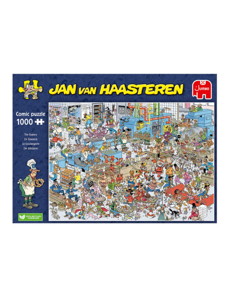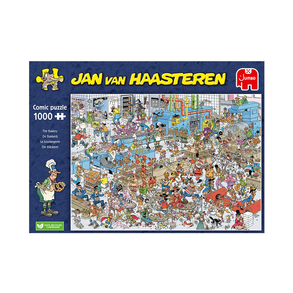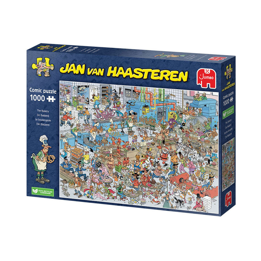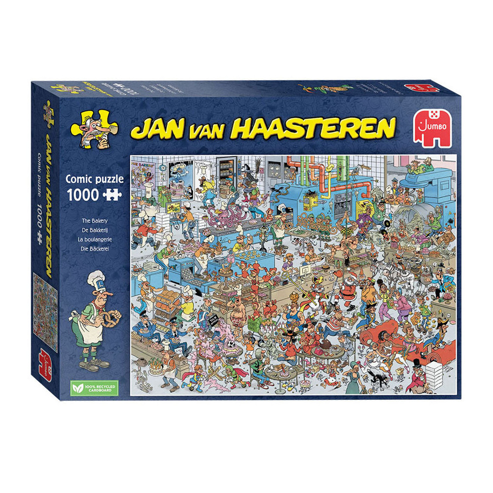 Brood, gebak en koekjes, allemaal specialiteiten van Jan van Haasteren's Bakkerij. Octo is een ware productiekampioen, en Jan heeft een wel heel slimme manier gevonden om spookkoekjes te maken. Terwijl Sinterklaas en de Kerstman niet op hun beurt kunnen wachten. Deze specialiteiten moeten wel buitengewoon lekker zijn!Een Jan van Haasteren puzzel is meer dan een gewone legpuzzel: het is een avonturenserie, met vertrouwde hoofdrolspelers in een eindeloos decor vol absurde details. Ontdek alle doldwaze avonturen van de Jan van Haasteren-familie!We zijn trots dat onze puzzels zijn gemaakt van gerecycled karton in Europa. Om het karton in puzzelstukjes te snijden, gebruiken we het dunste mes dat er is. De puzzel ziet er bijna naadloos uit als hij klaar is. Geniet van deze Jan van Haasteren-puzzel!