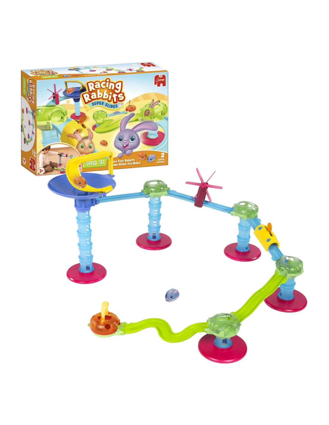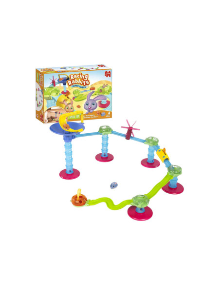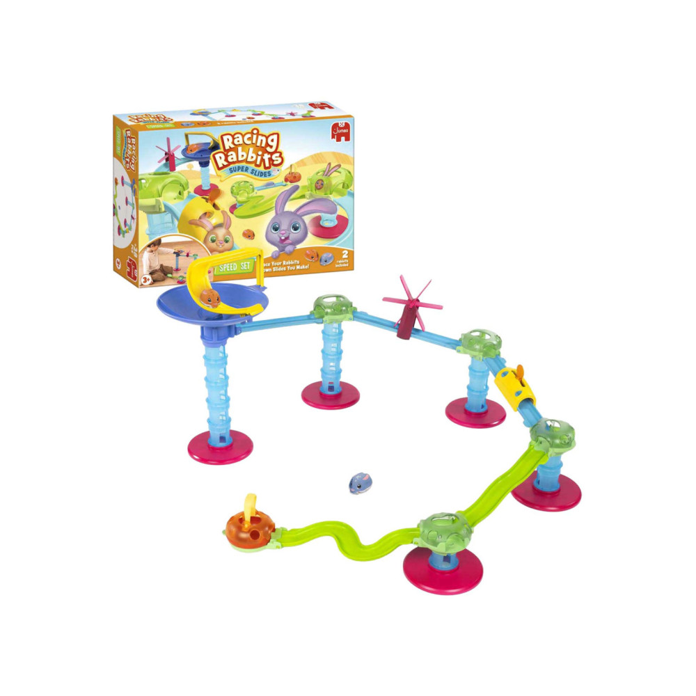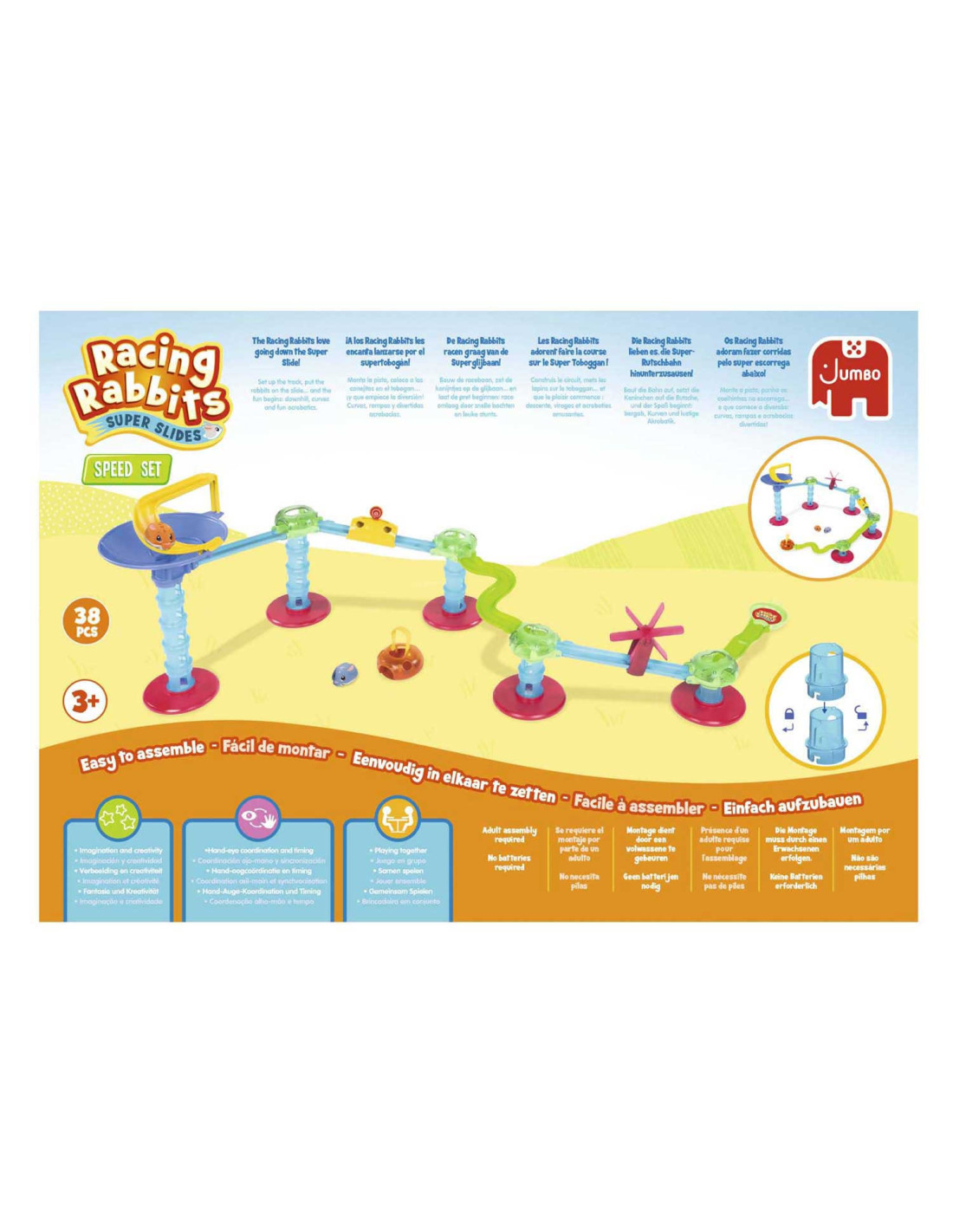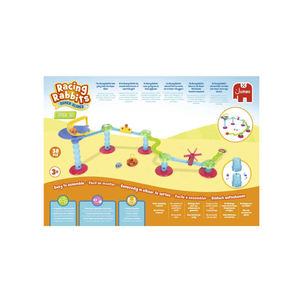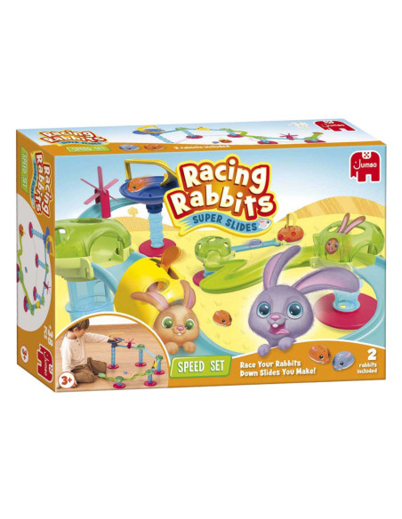 Ontdek de spannende wereld van Racing Rabbits, de modulaire baansets waarmee je unieke ontwerpen kunt maken met gemakkelijk te gebruiken stukken. Bouw de glijbaan van de Speed - set en laat de konijnen er doorheen racen! Plaats een van de 2 schattige konijnen bovenop de trechter en kijk toe terwijl het naar beneden glijdt! Speel met de stunts die het konijn onderweg tegenkomt, want alleen dan zal het konijn het einde van de baan bereiken. Je kan de baan samenvoegen met de Racing Rabbits Deluxe Set. Combineer beide racebanen en bouw een enorme glijbaan!