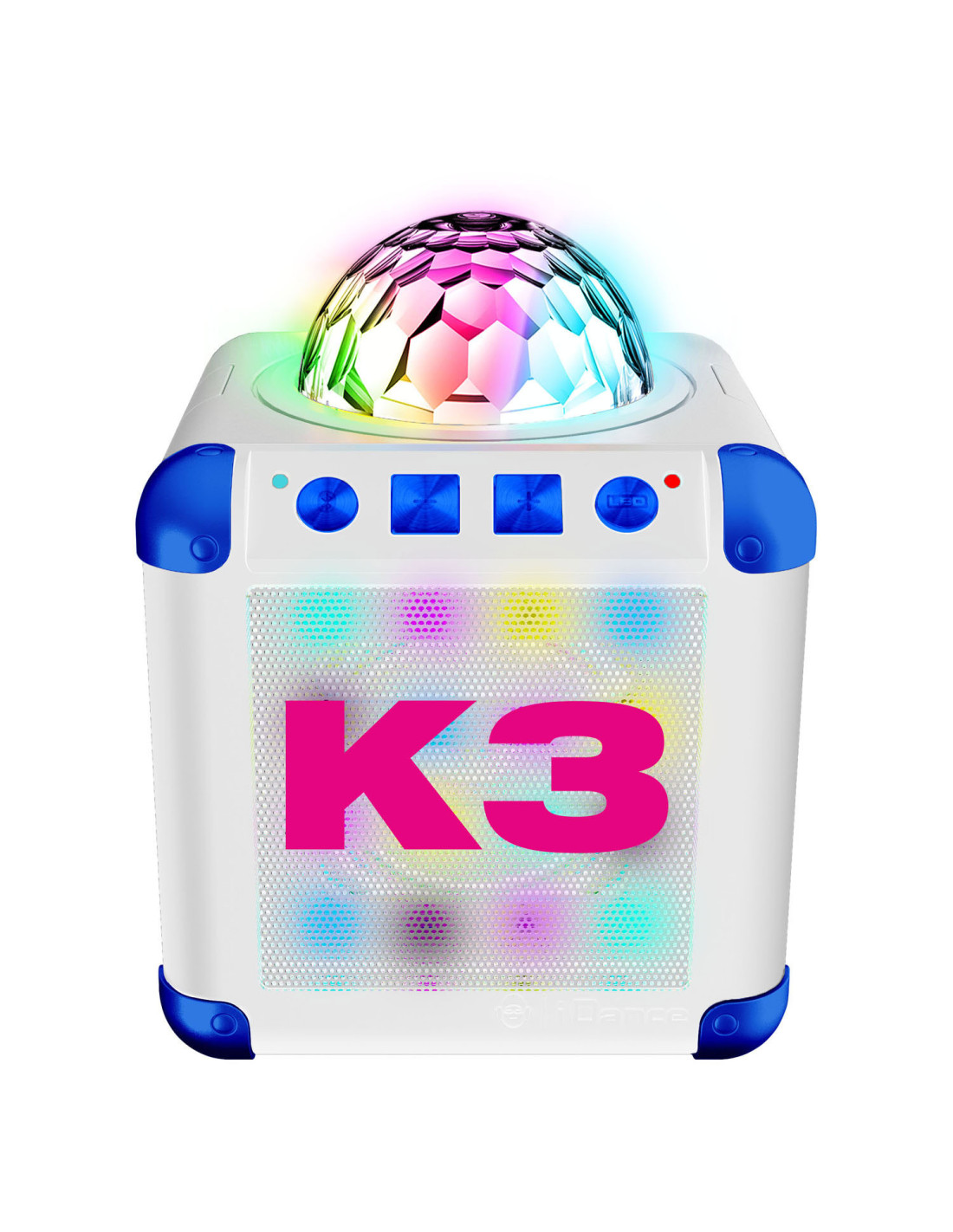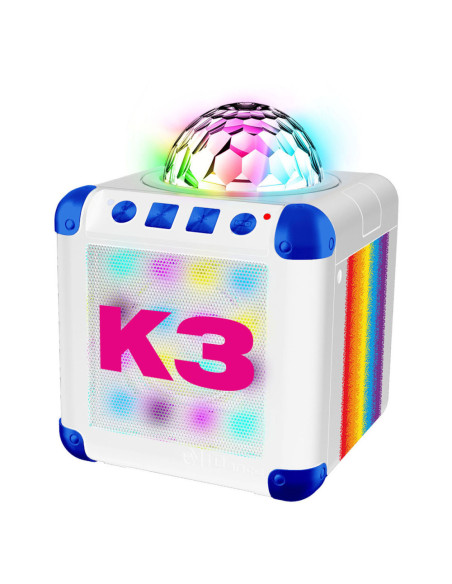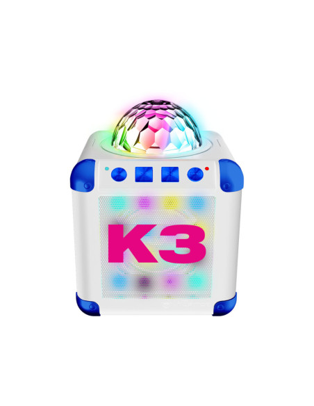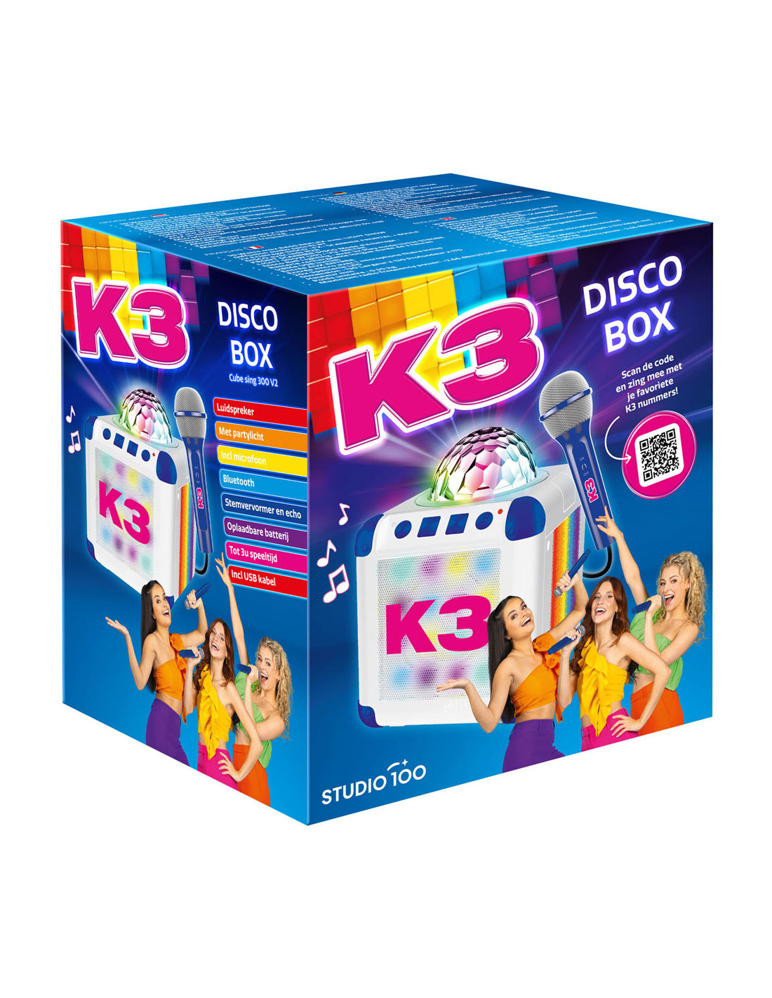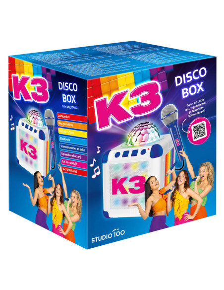 Het is elke dag feest met de K3 disco box! Laat je stem schijnen door de microfoon mét echofunctie en een stemvervormer die zorgen voor hilarische momenten. Het partylicht en de lichtshow geven elke ruimte een instant party vibe. Dankzij de bluetooth technologie kun je draadloos verbinding maken met je smartphone, tablet of ander Bluetooth apparaat. Scan de QR code op de verpakking of gebruiksaanwijzing en geniet van je favoriete K3 afspeellijst. Deze discobox is voorzien van een oplaadbare batterij en USB kabel.